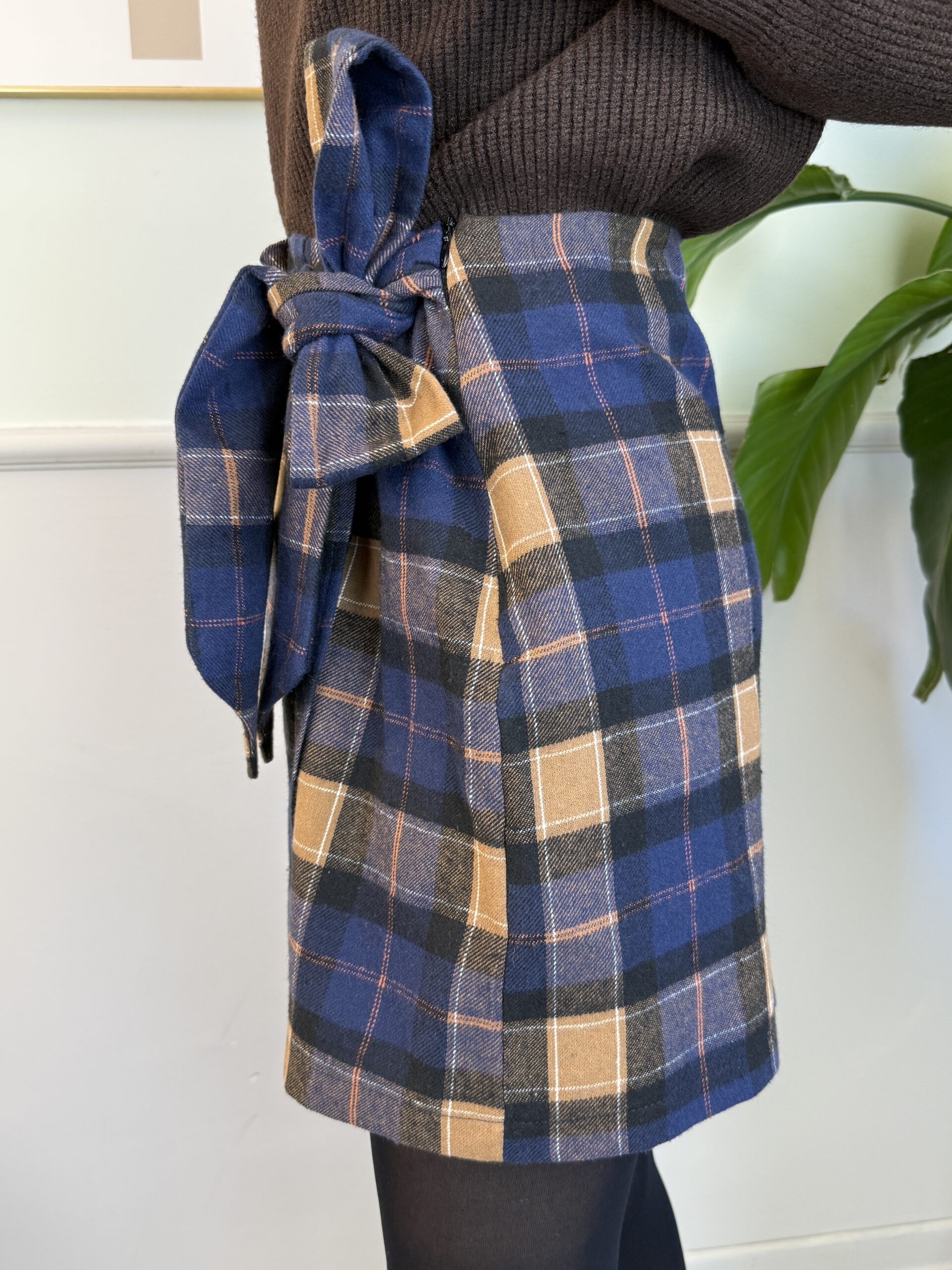 Mini gonna effetto pareo in flanella, parte davanti sovrapposta con fiocco laterale, chiusura con zip invisibile.