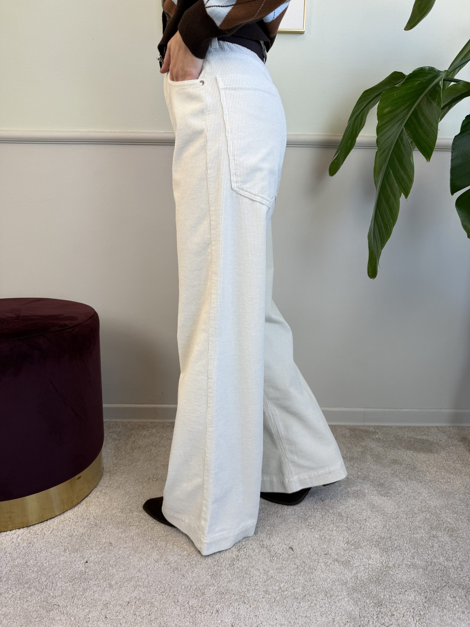 Pantaloni palazzo in velluto a coste panna con maxi pocket posteriori, vita alta.