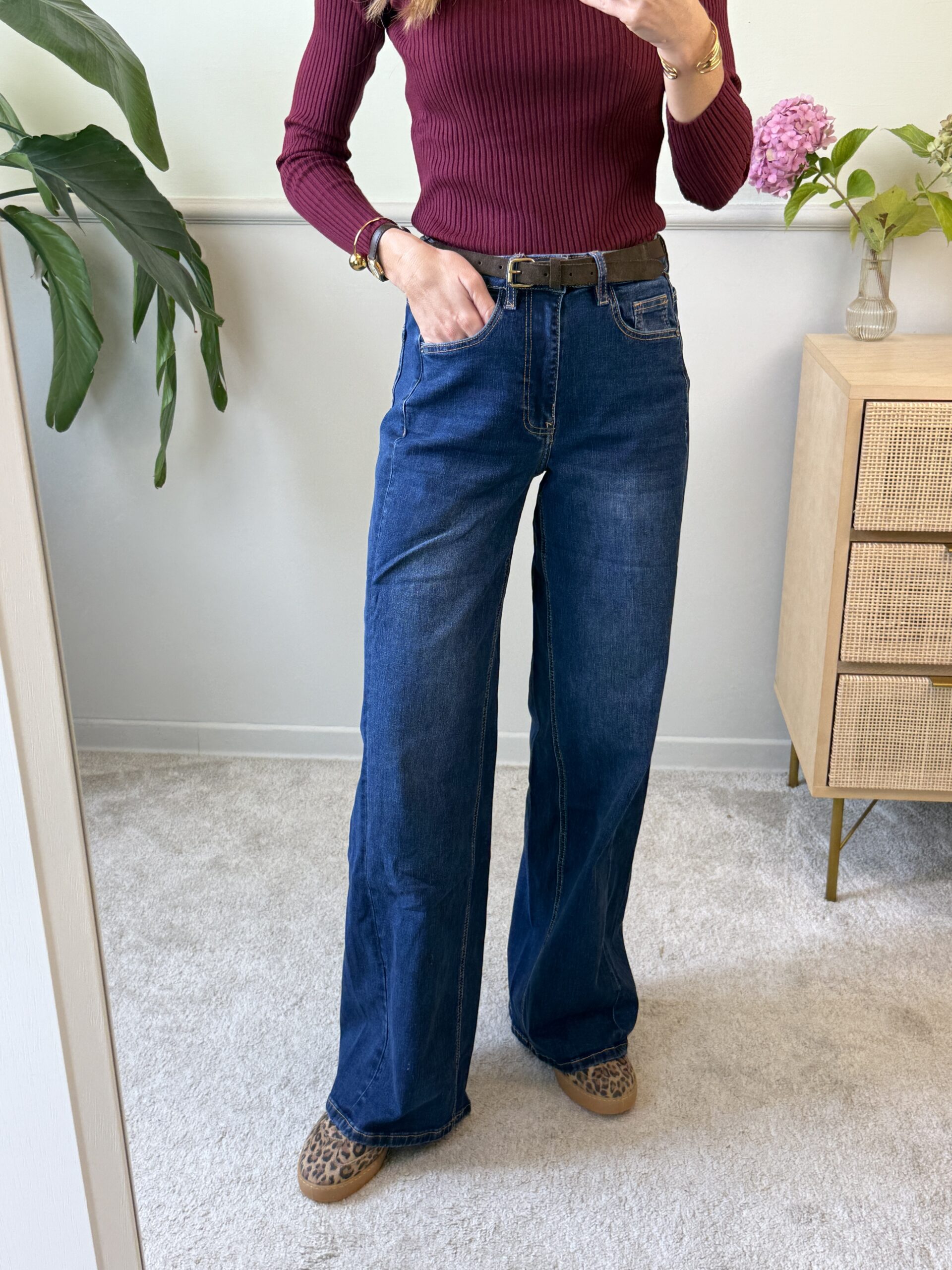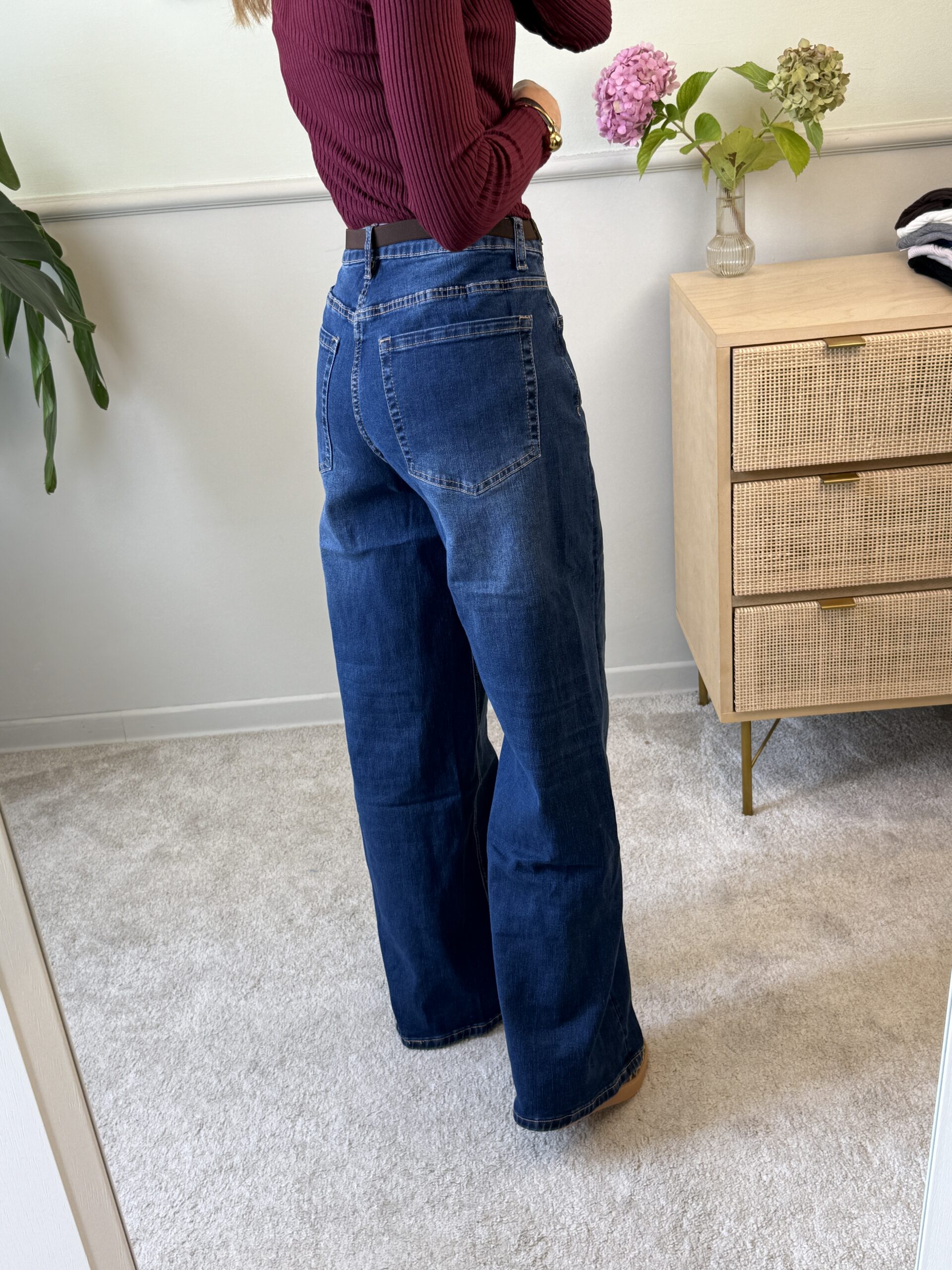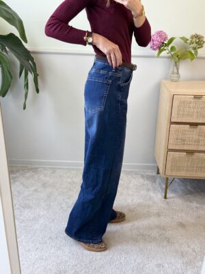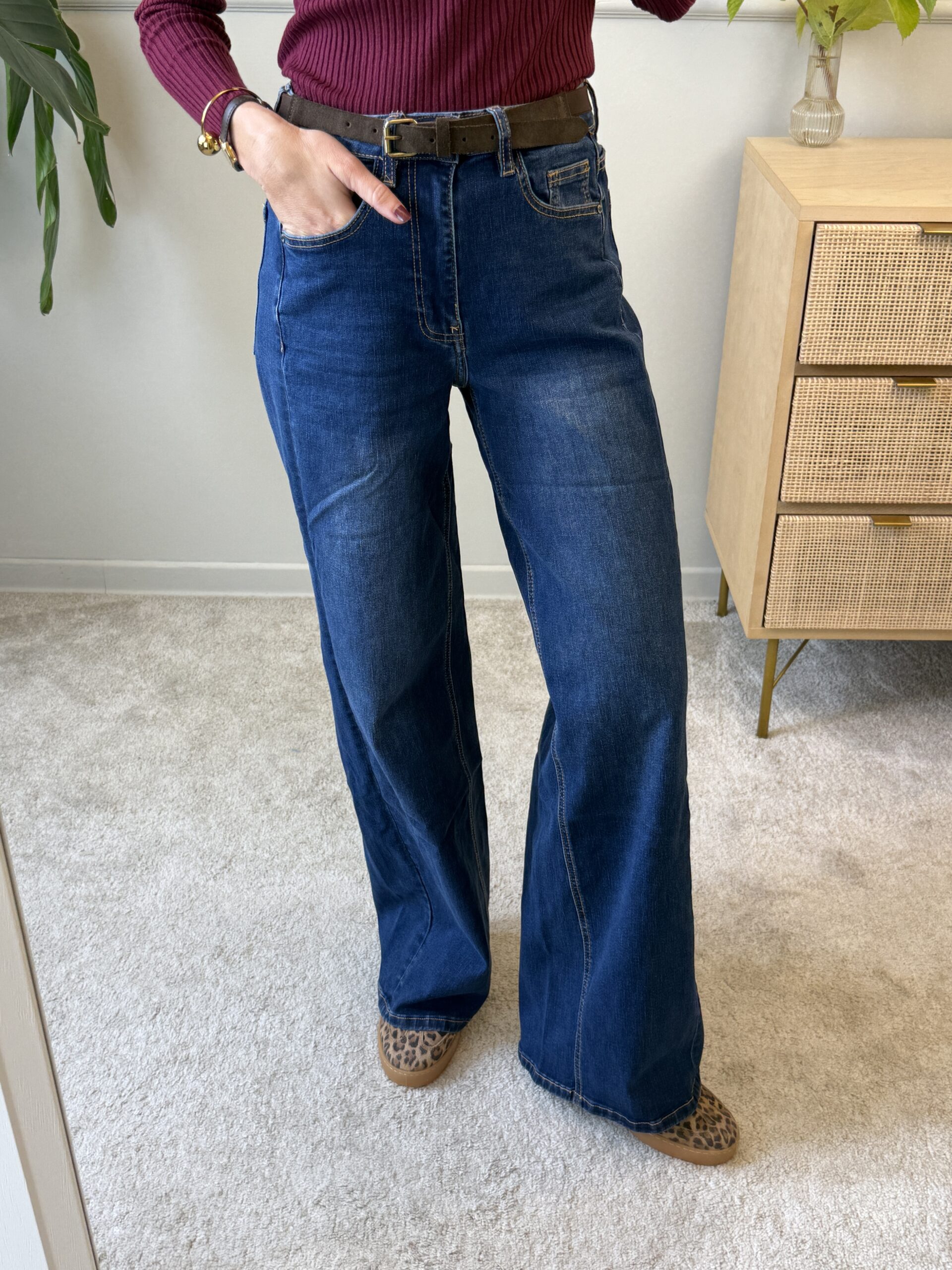 Jeans a palazzo elasticizzato morbido, vita media, cuciture sbieche, modello 5 tasche.