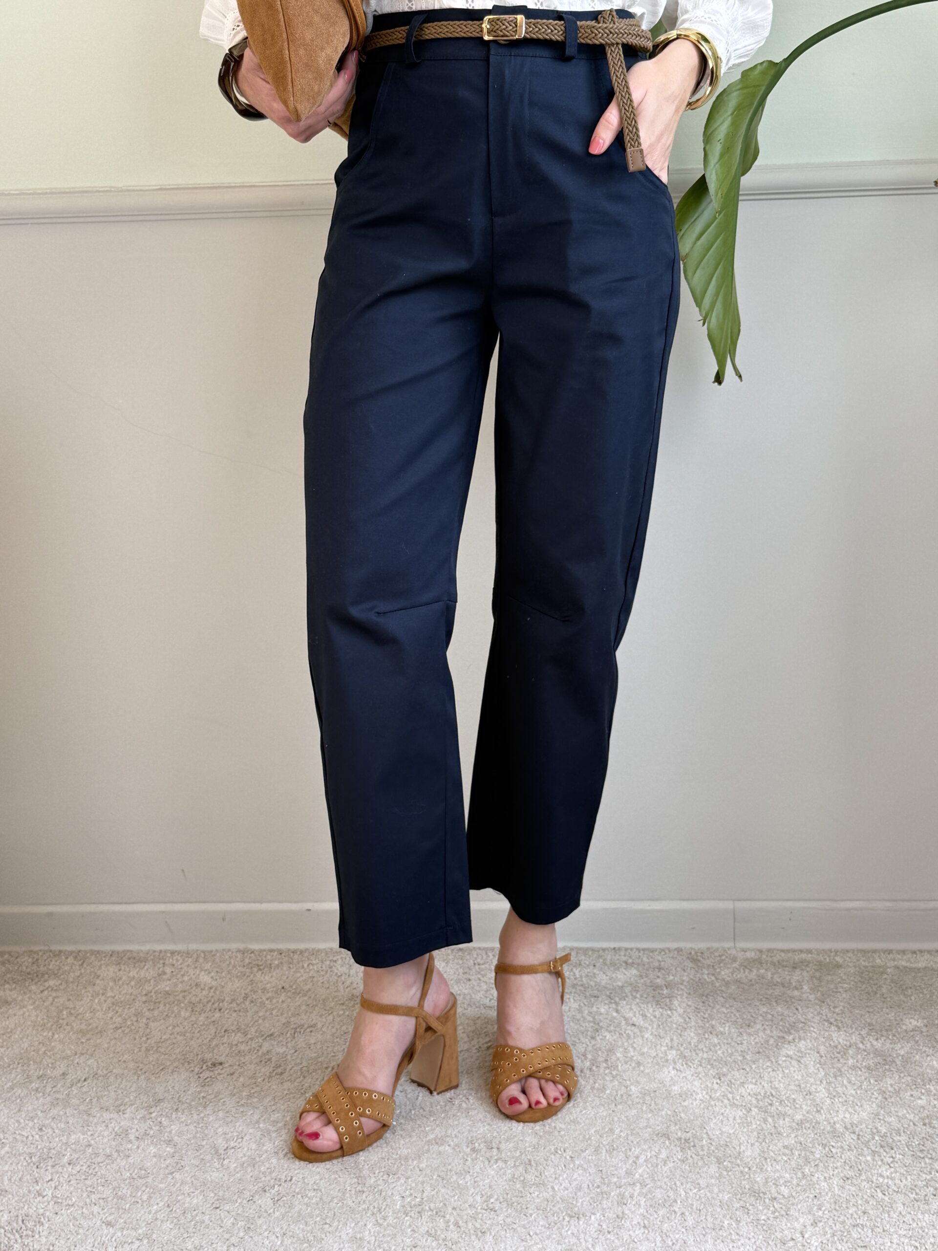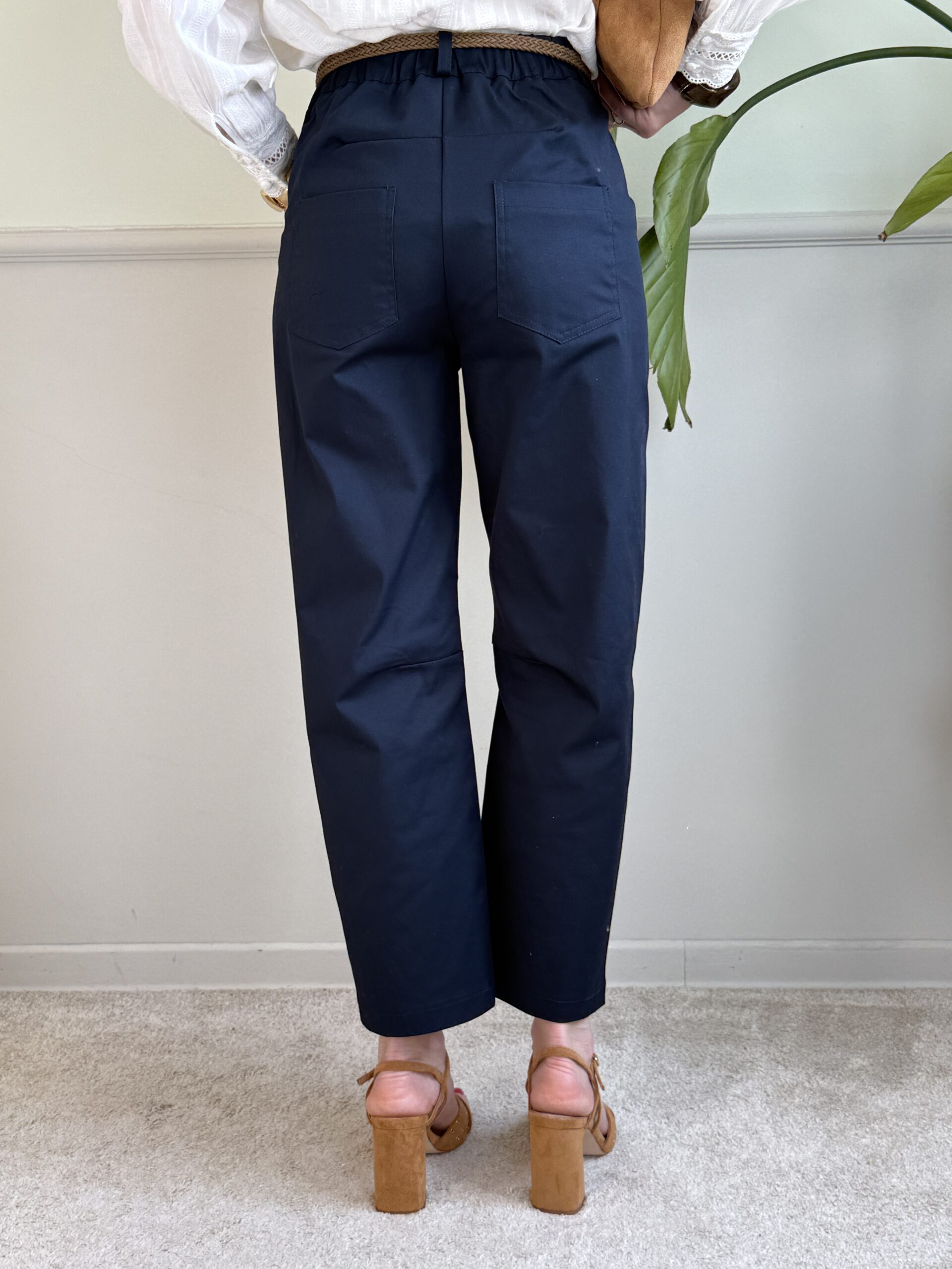 Pantalone barrel in popeline di cotone leggero con vita alta ed elastico posteriore.