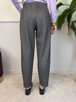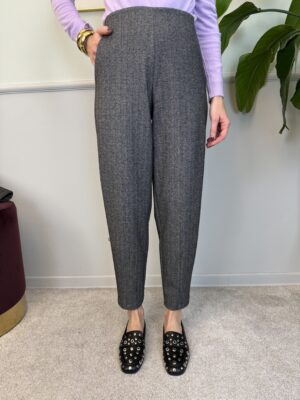 Pantalone a ovetto in tessuto spigato, vita alta con elastico posteriore, cavallo morbido, tasche alla francese, gamba morbida che si stringe alla caviglia.
