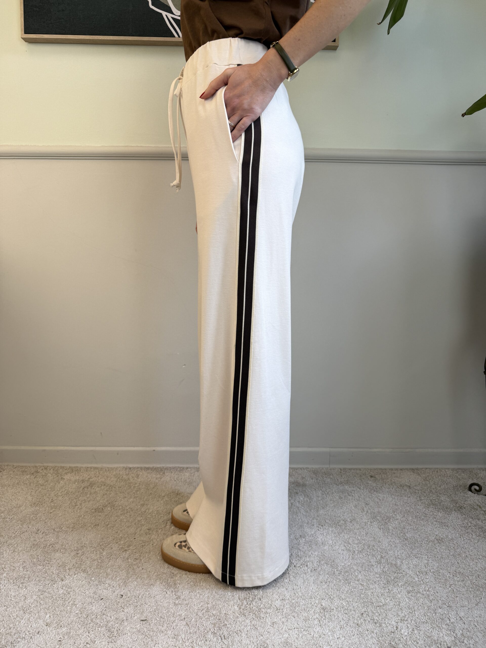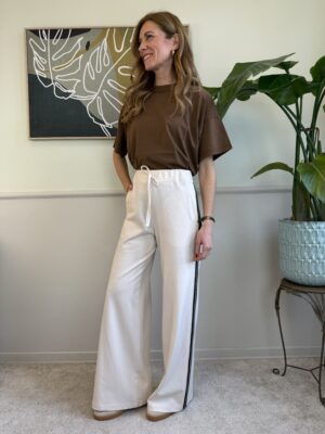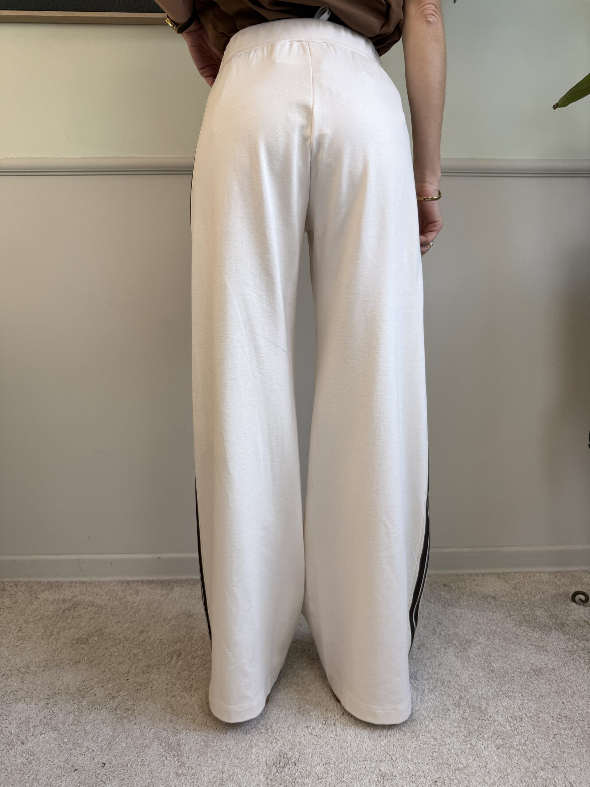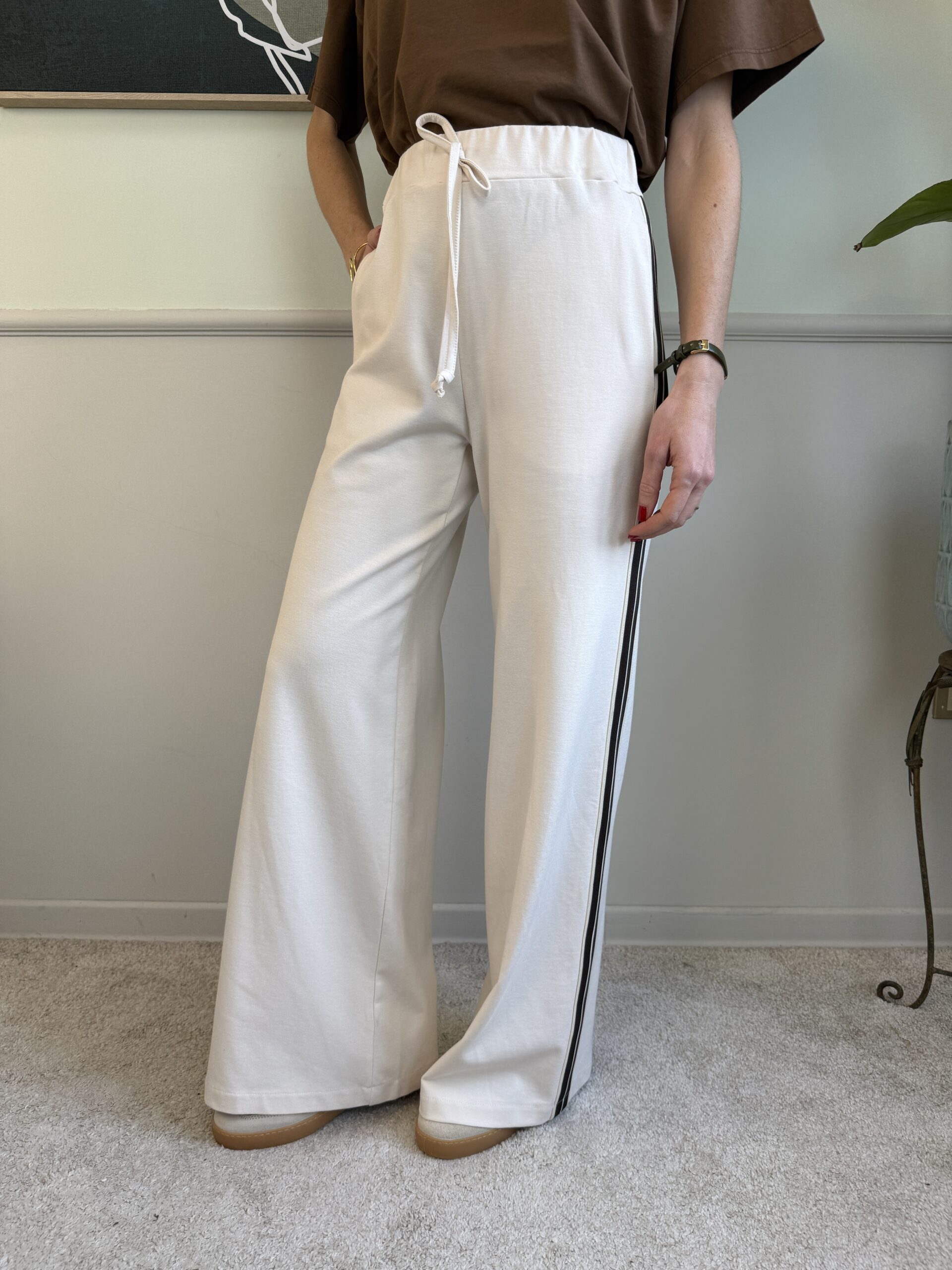 Pantalone a palazzo ampio leggermente svasato con doppia riga laterale. Vita alta con elastico e laccetti davanti, tasche laterali invisibili.