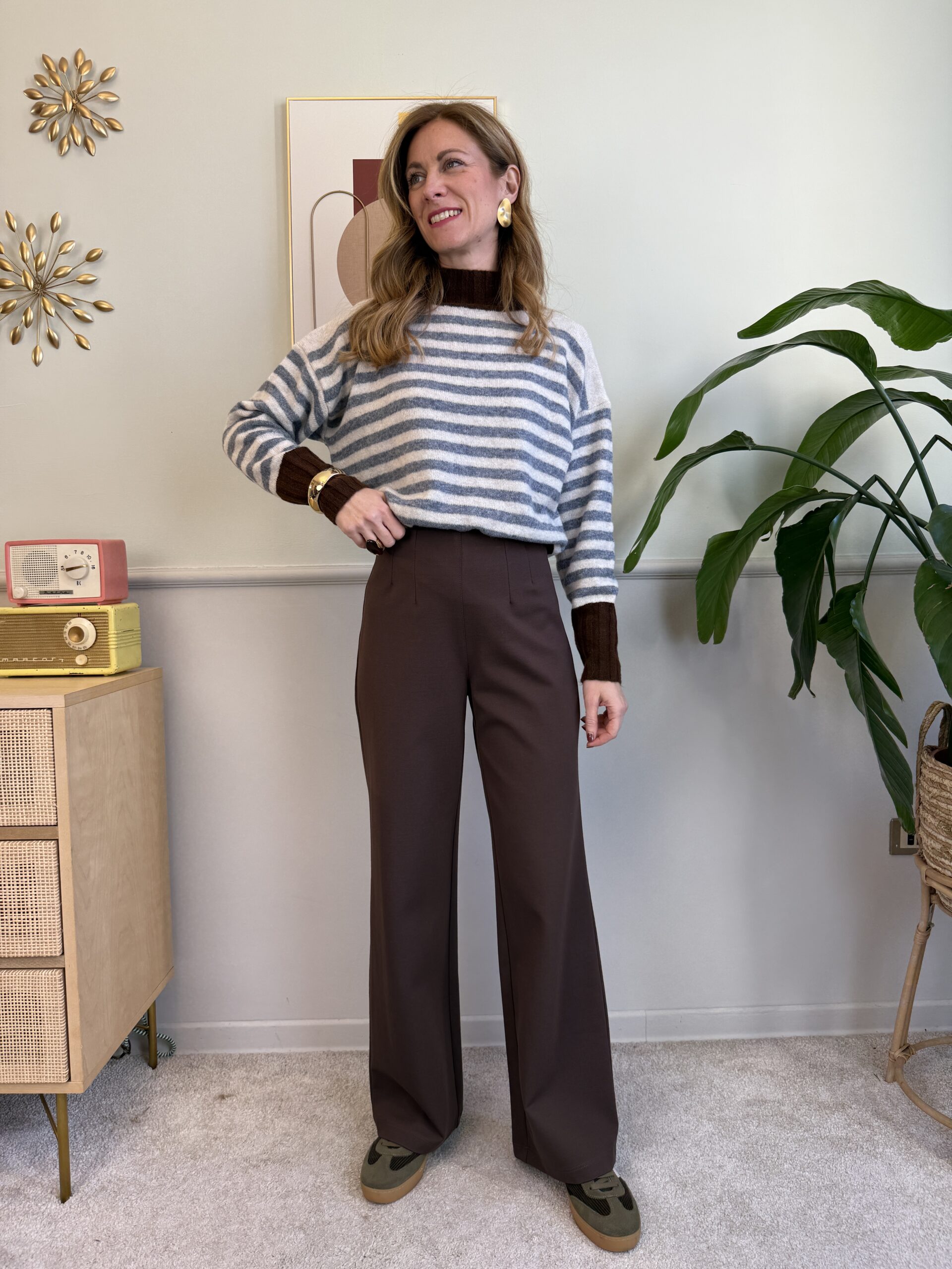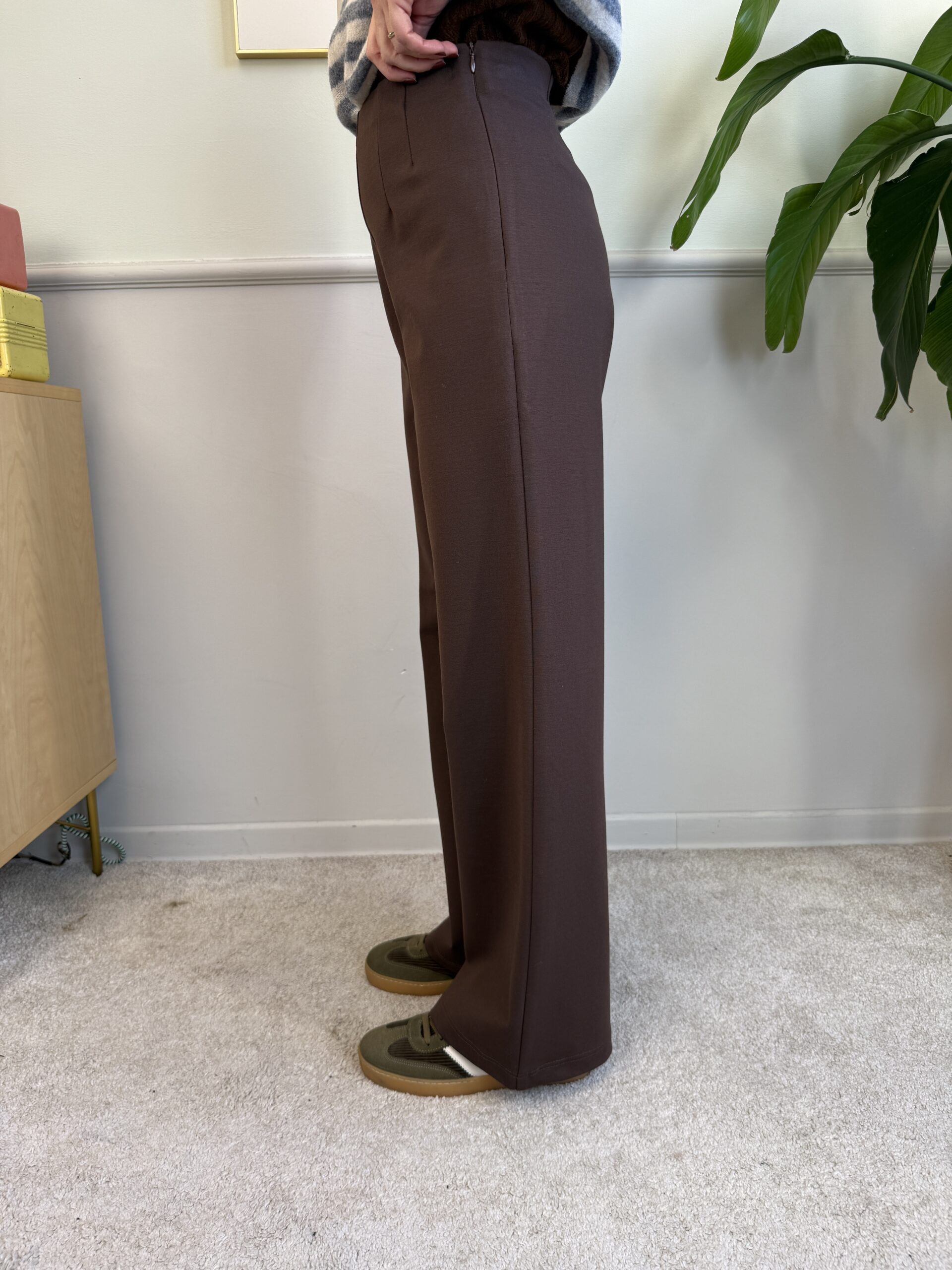 Panta palazzo in punto Milano a vita alta con elastico in vita e zip laterale invisibile.