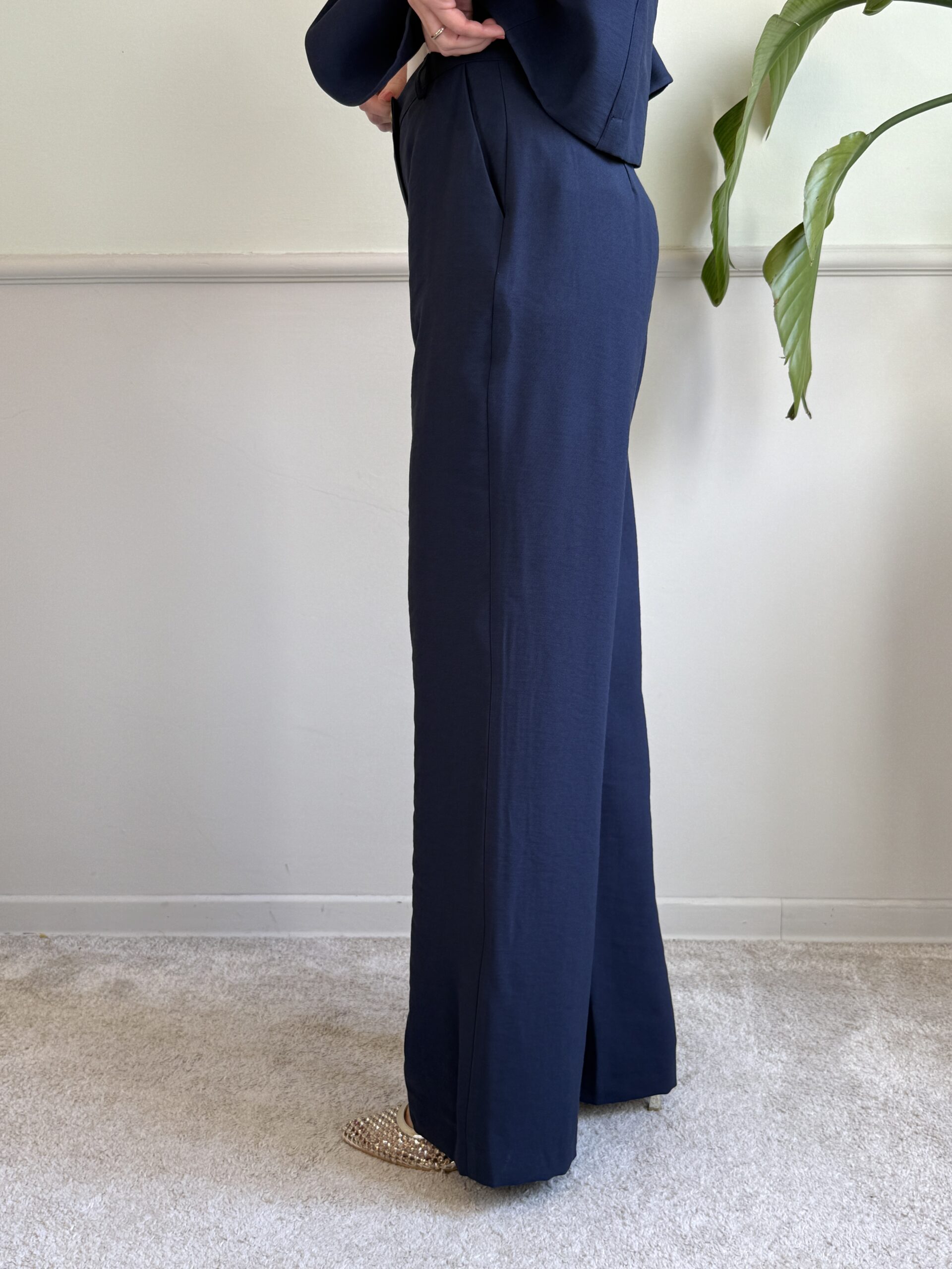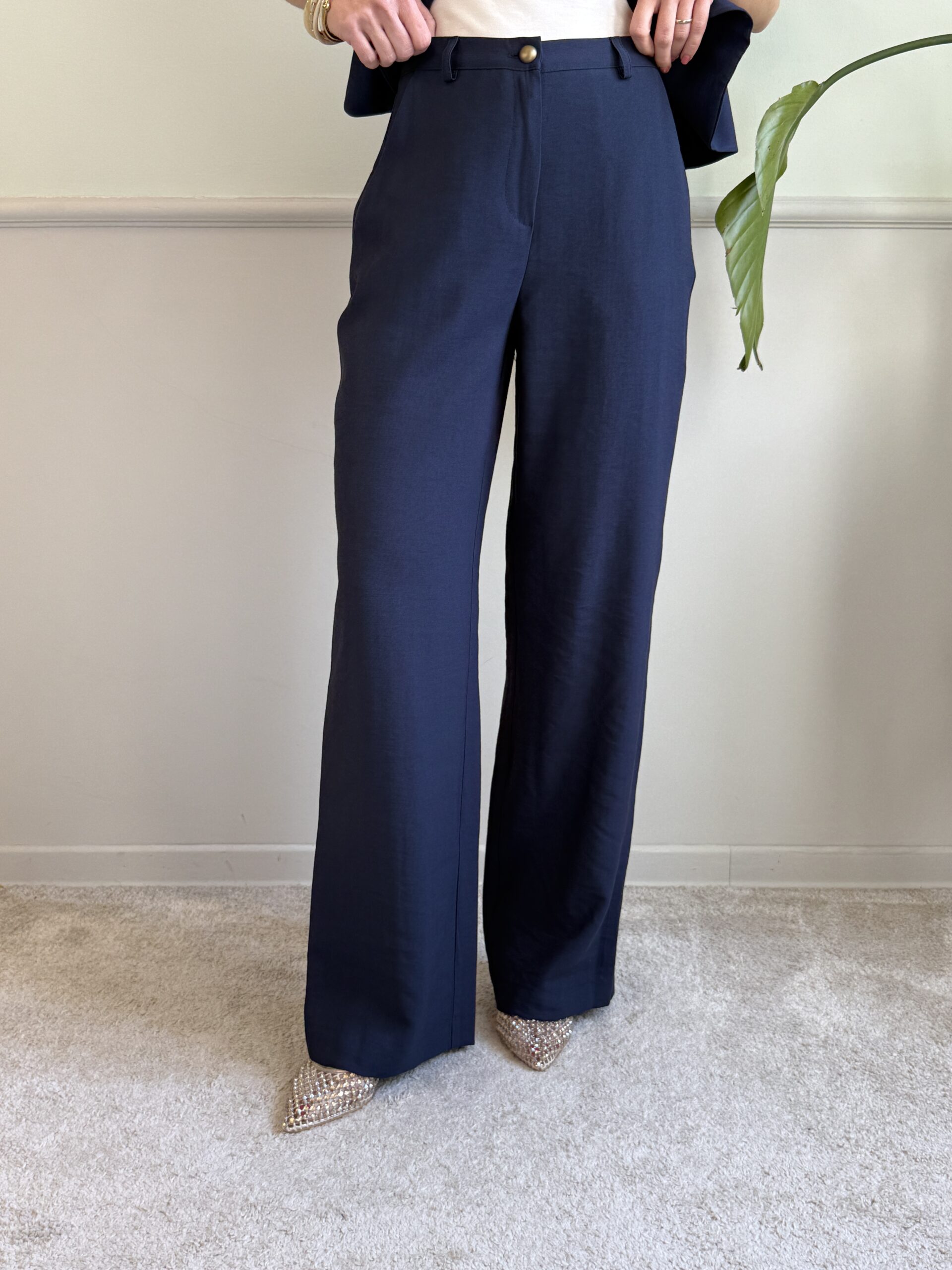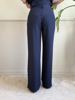 Pantalone a palazzo non ampio, vita alta e tasche alla francese.