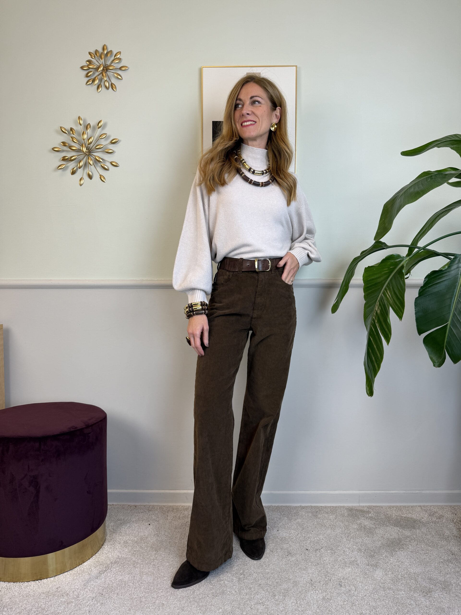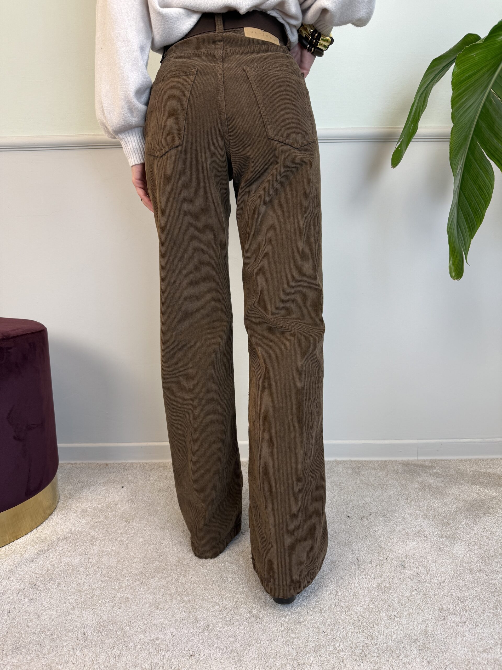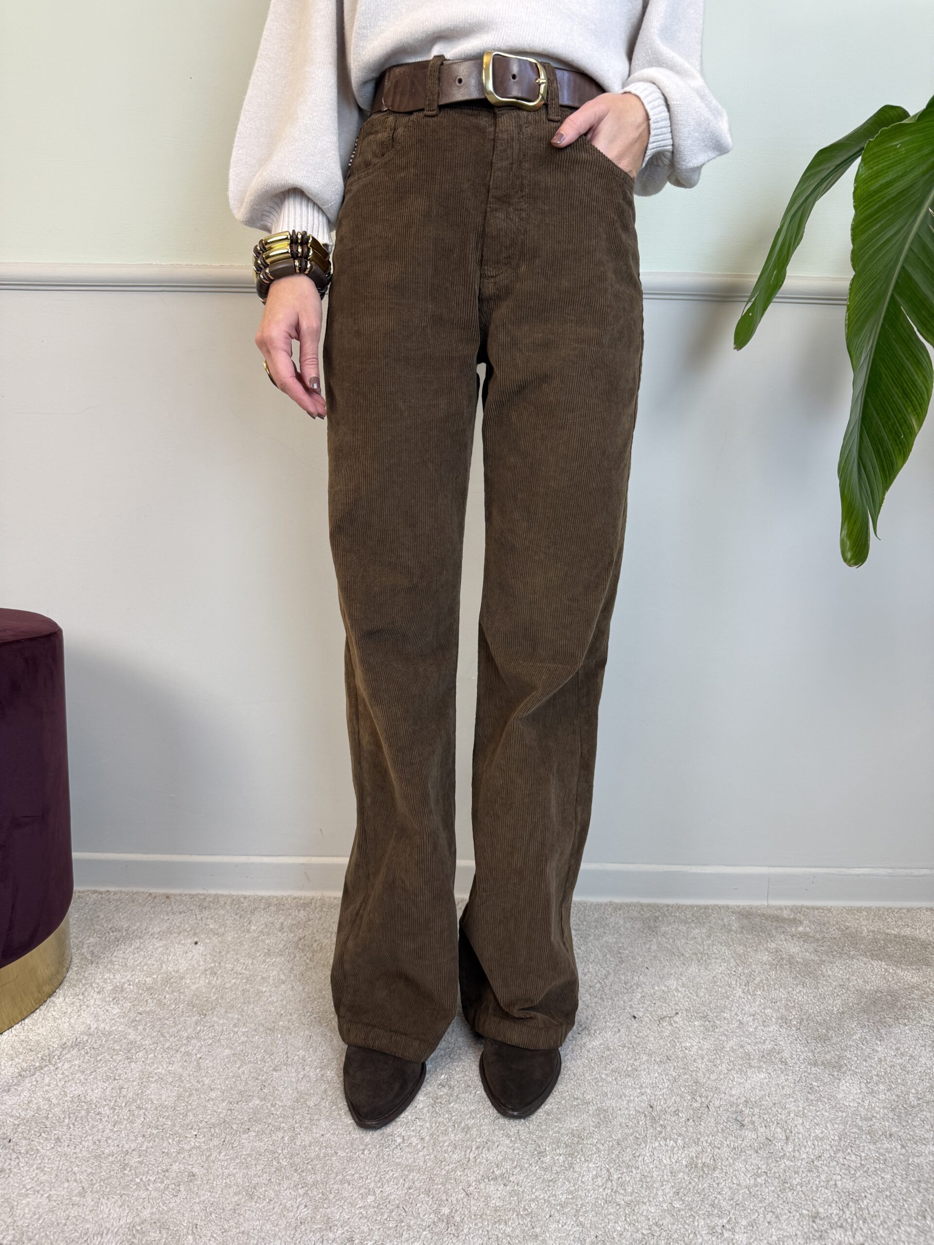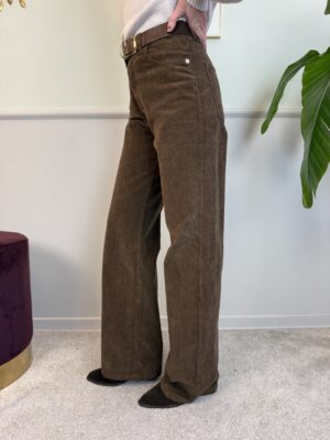 Panta palazzo in velluto mille righe a vita alta, modello 5 tasche.