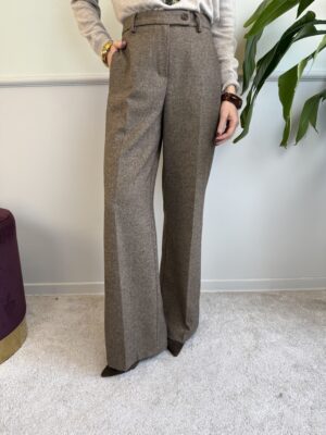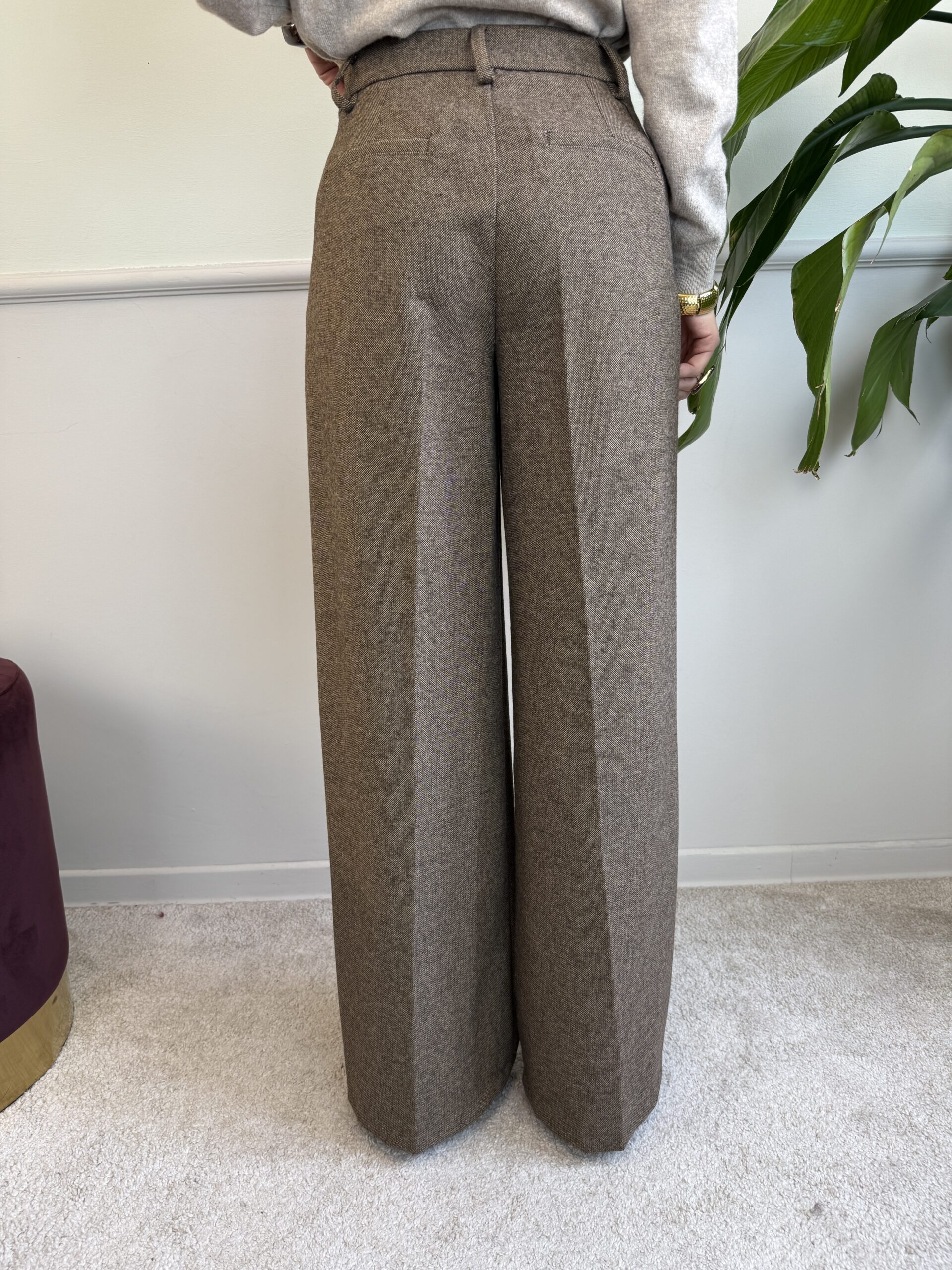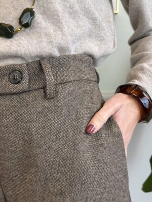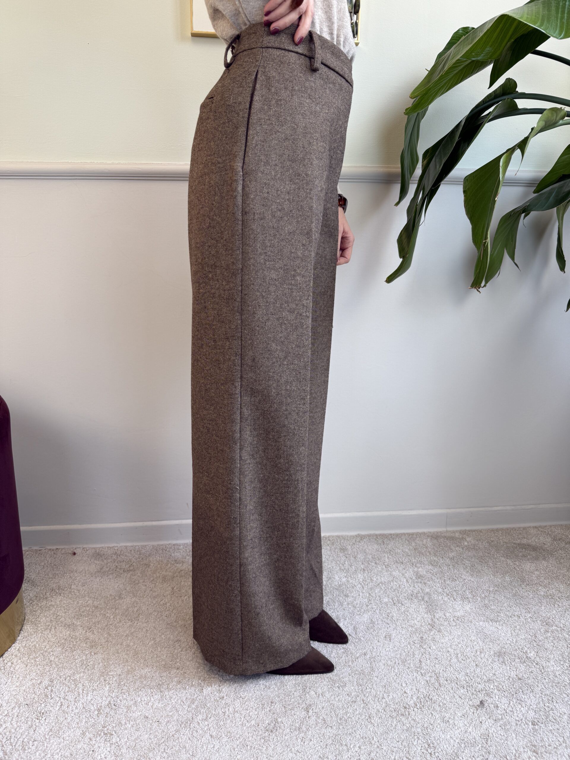Panta palazzo in tessuto caldo misto lana tabacco melange, vita alta e tasche laterali invisibili.
