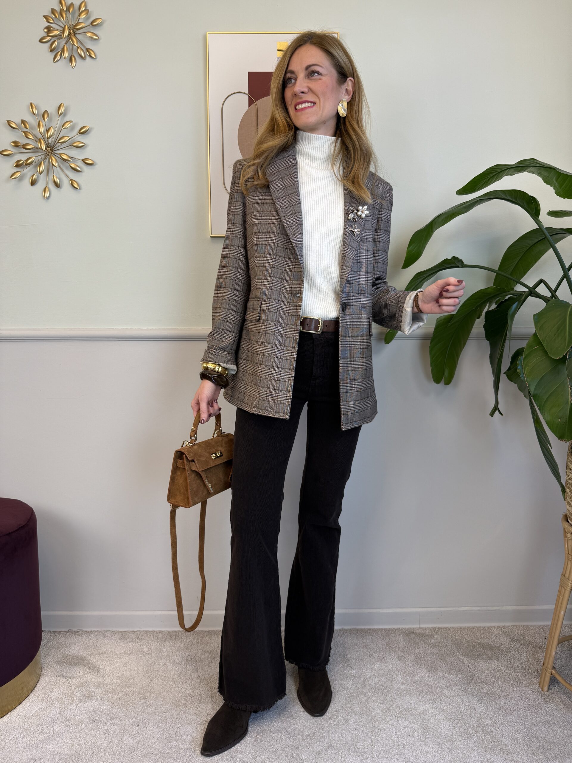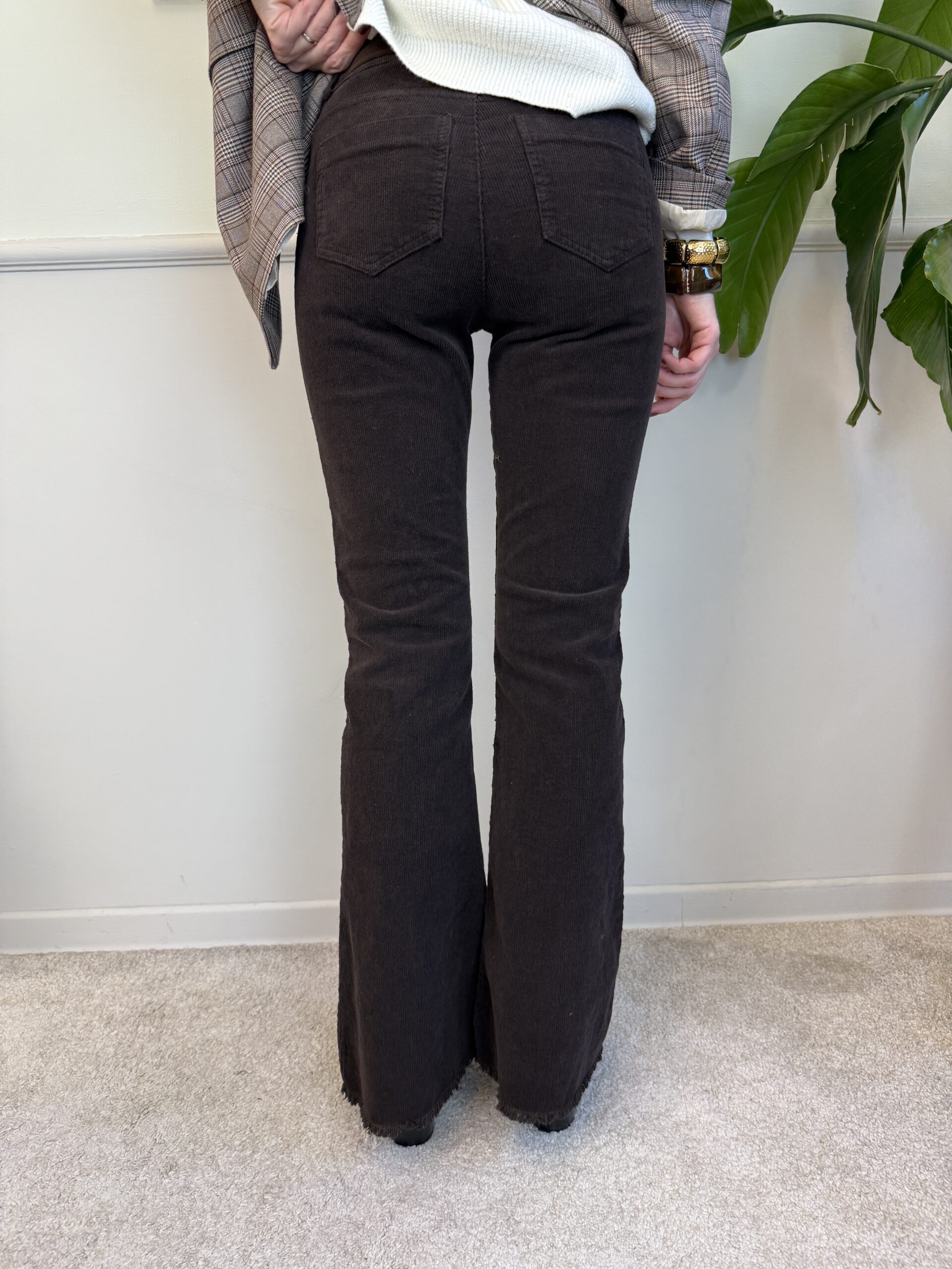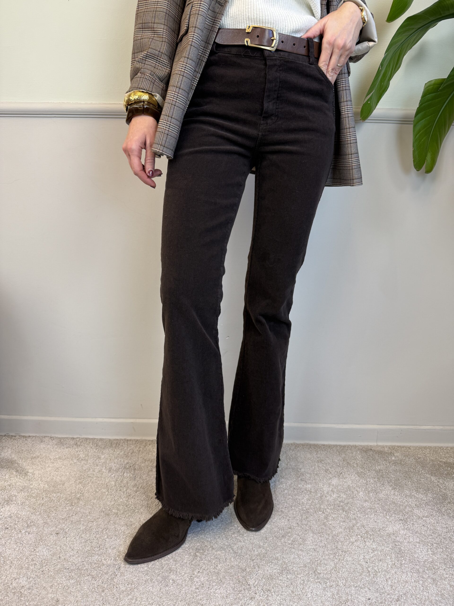 Pantalone a zampa in velluto, vita medio alta, orlo leggermente sfrangiato.