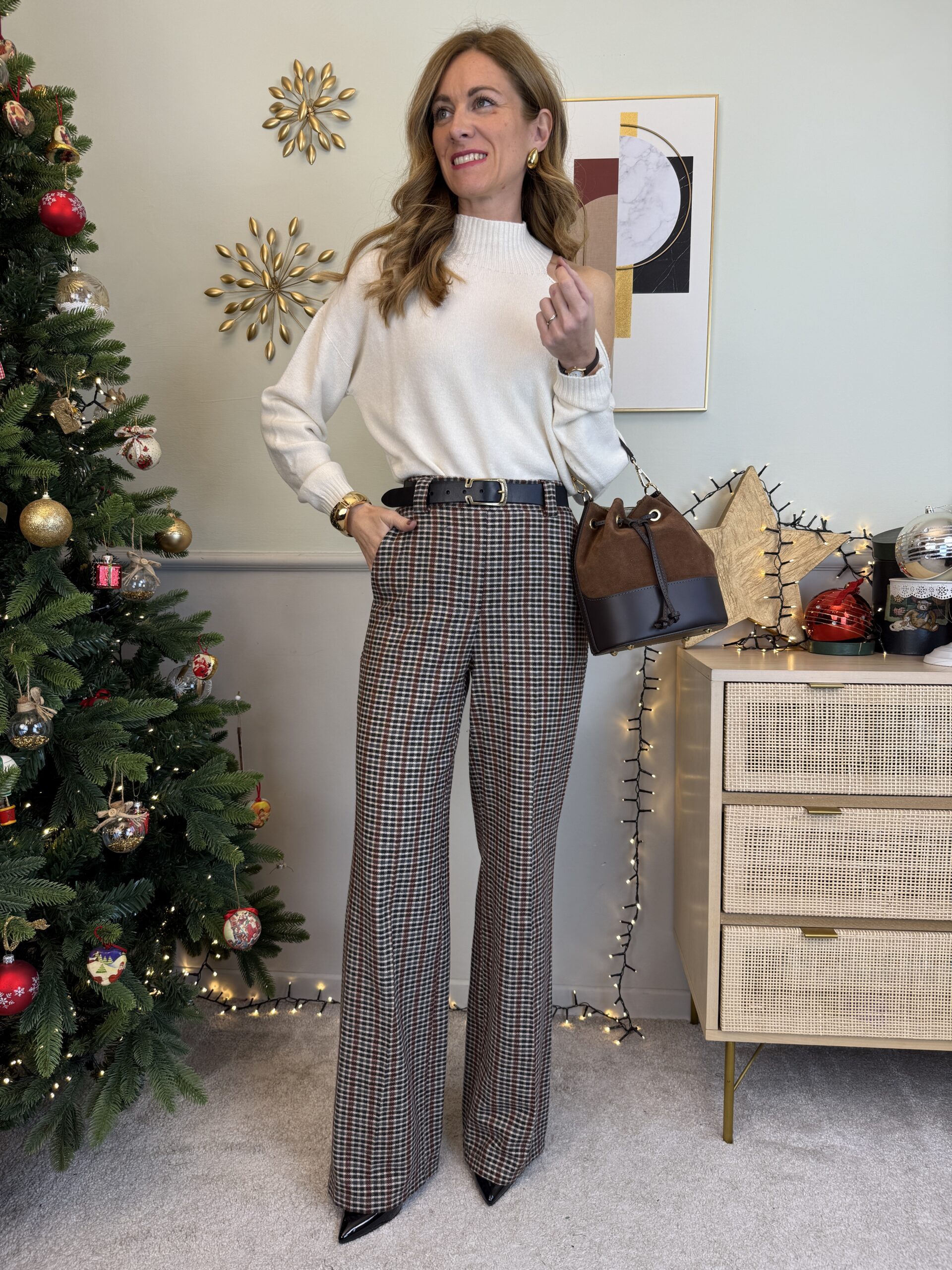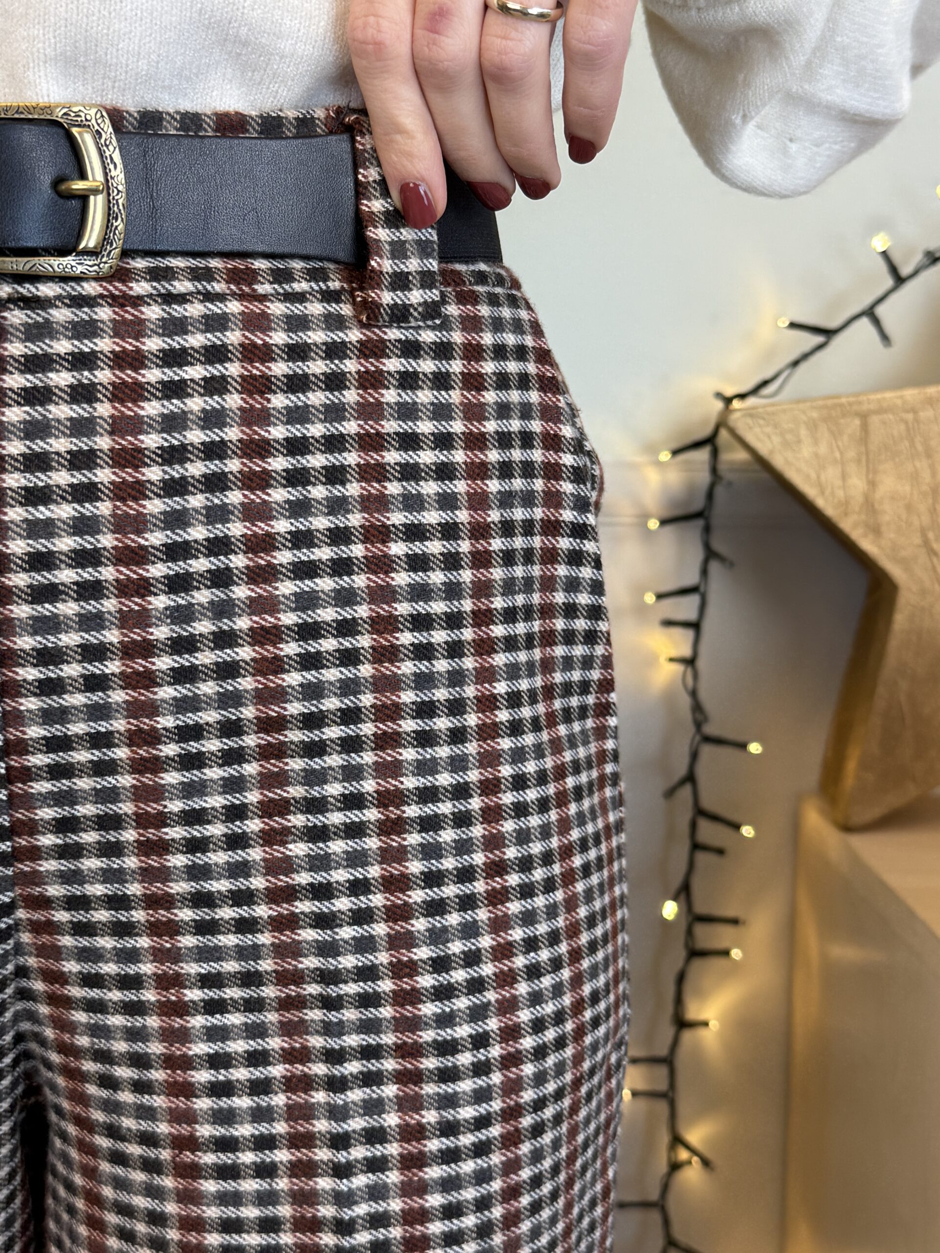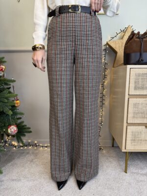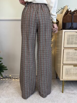 Pantalone a palazzo in panno caldo con fantasia a quadretti sui toni del grigio, bruciato e panna.