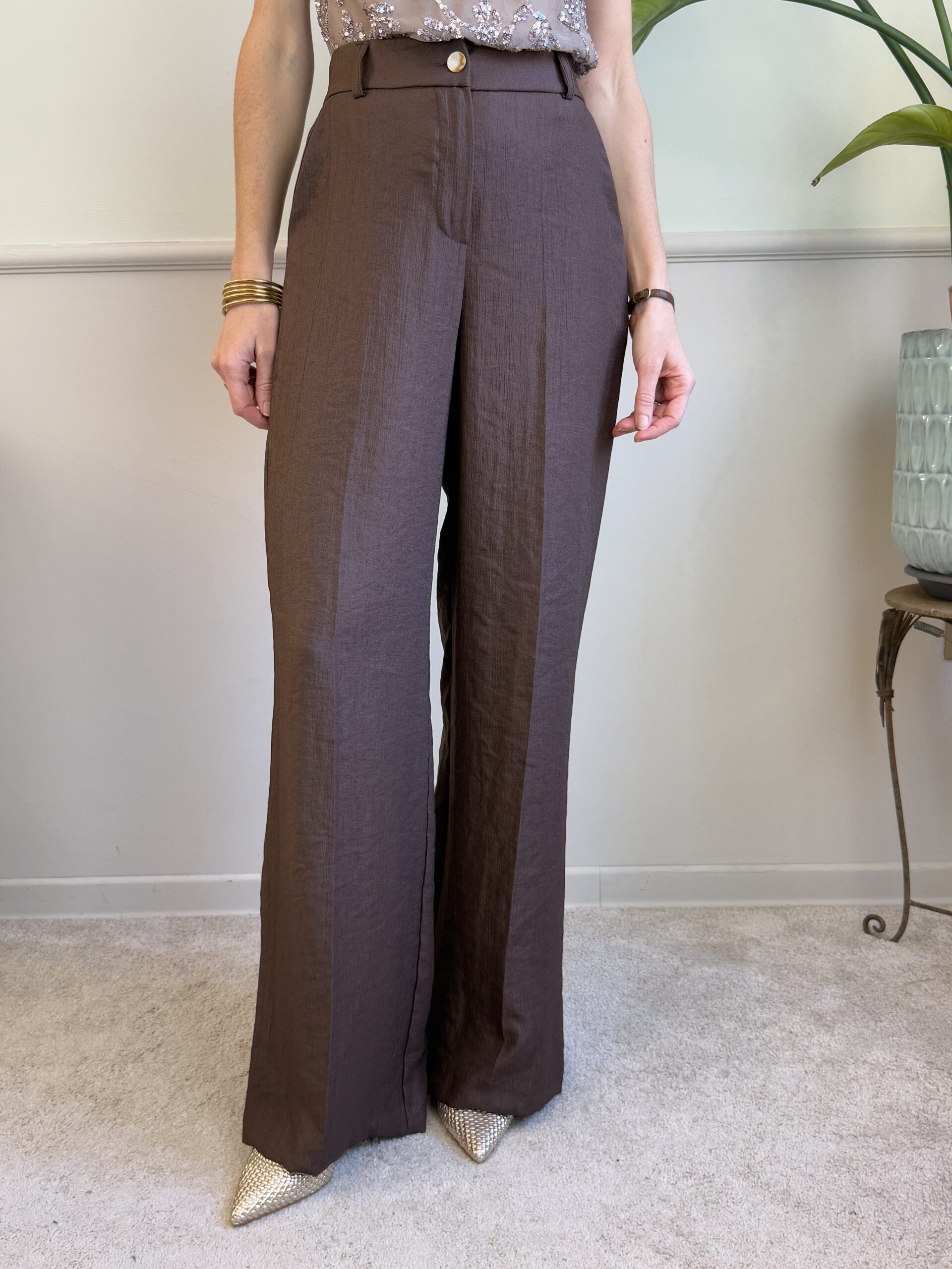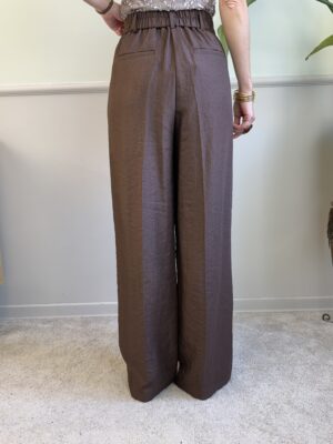 Pantaloni palazzo in froissé sui toni del marrone.