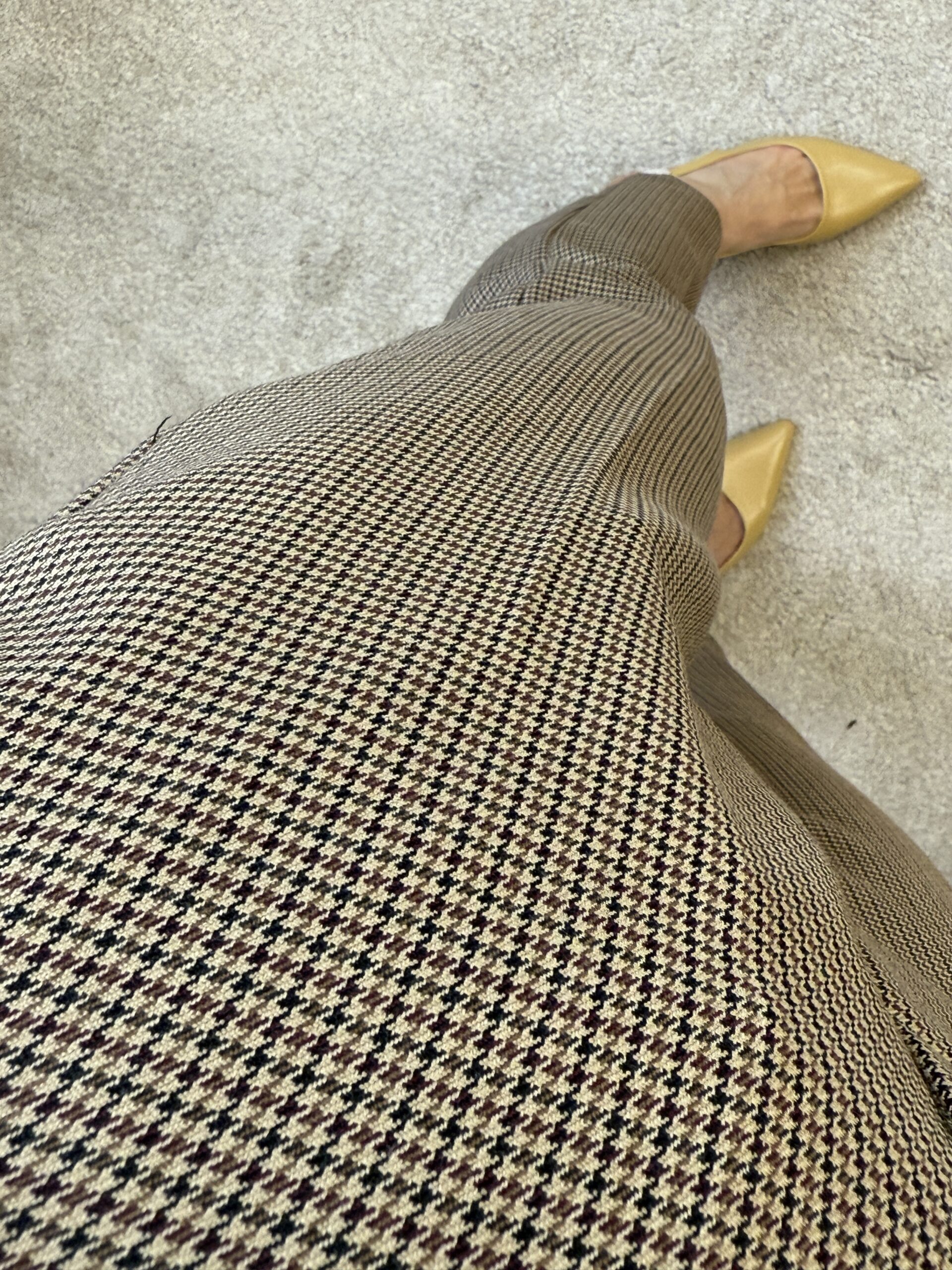 Pantaloni a sigaretta in fantasia pied-de-poule sui toni del cammello, bordeaux e nero.