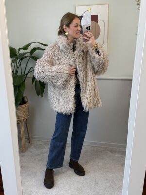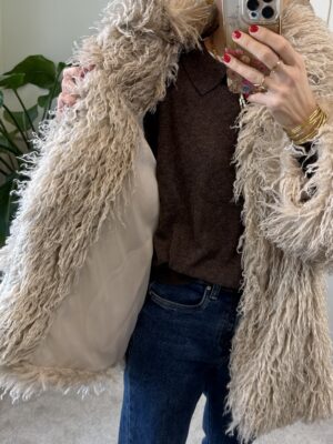 Eco pelliccia con rever, chiusura con ganci (invisibili).