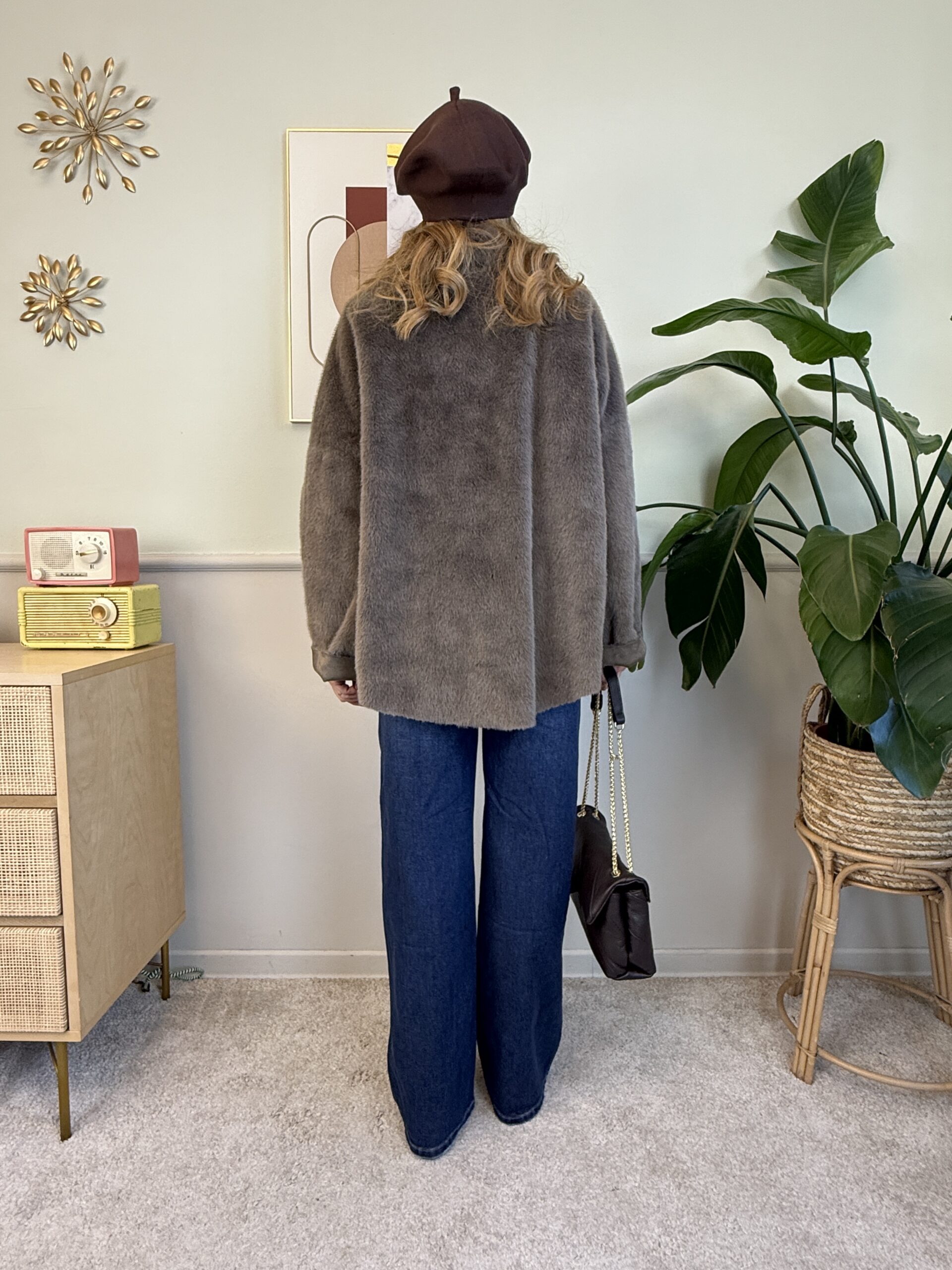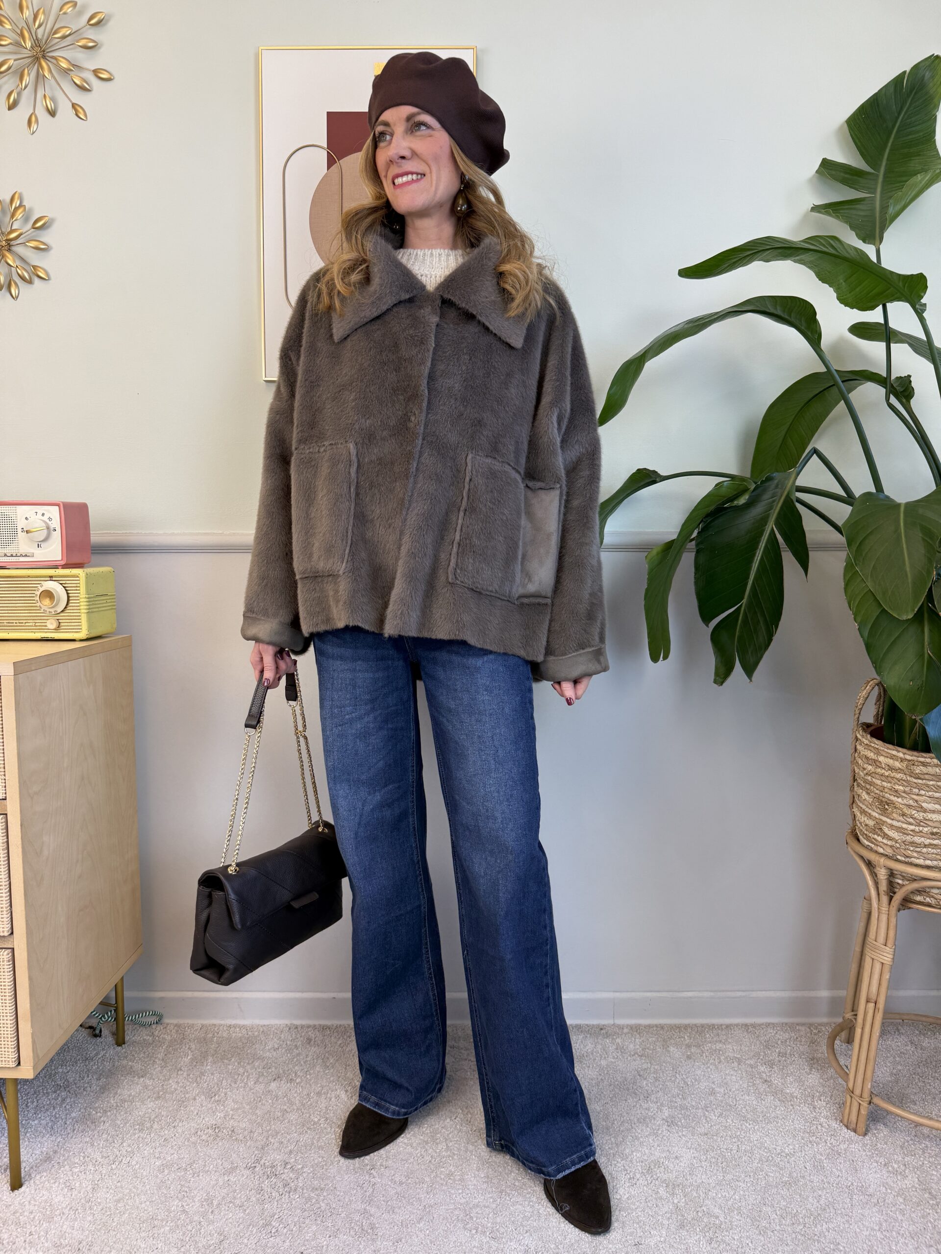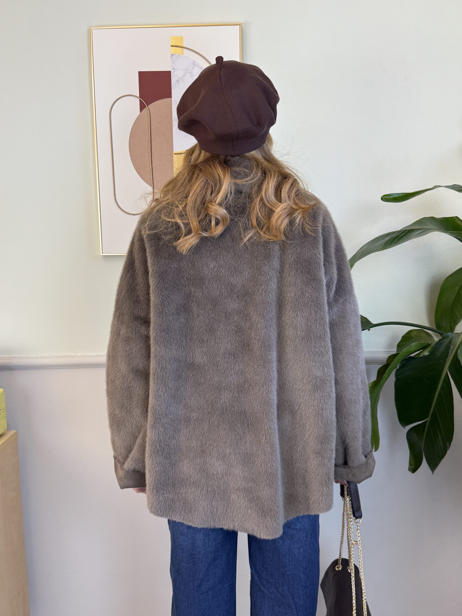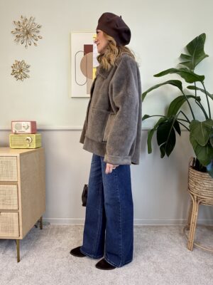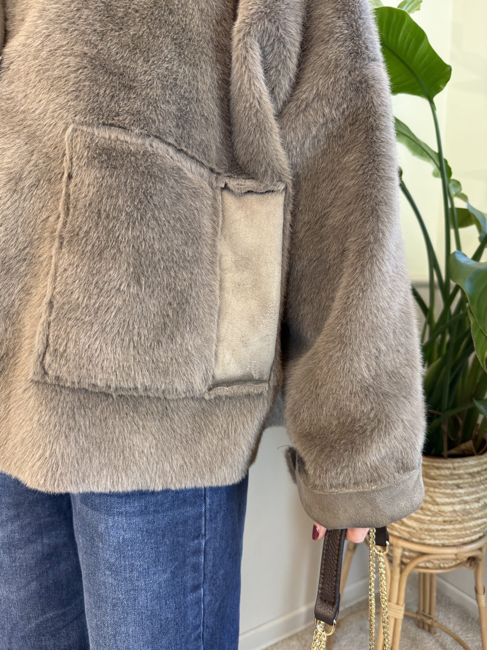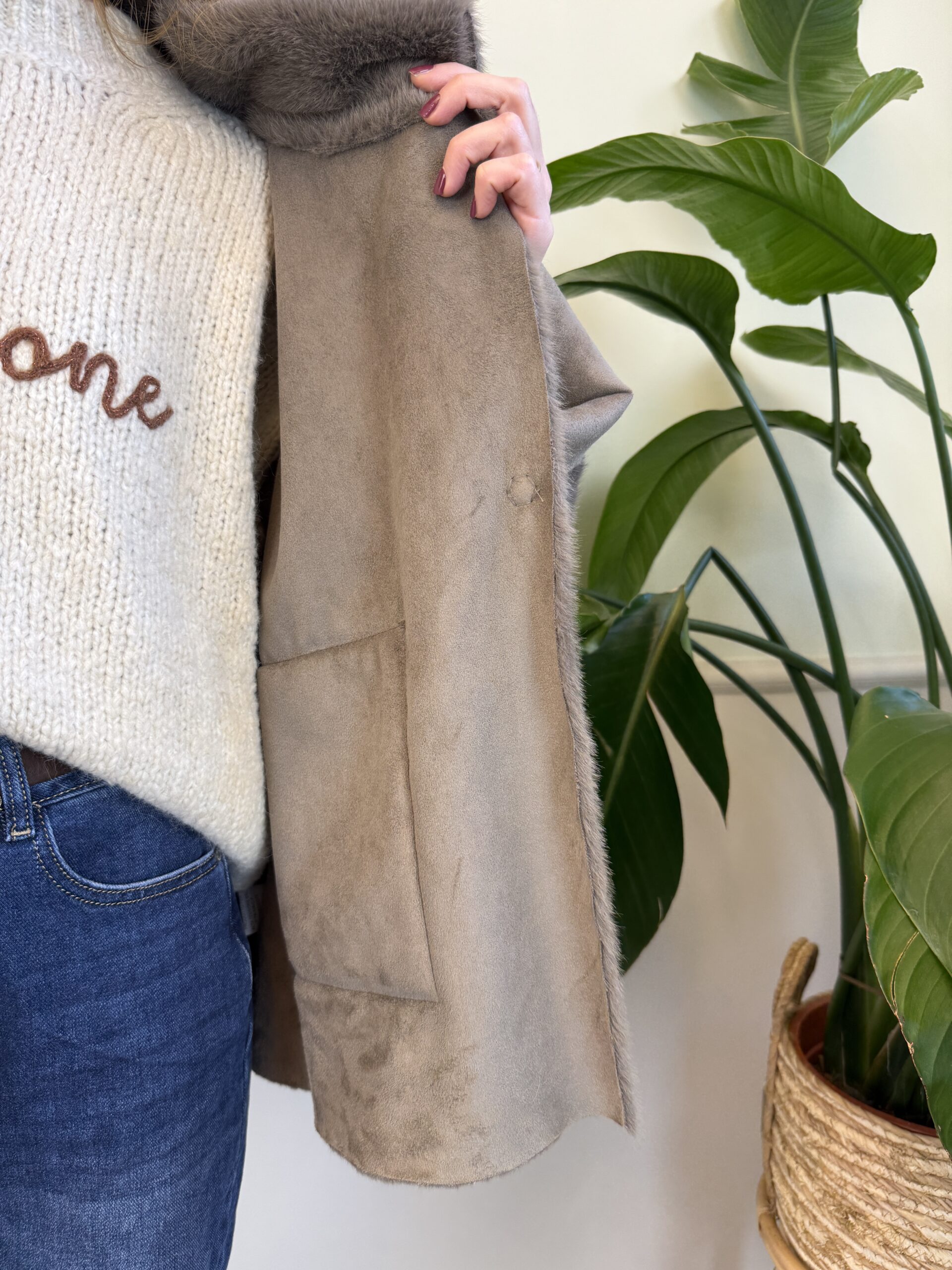 Pellicciotto a taglio vivo color fango. Presenta chiusura con due bottoni a scomparsa e due tasche frontali.