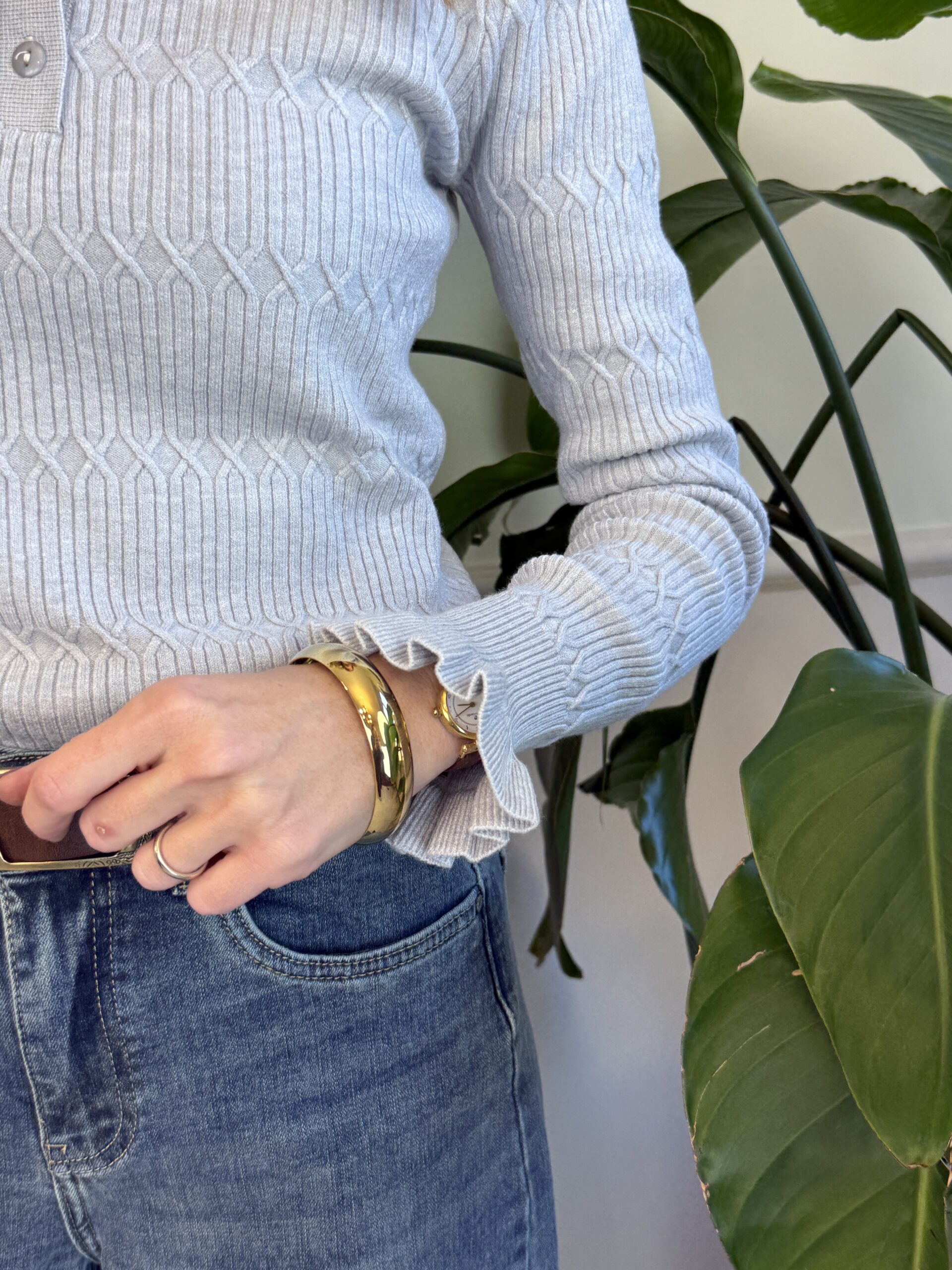 Polo in maglia elasticizzata con manica lunga e rouches al polso.