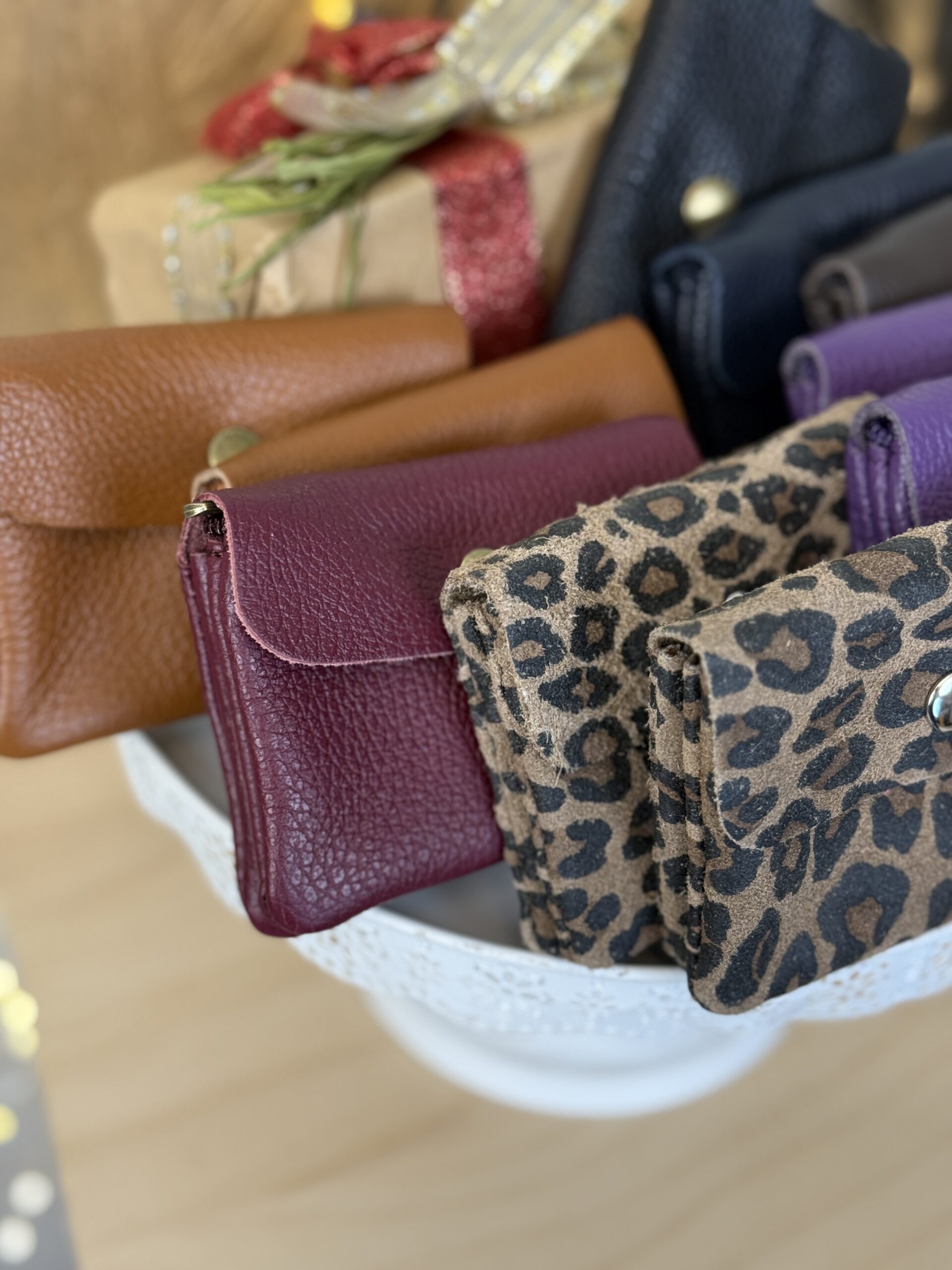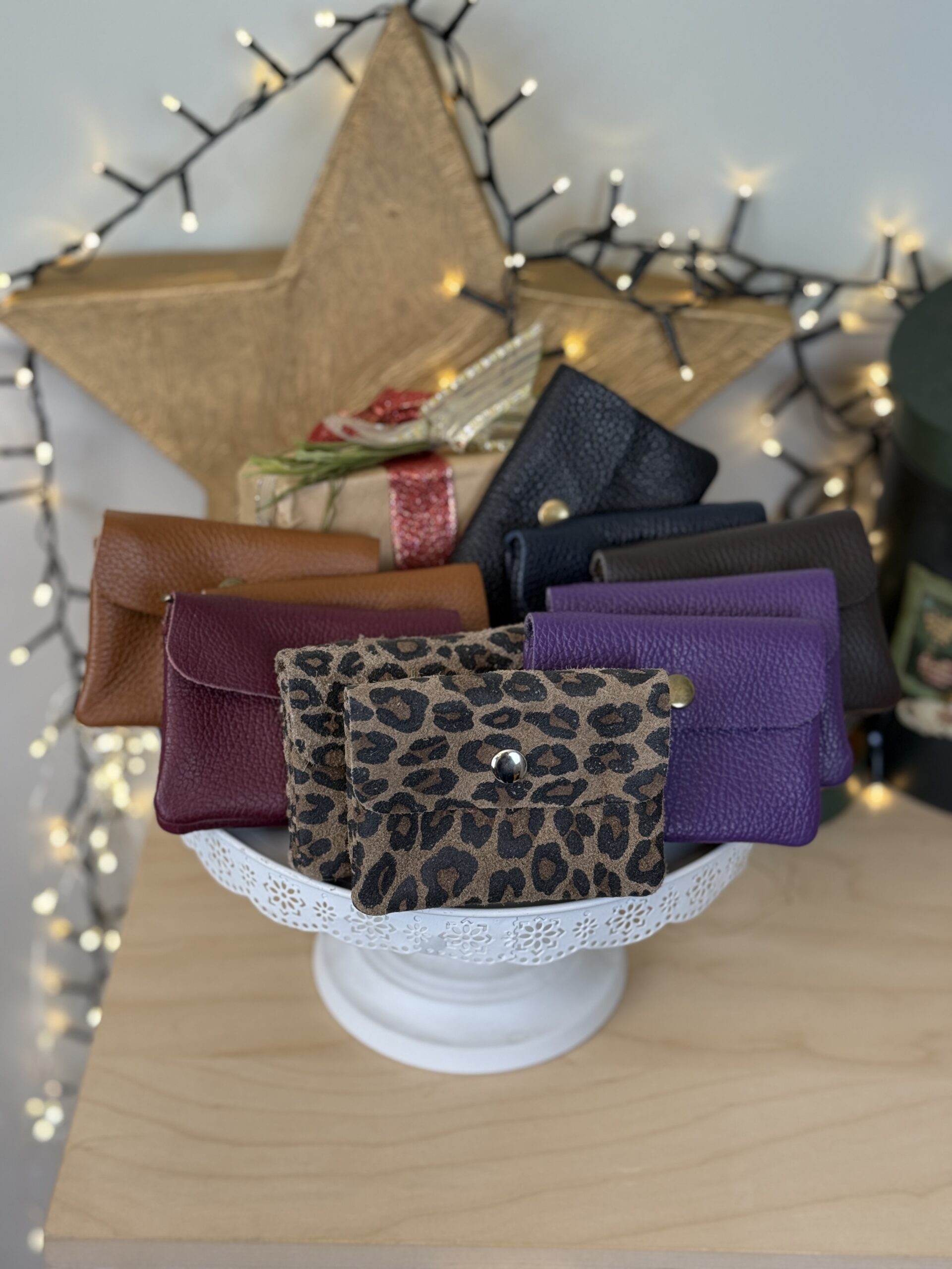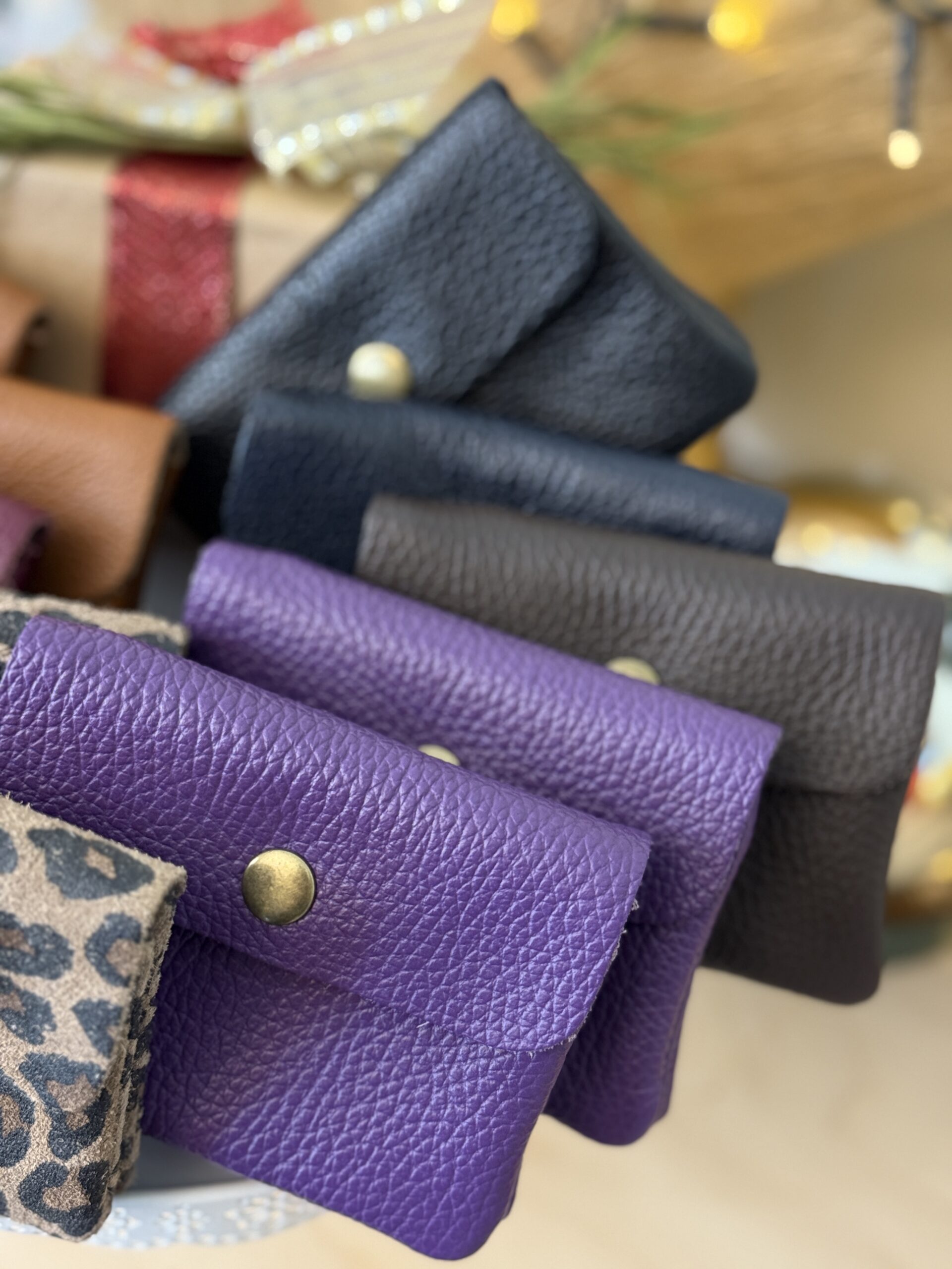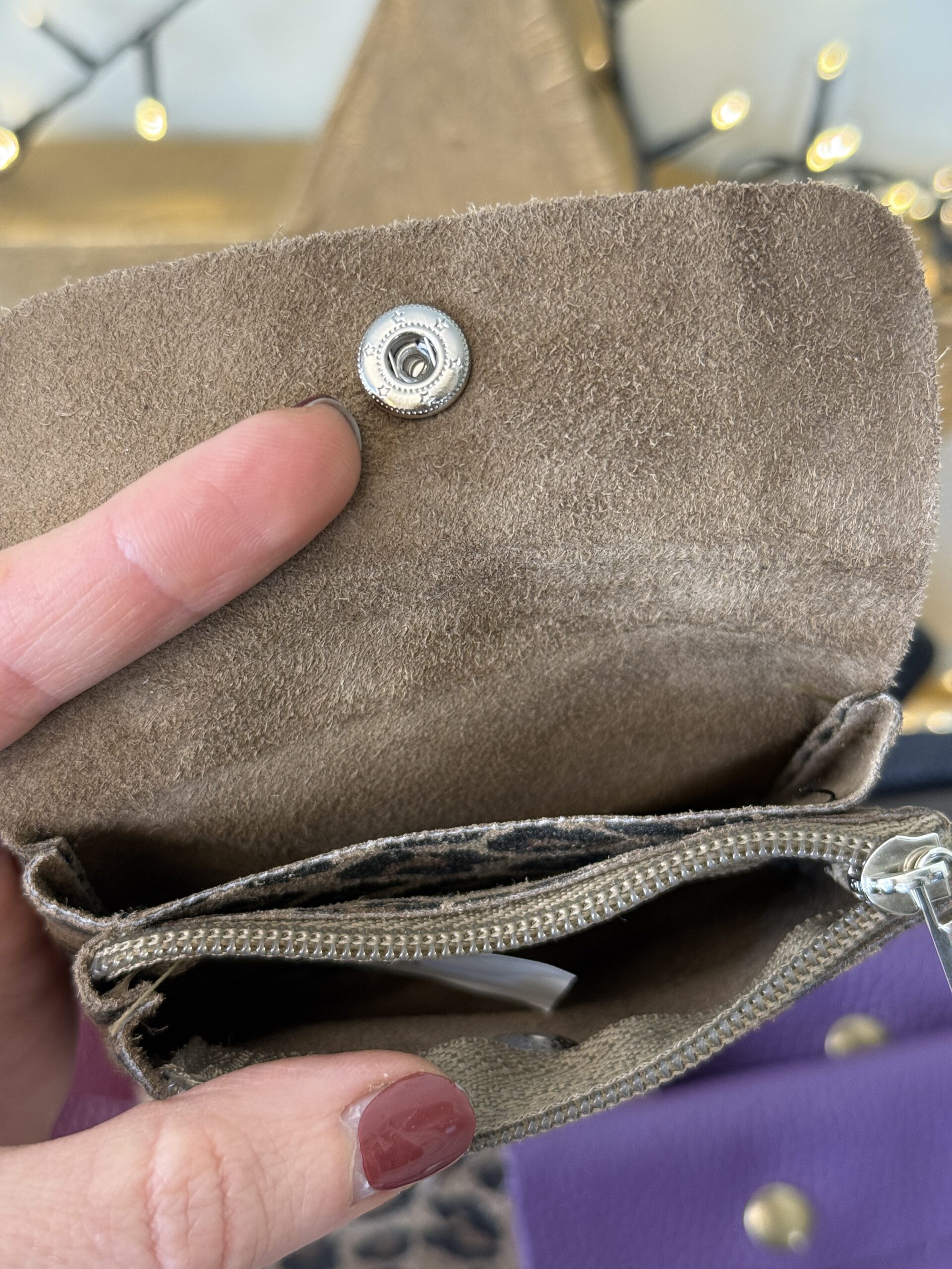 Portamonete in pelle con doppia tasca interna, zip e bottone.