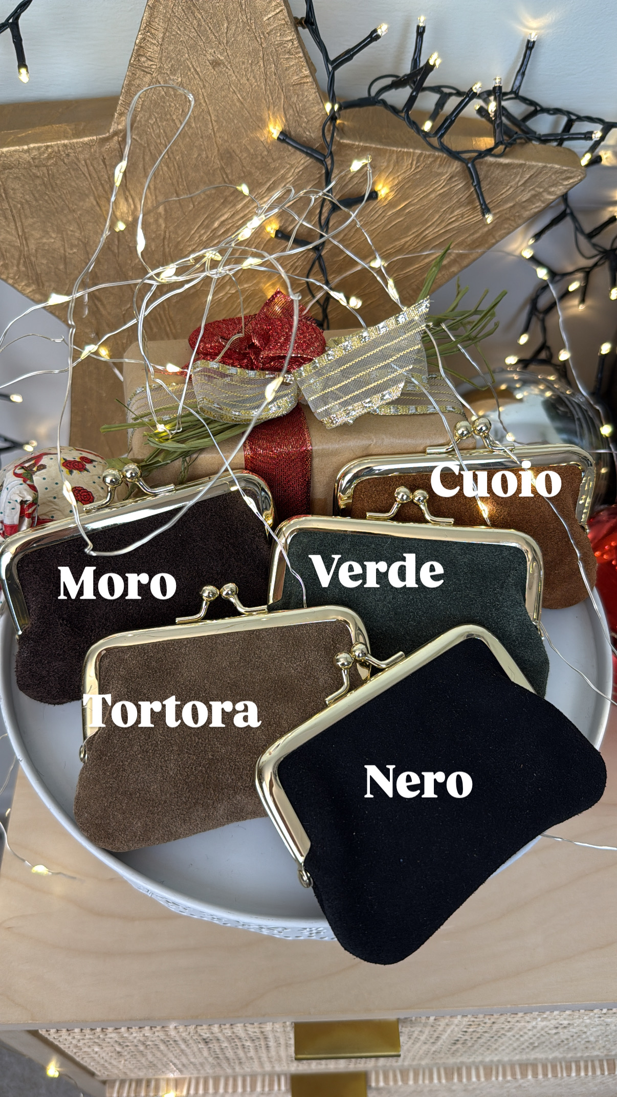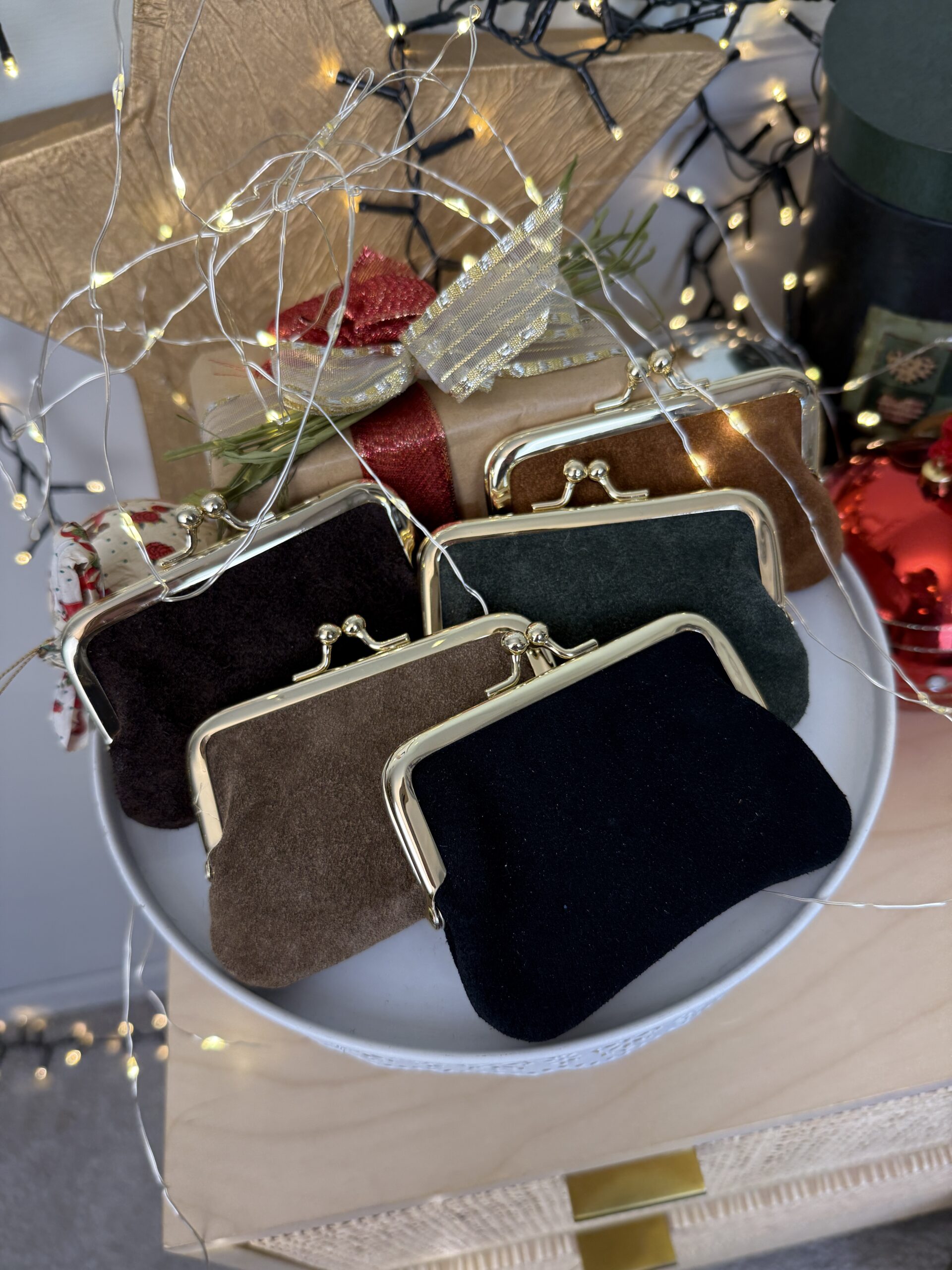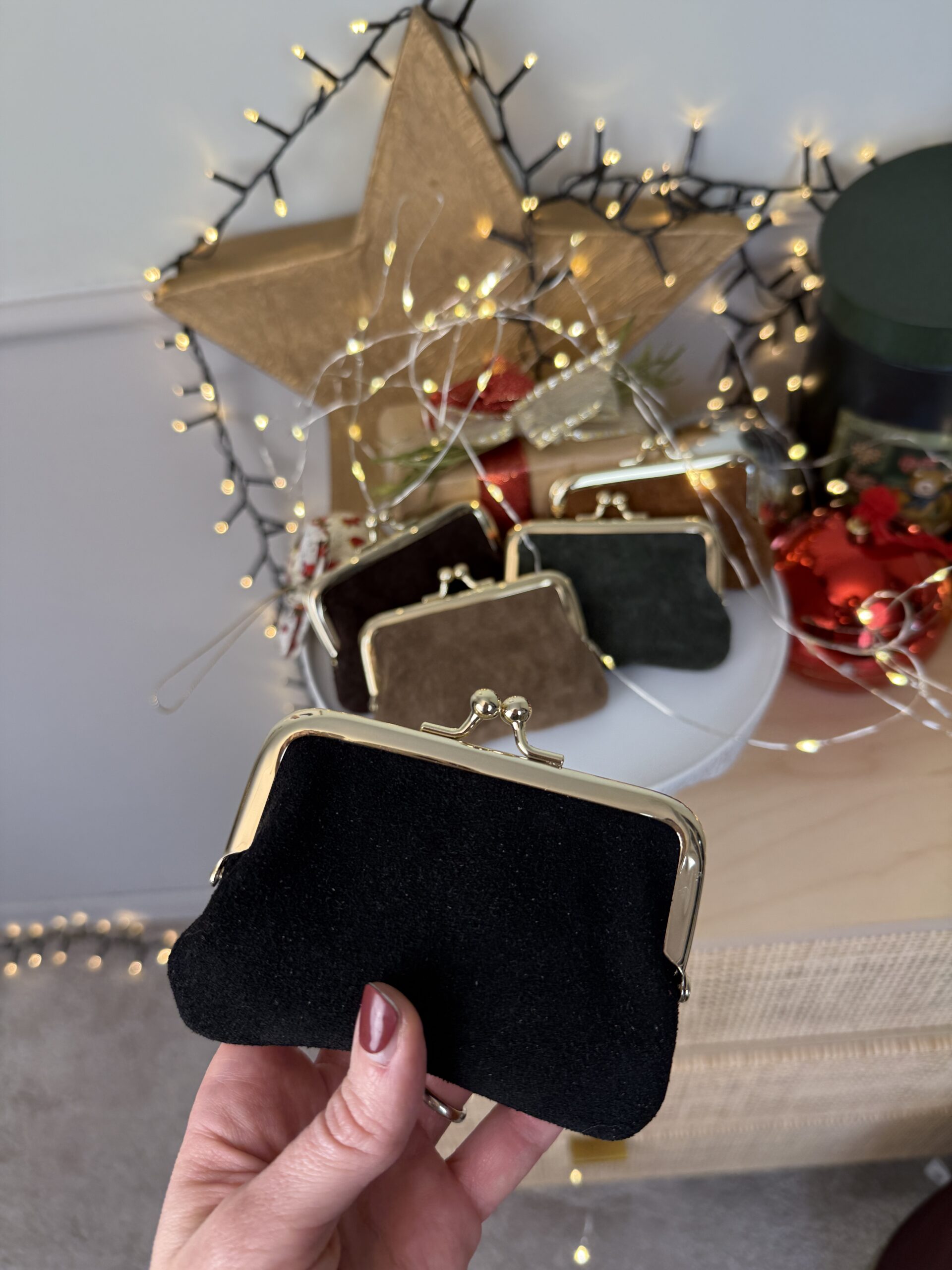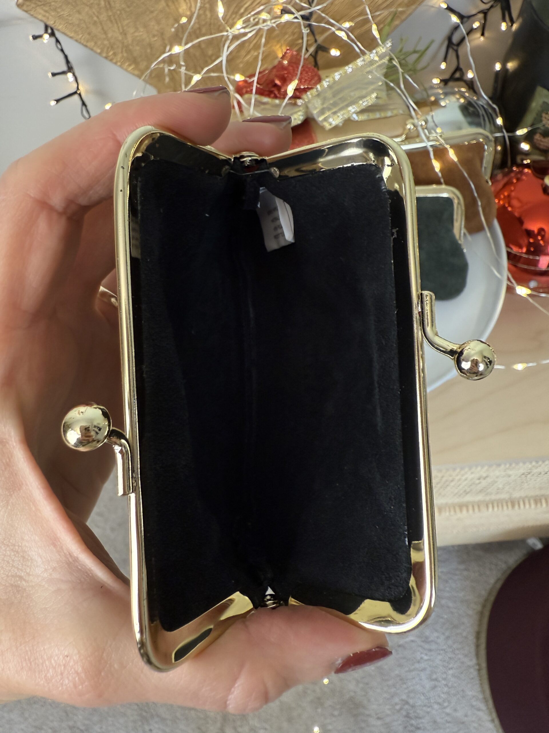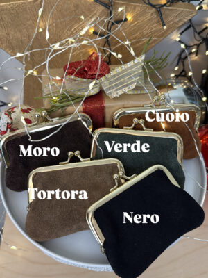 Portamonete in pelle con chiusura clic clac, profili dorati.