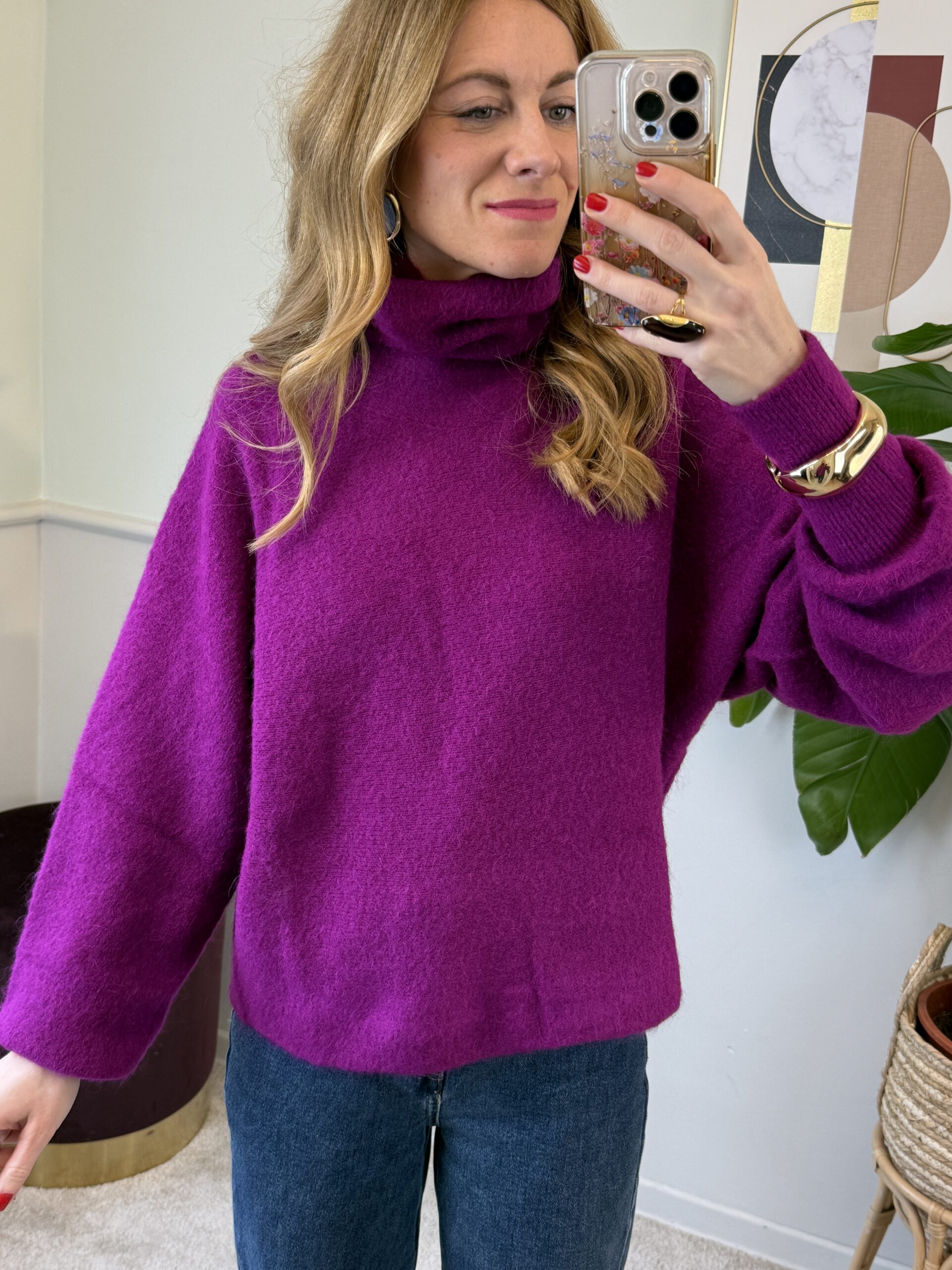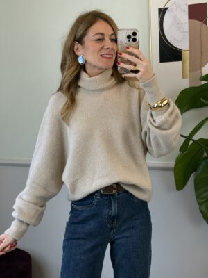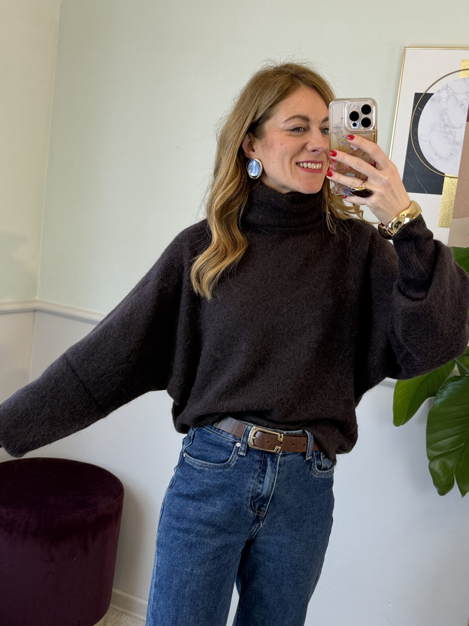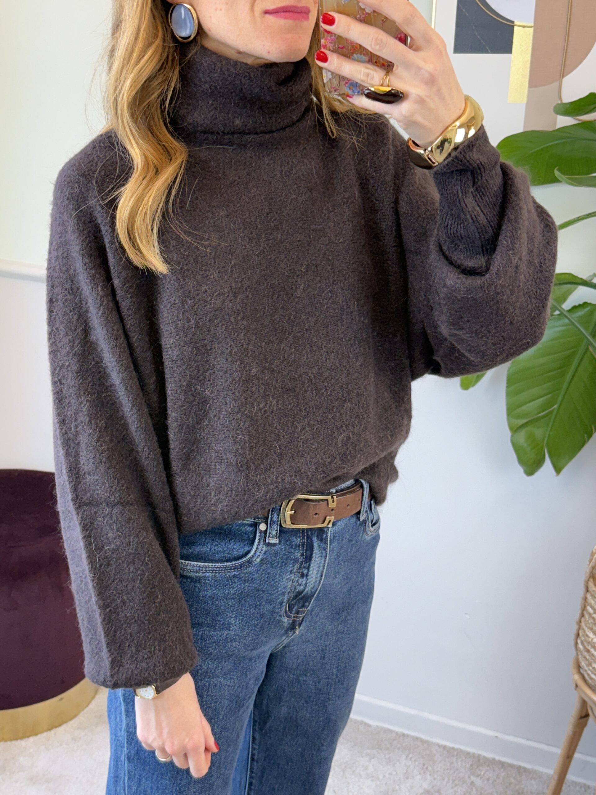 Pull con collo a ciambella, manica kimono e polsi a coste, tessuto misto lana mohair.