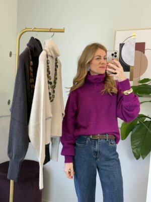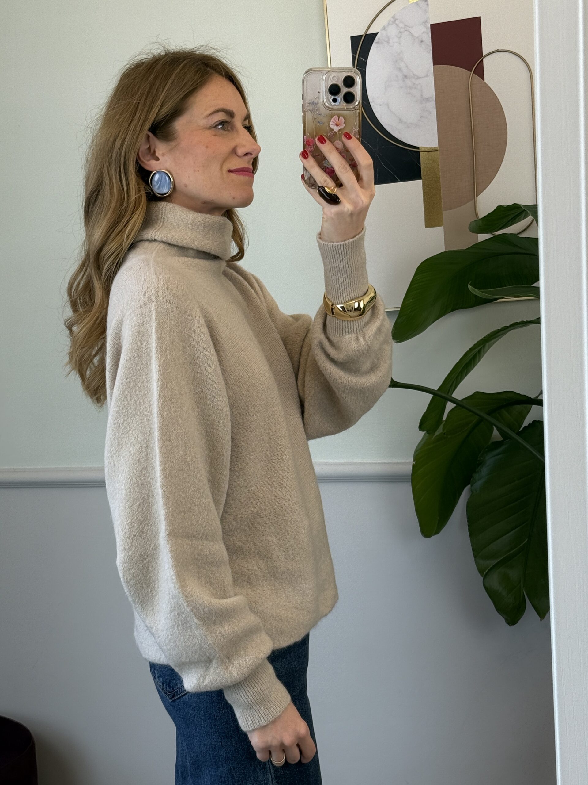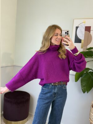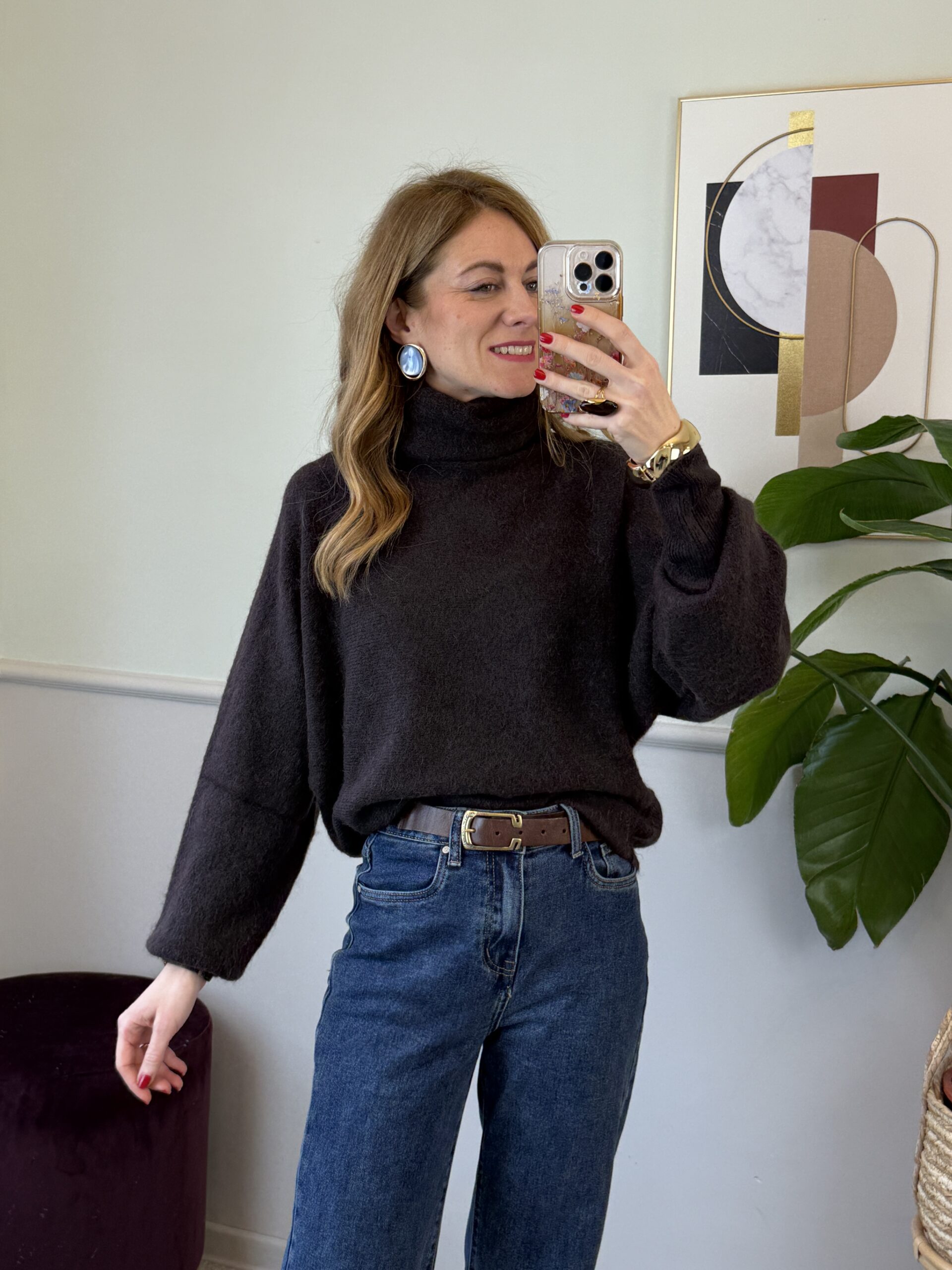 Pull con collo a ciambella, manica kimono e polsi a coste, tessuto misto lana mohair.