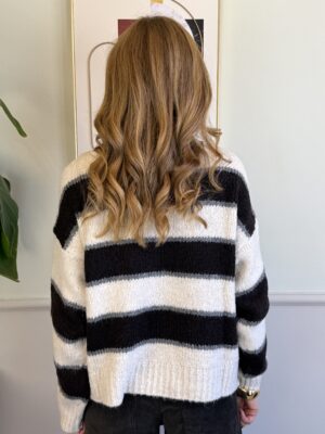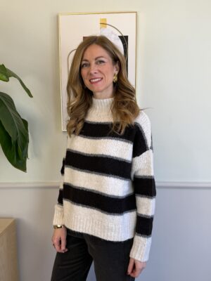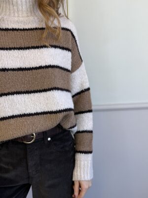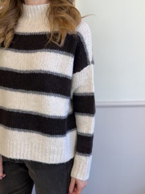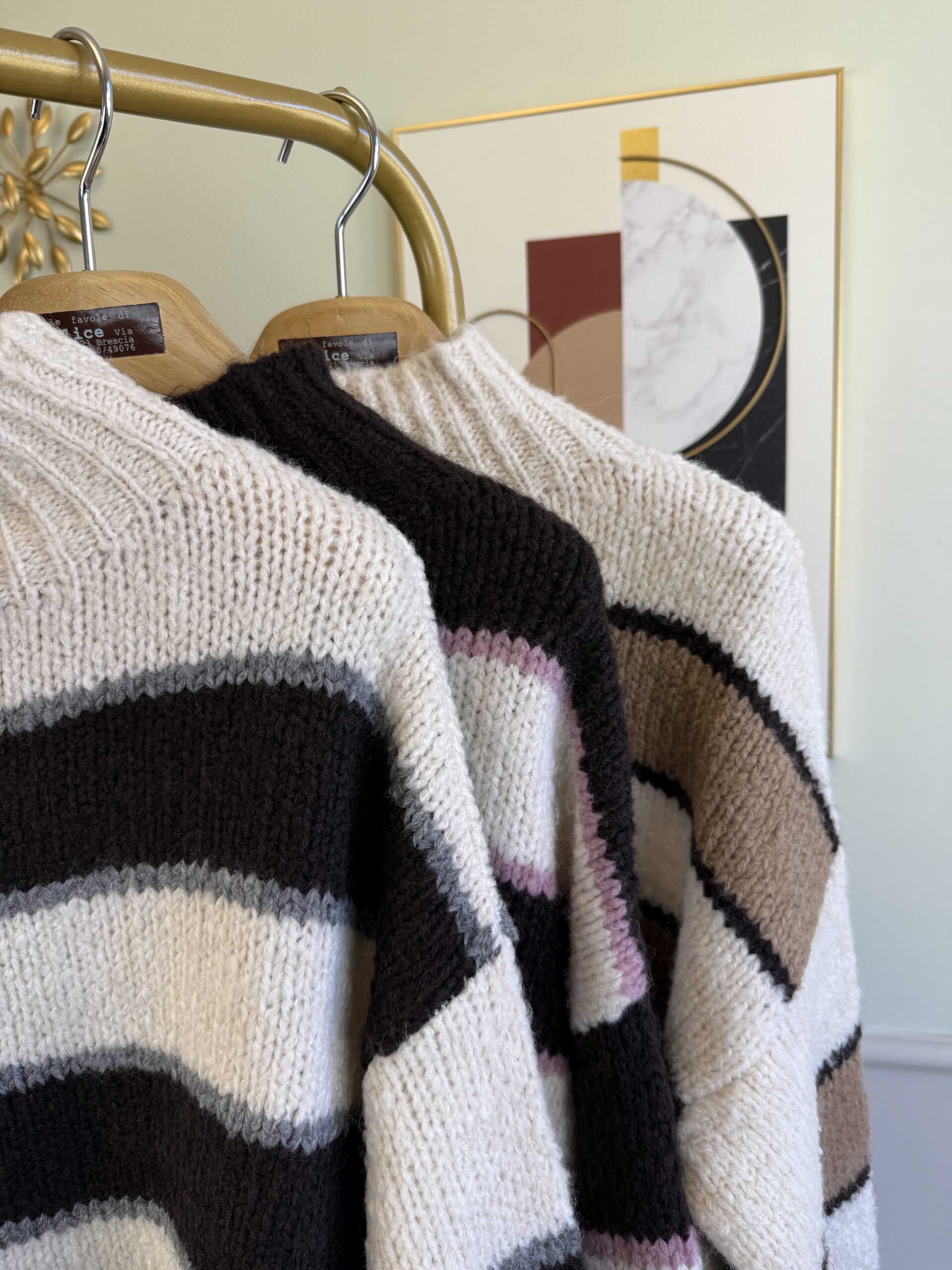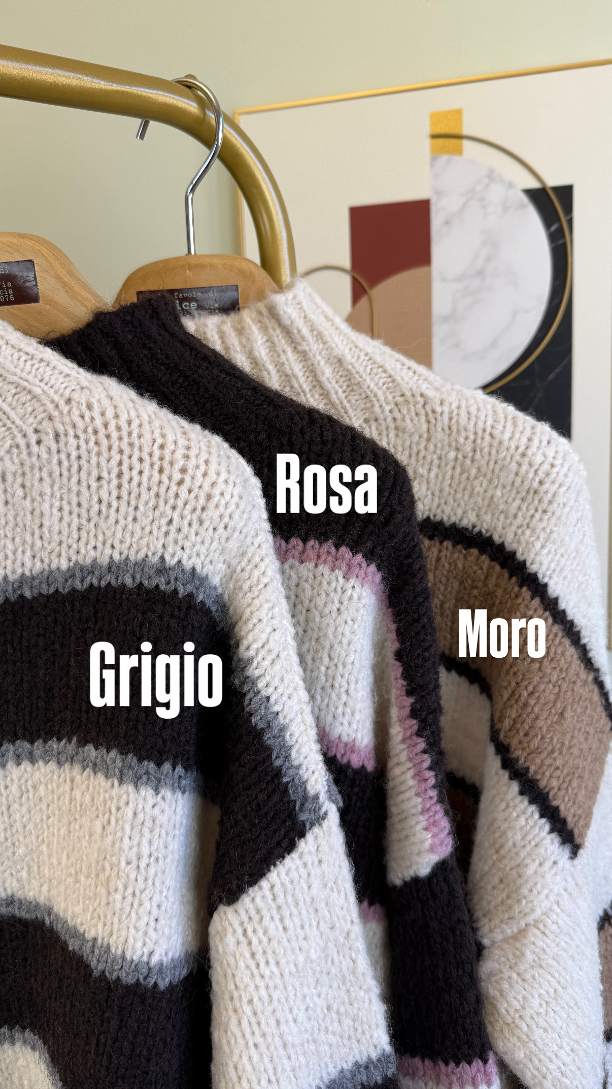Pull a righe morbidissimo con collo cratere, spalla scesa, modello scatolina.