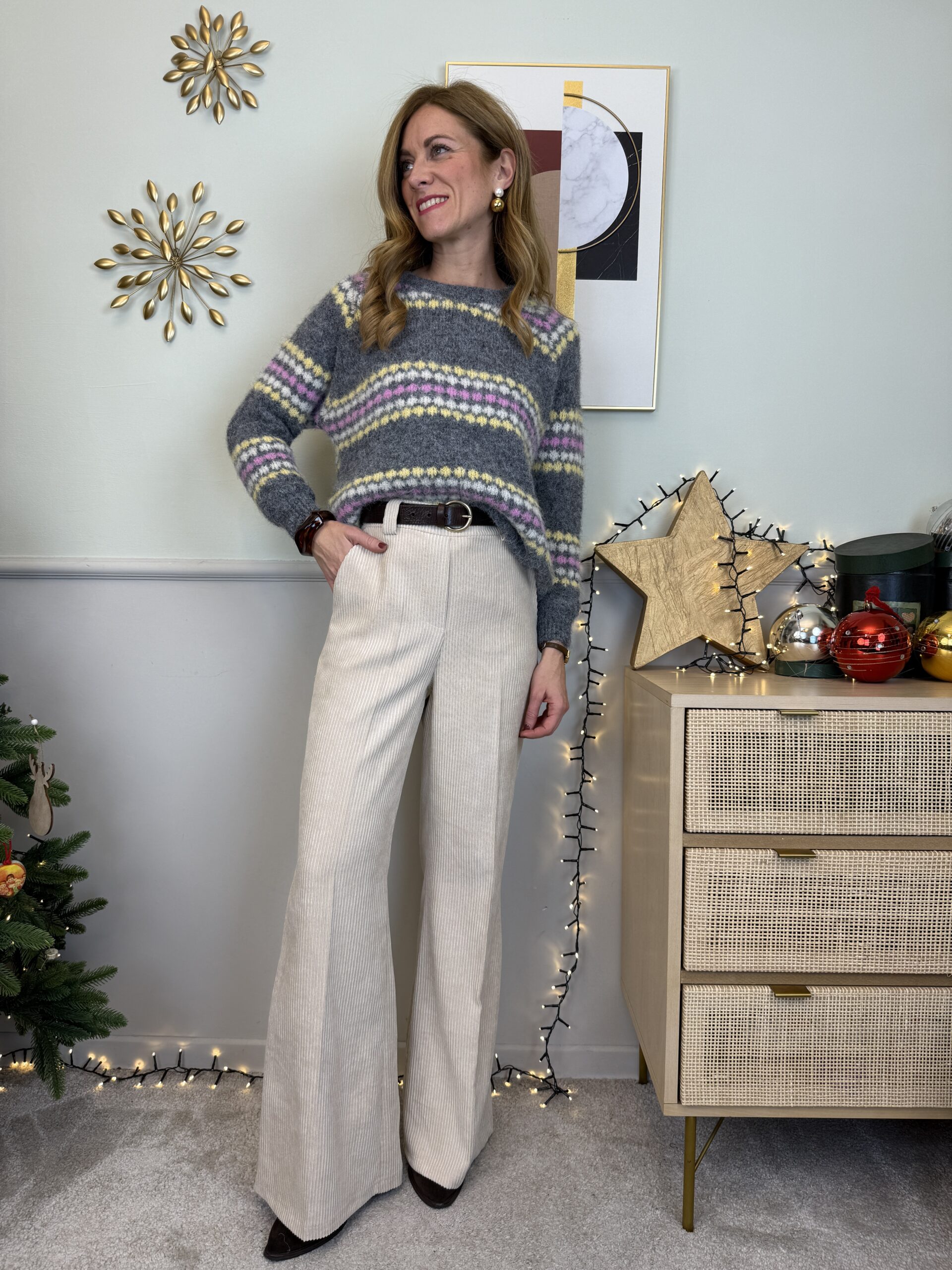 Maglione girocollo grigio con fantasia a righe composte da pallini in fila rosa, giallo e bianco.