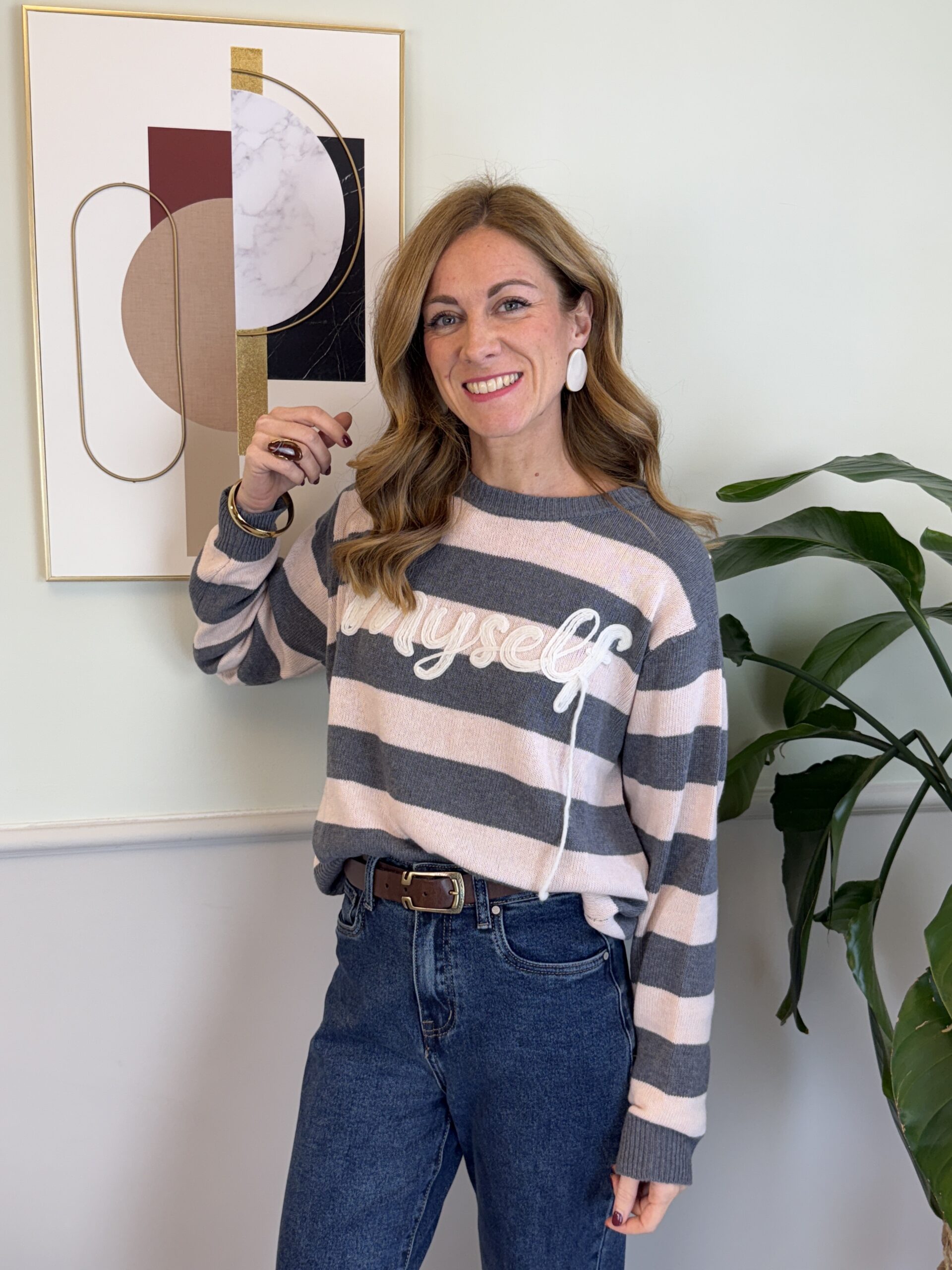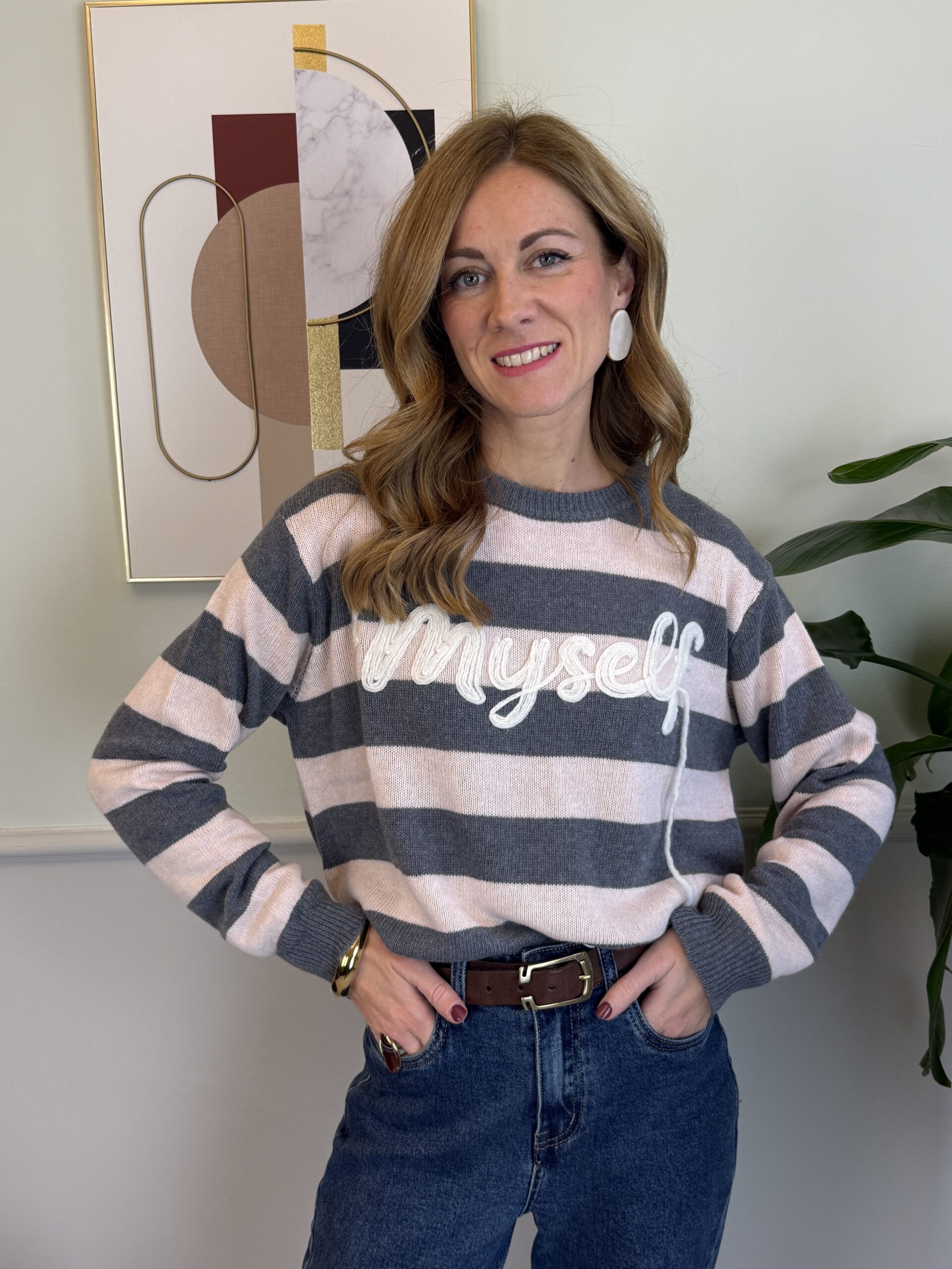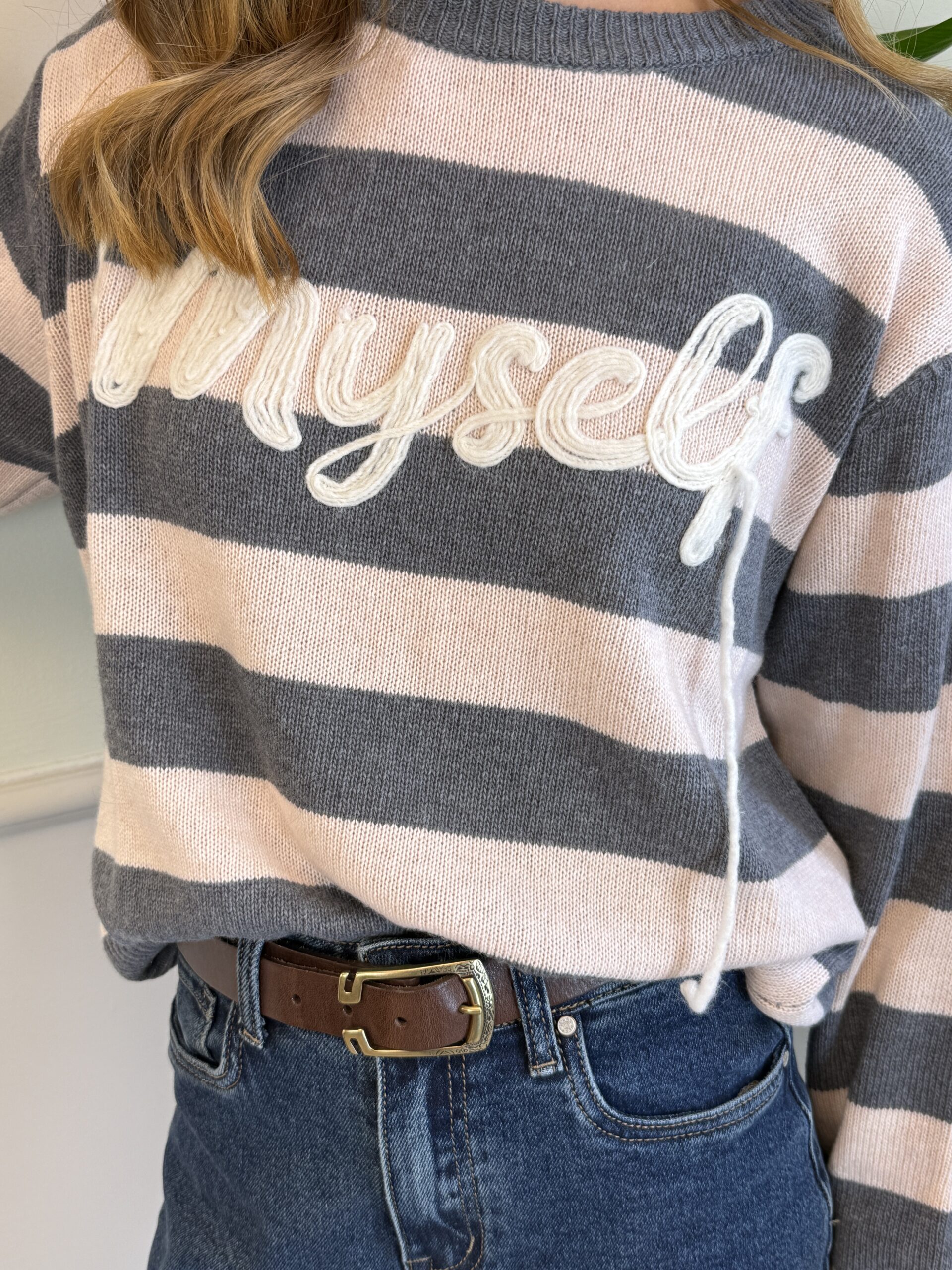 Pull girocollo a scatolina con riga alta e scritta ricamata “Myself”.