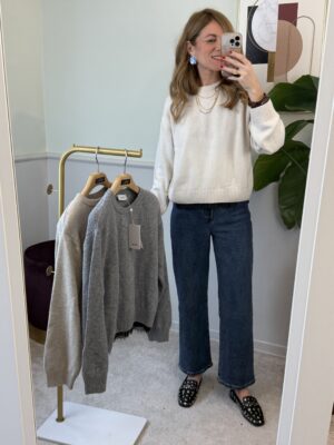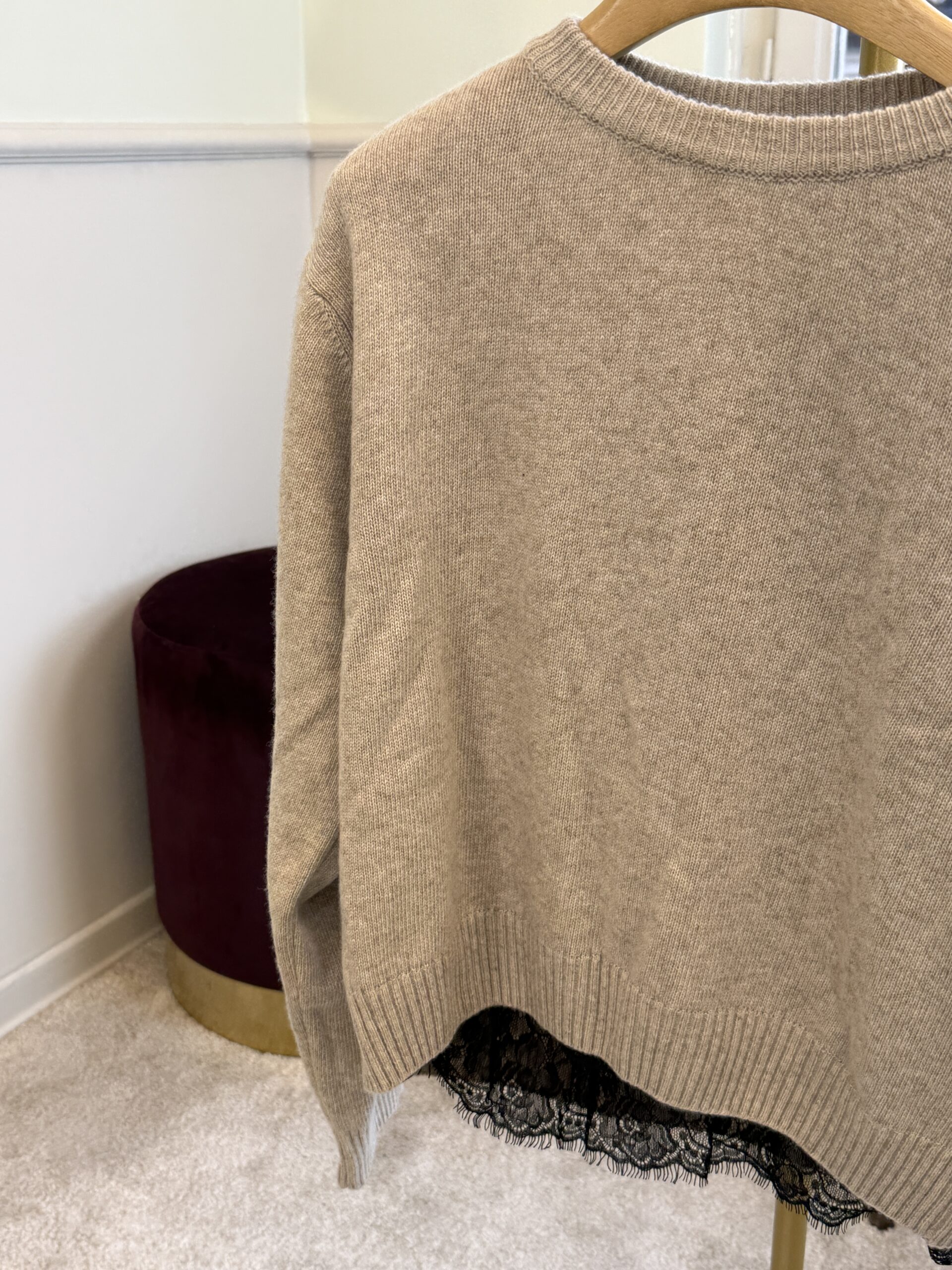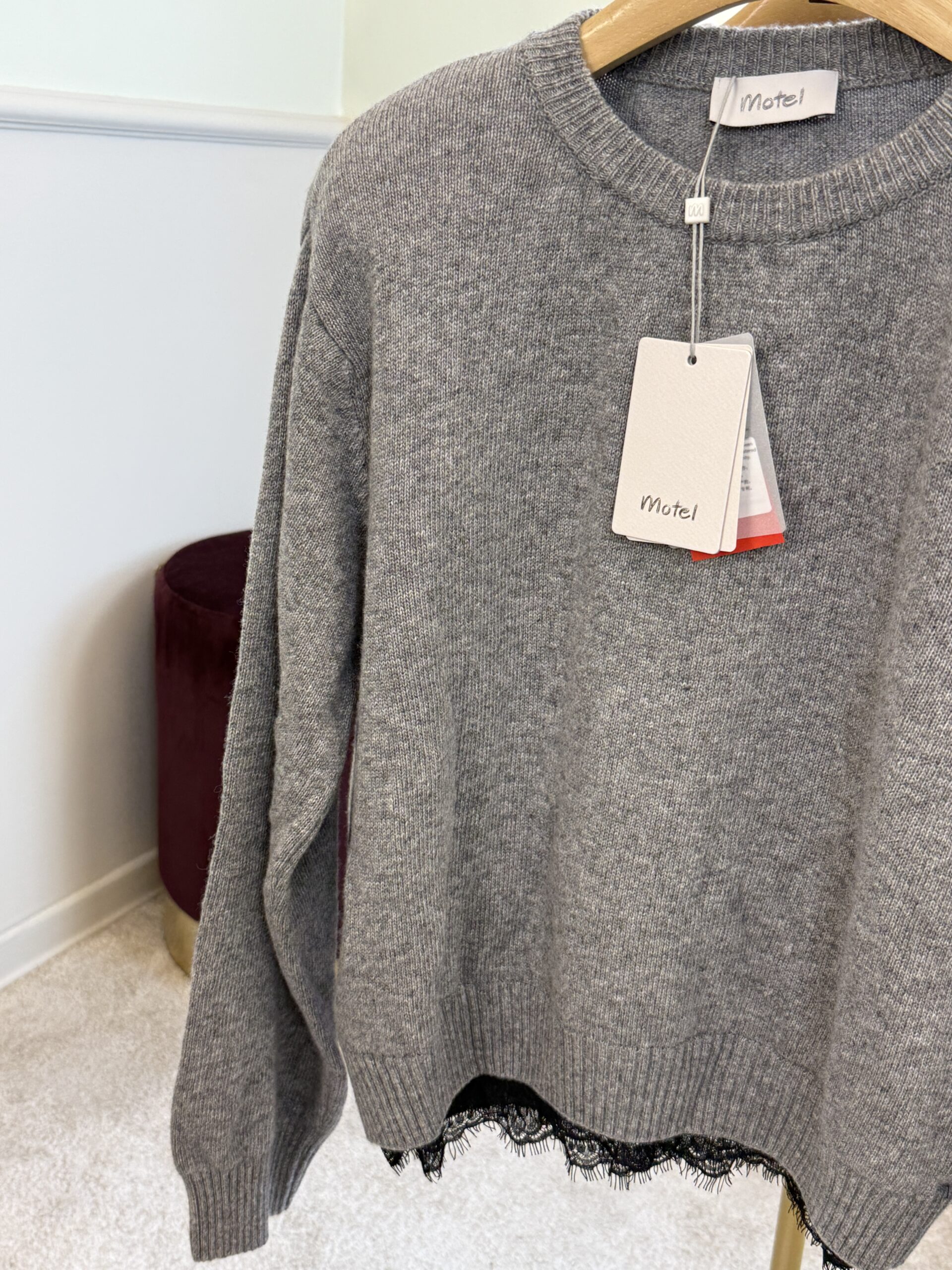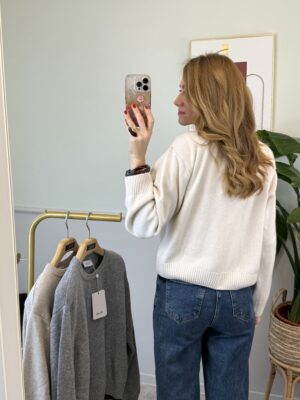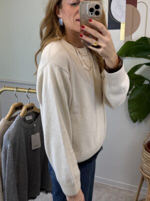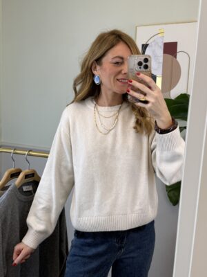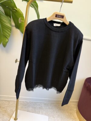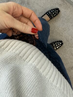 Pull girocollo, modello scatolina, con spallina e pizzo applicato sul bordo dell’ orlo.