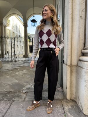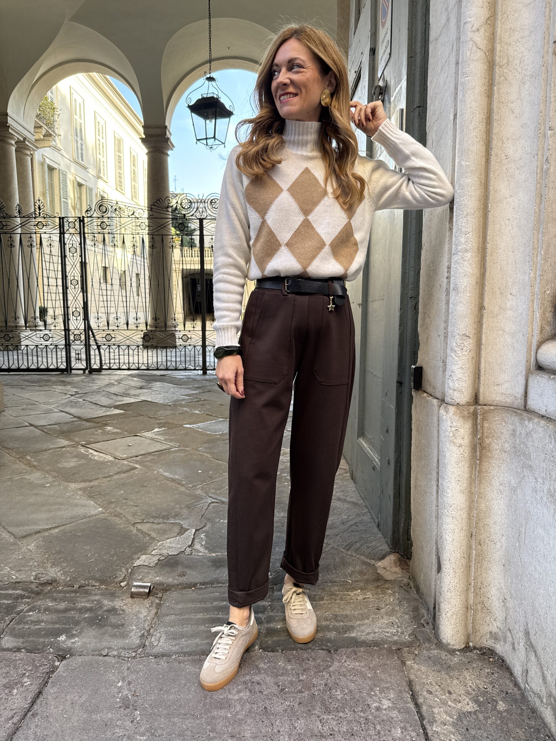 Disponibile in tre varianti colore: grigio con rombi bordeaux, moro con rombi beige e panna con rombi cammello.