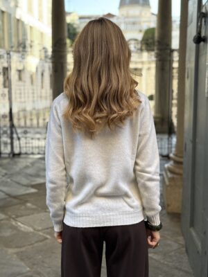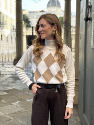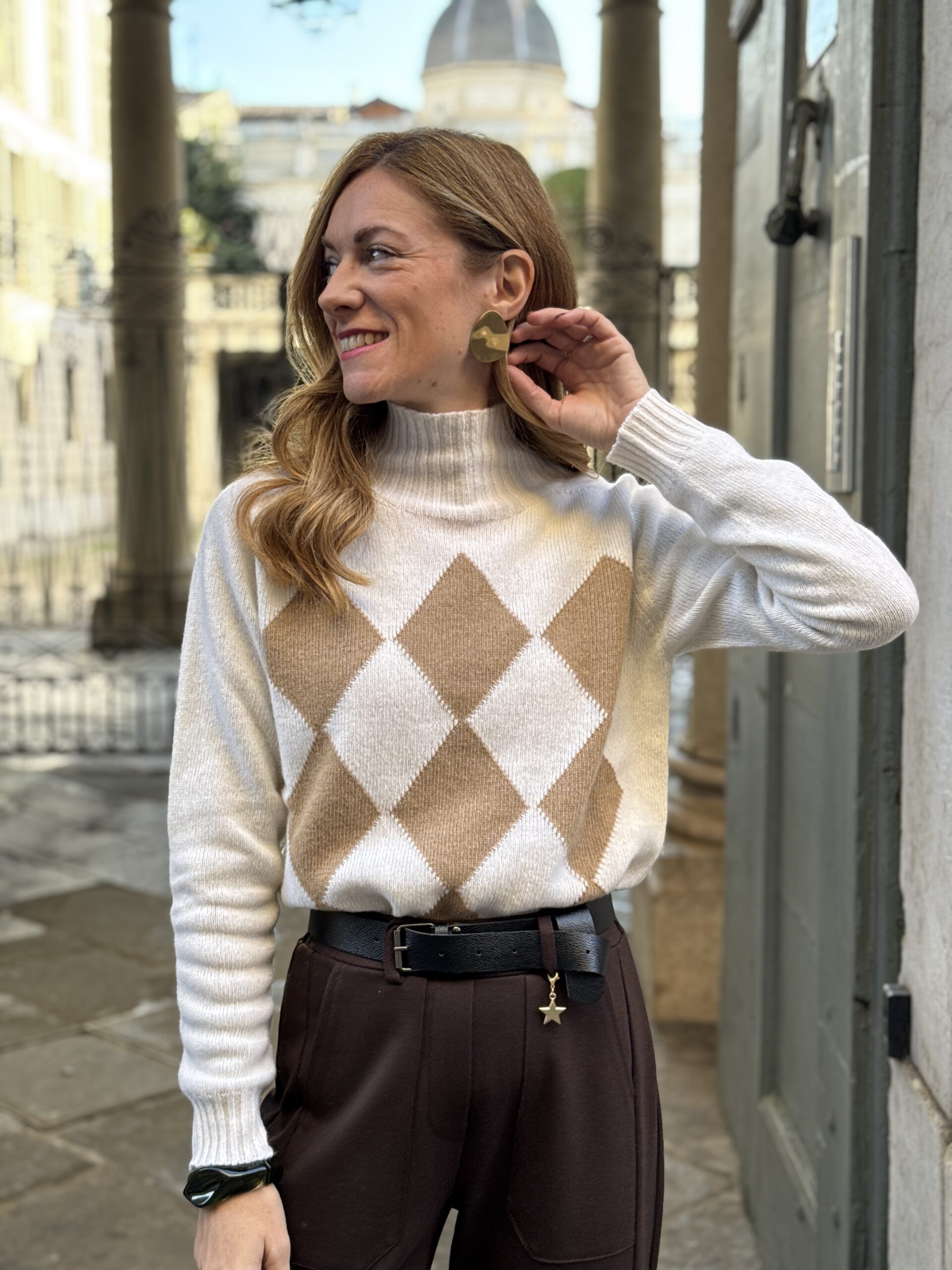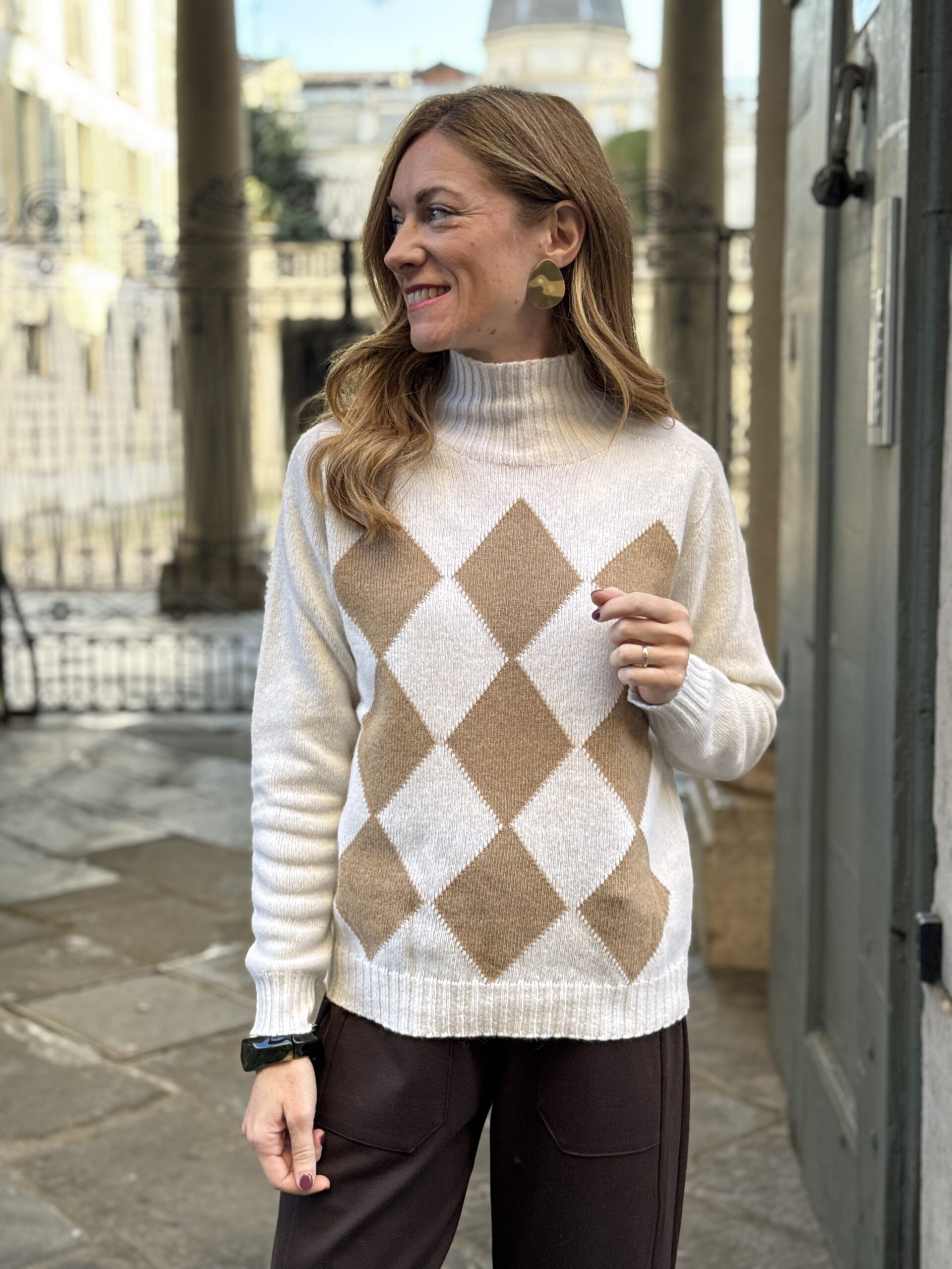 Caldo pull con 70% di lana, collo a cratere e fantasia a rombi a contrasto.