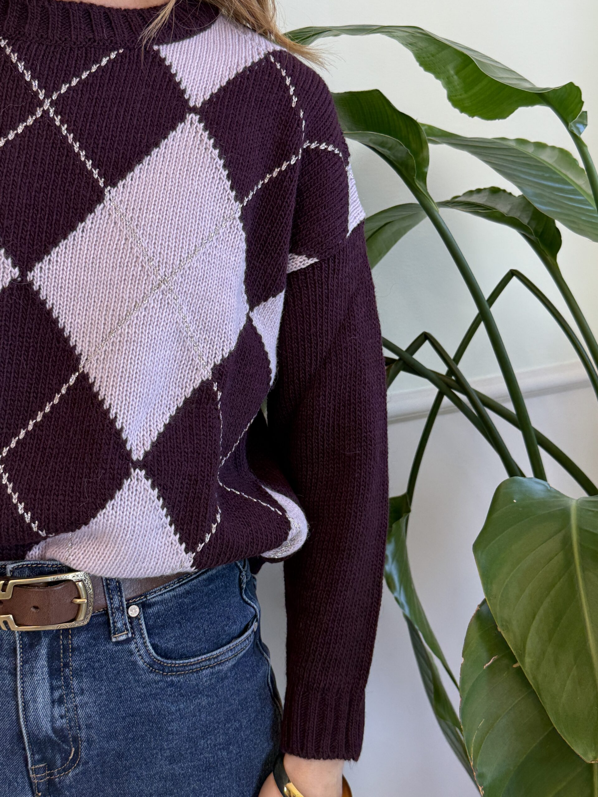 Pull girocollo a scatolina con spalla scesa in fantasia rombi con fili di lurex argento.