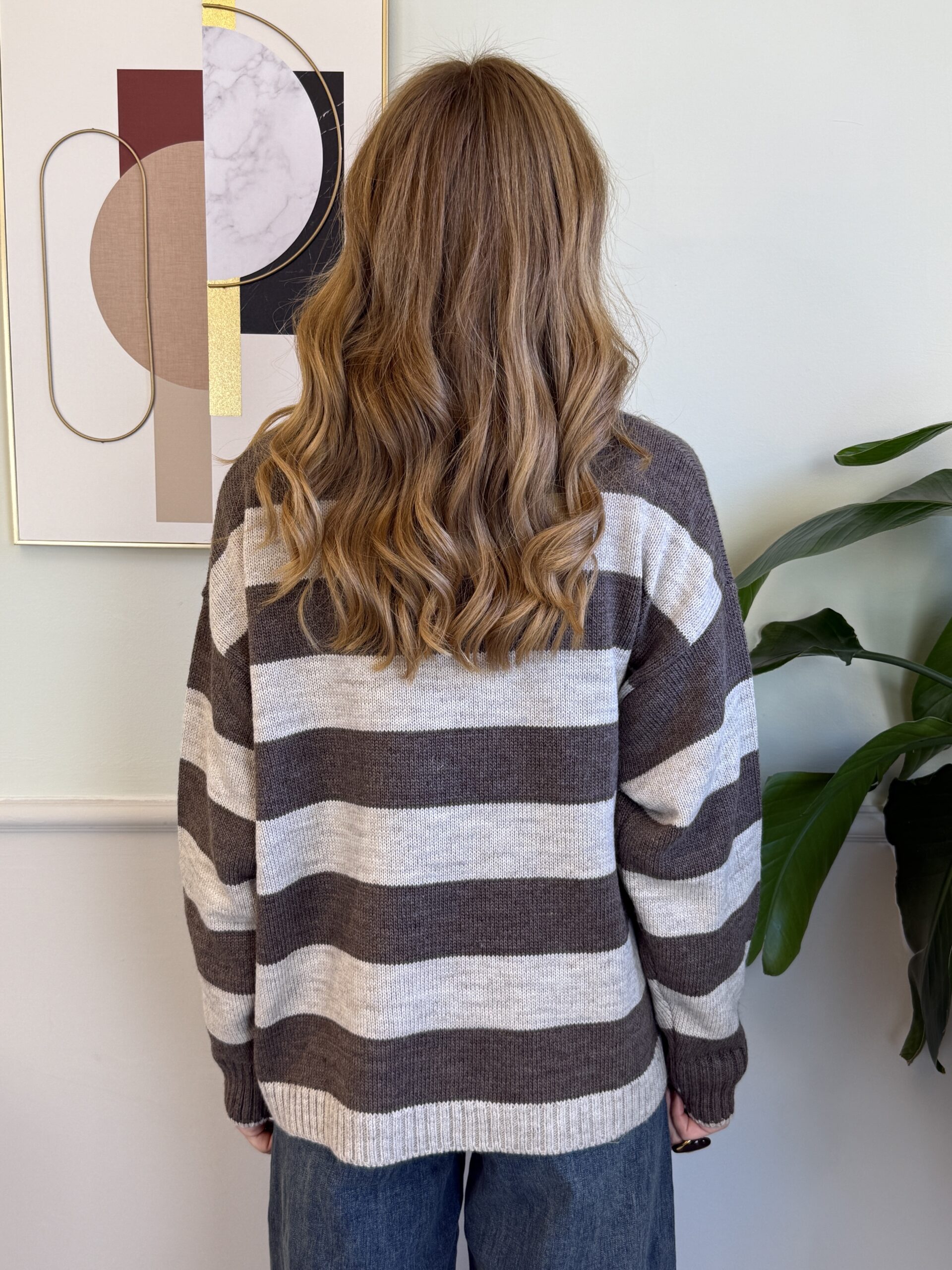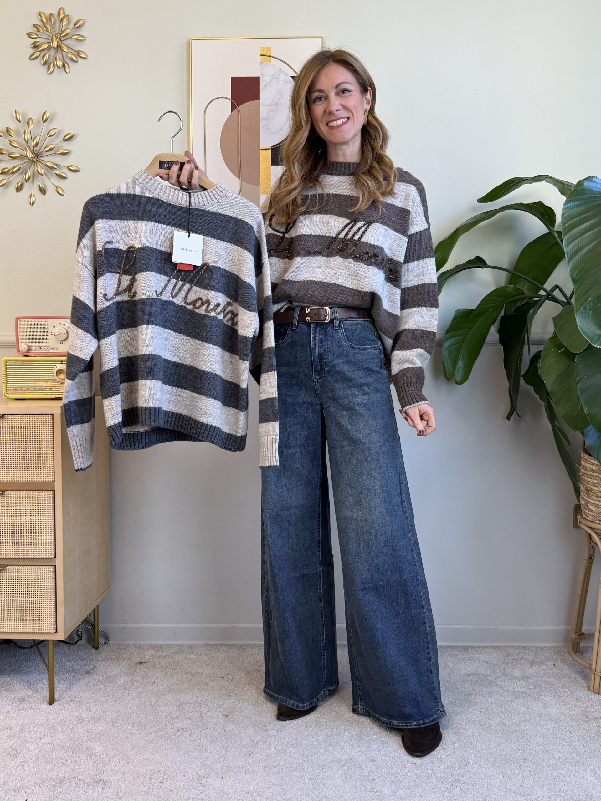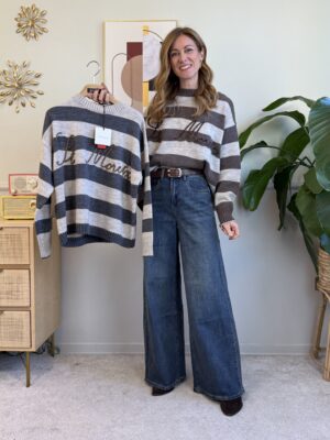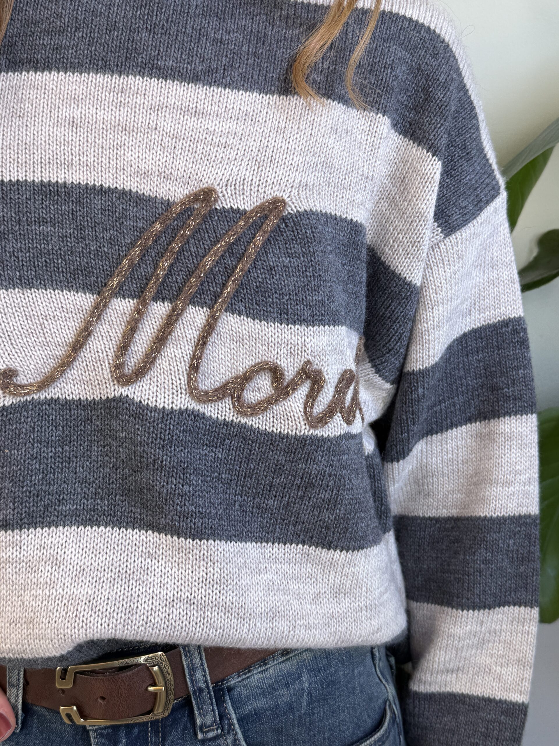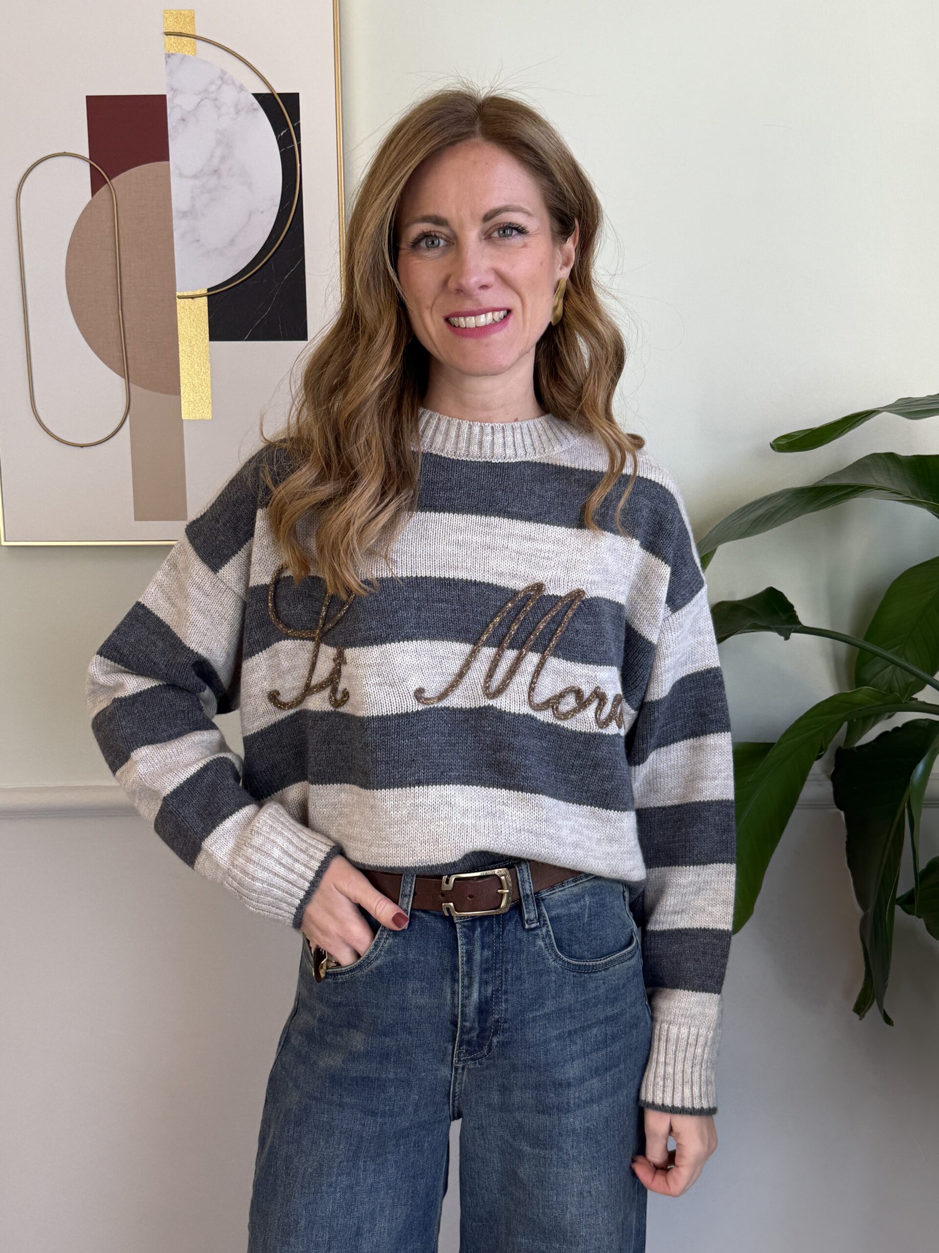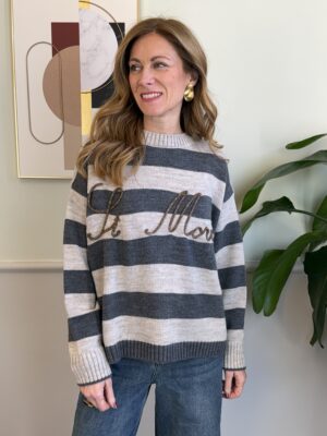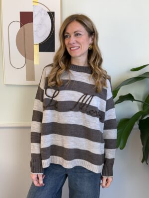 Pull girocollo a righe con scritta dorata “St Moritz”, manica lunga e spalla scesa.