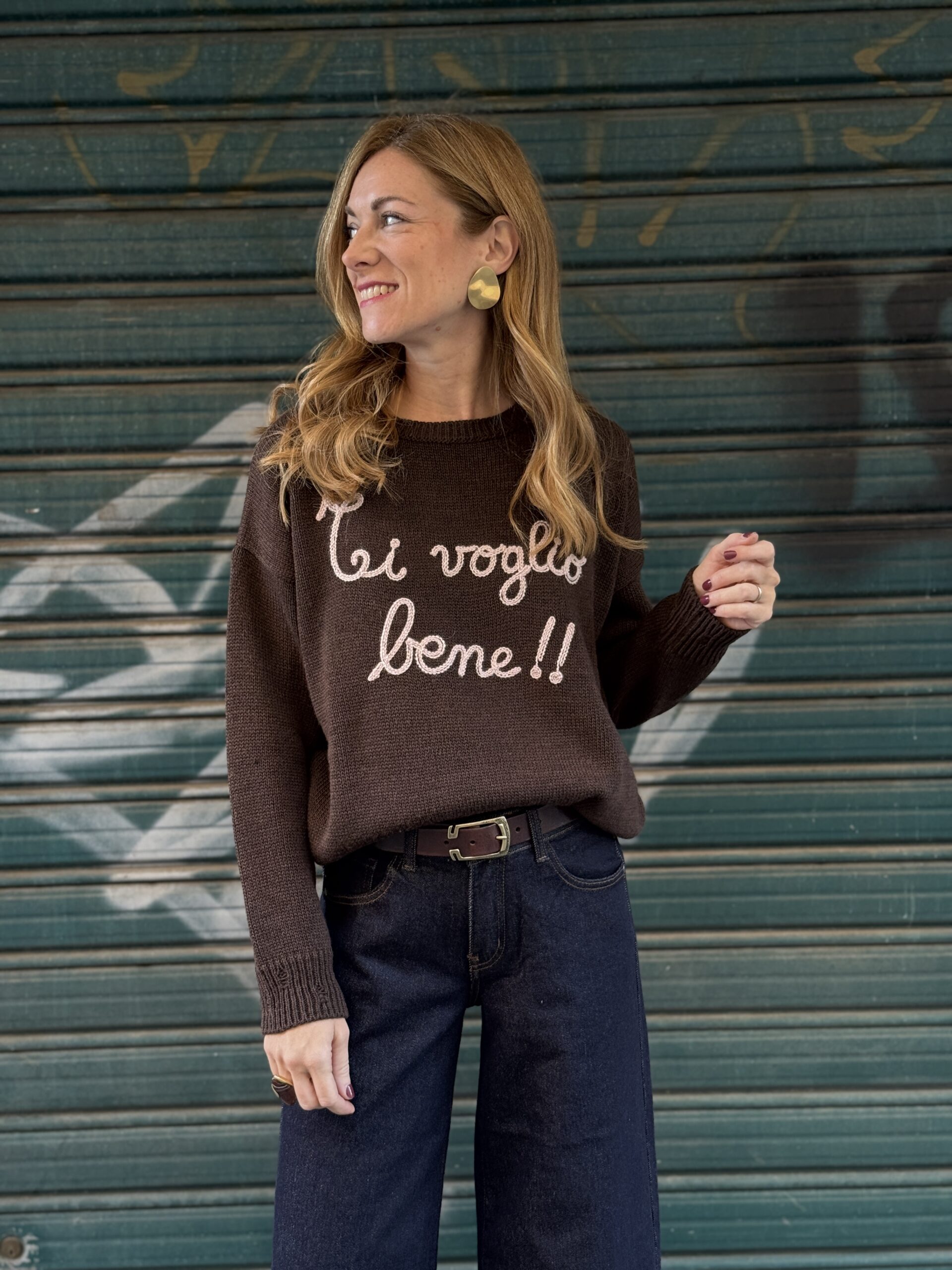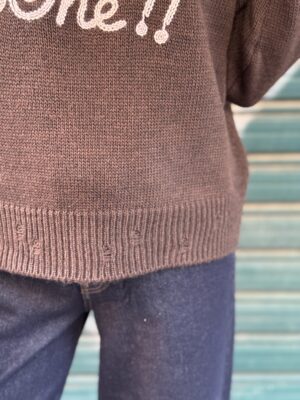 Pull girocollo, base marrone, scritta ricamata rosa.