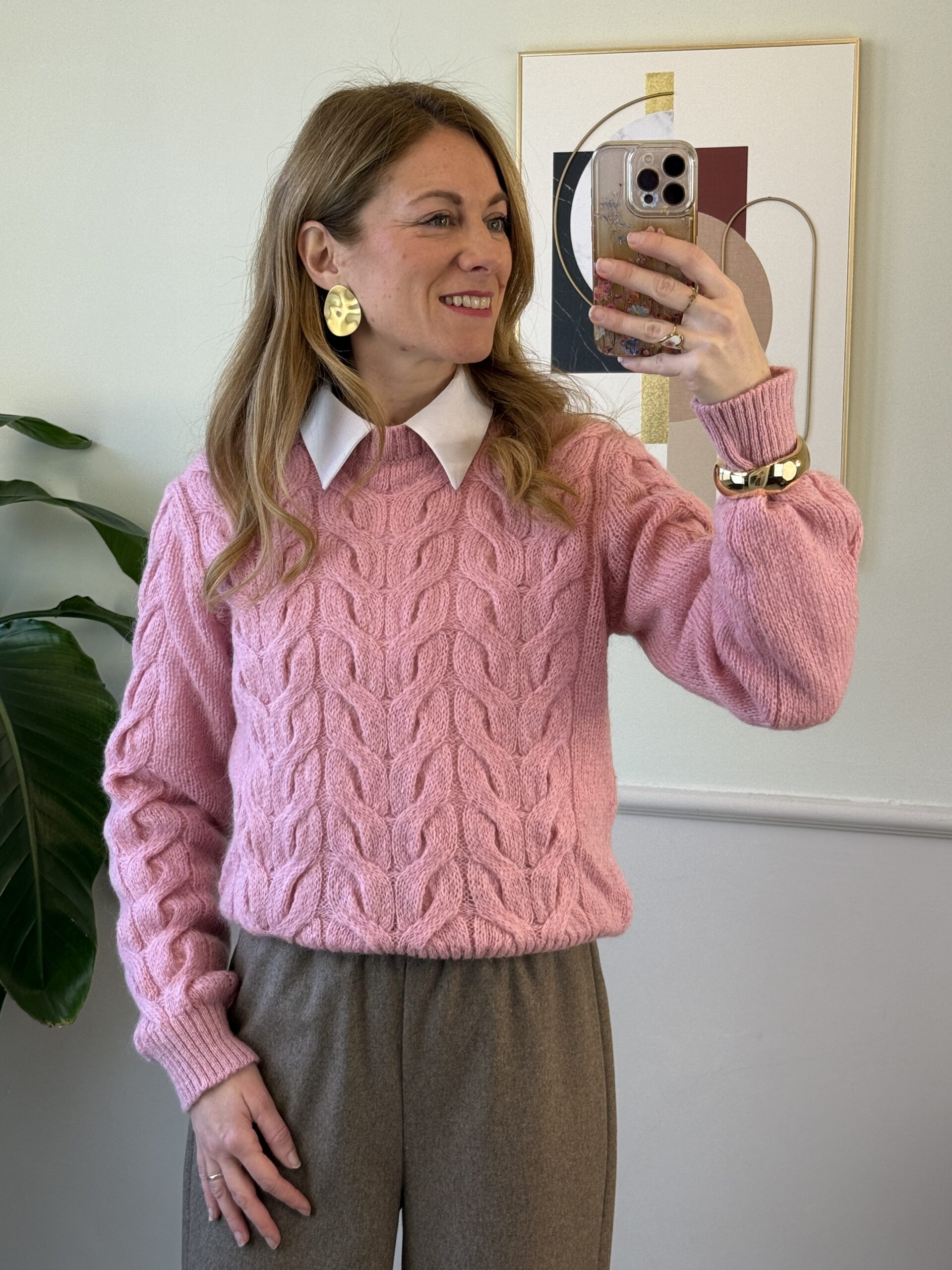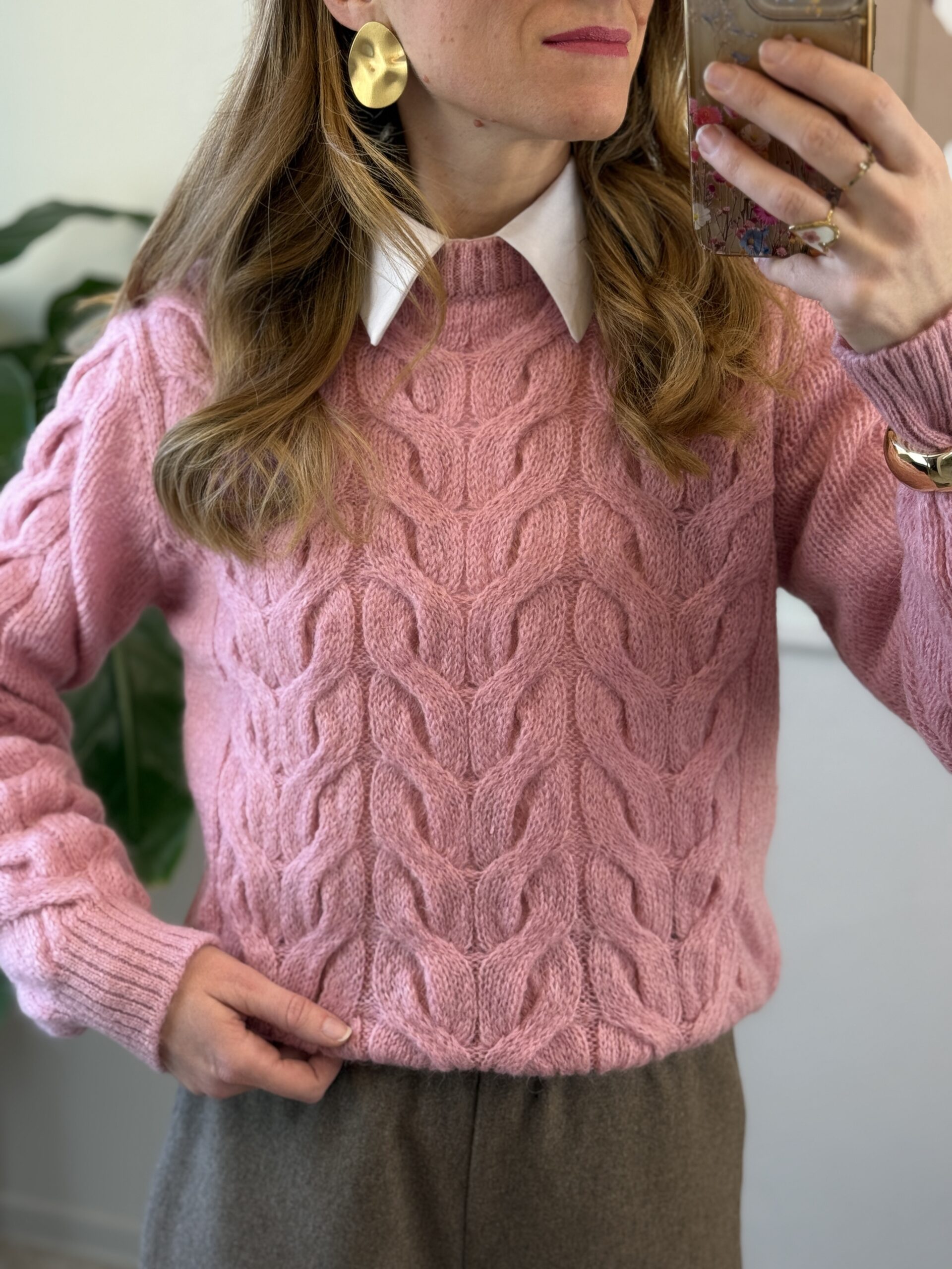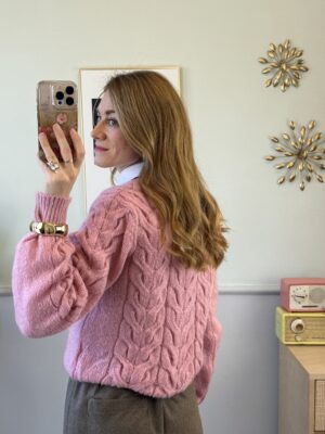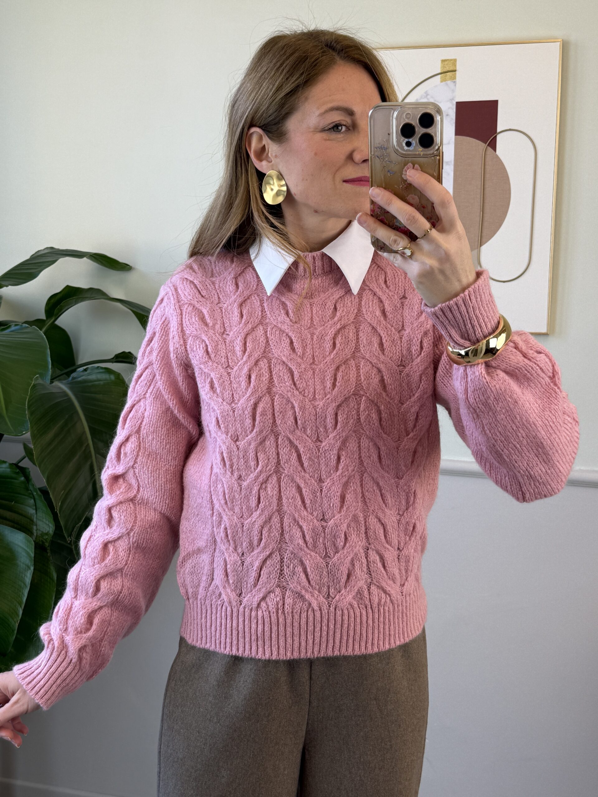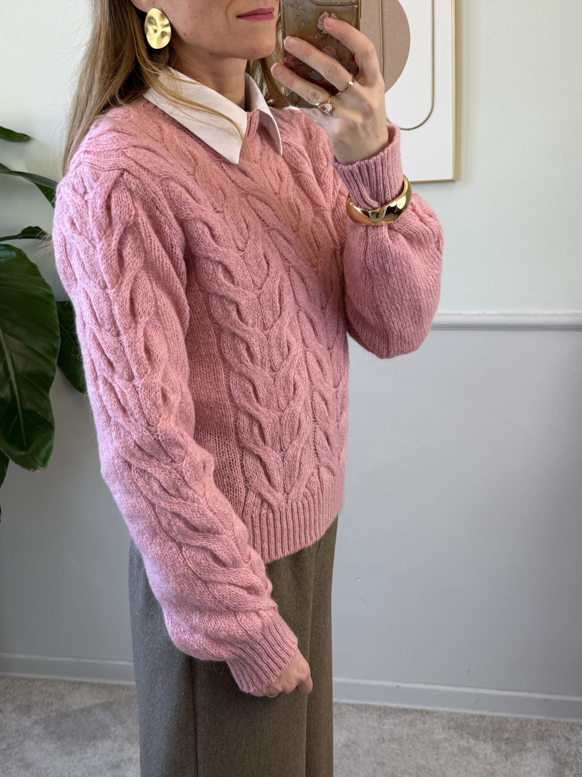 Pull girocollo lavorazione intrecciata misto lana mohair.