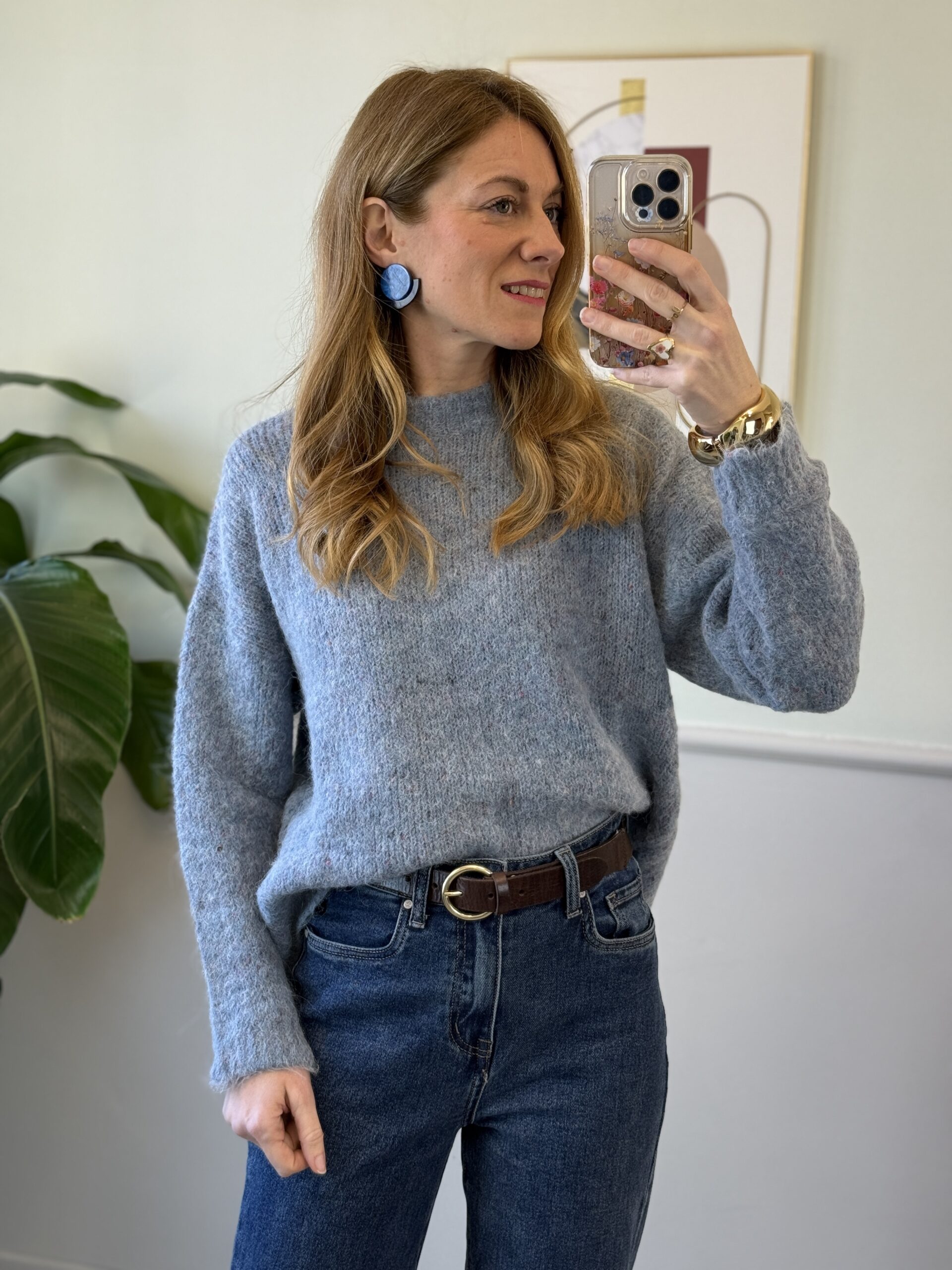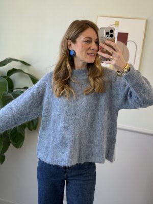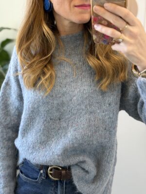 Pull girocollo in tessuto tweed misto lana, modello scatolina con spalla scesa.