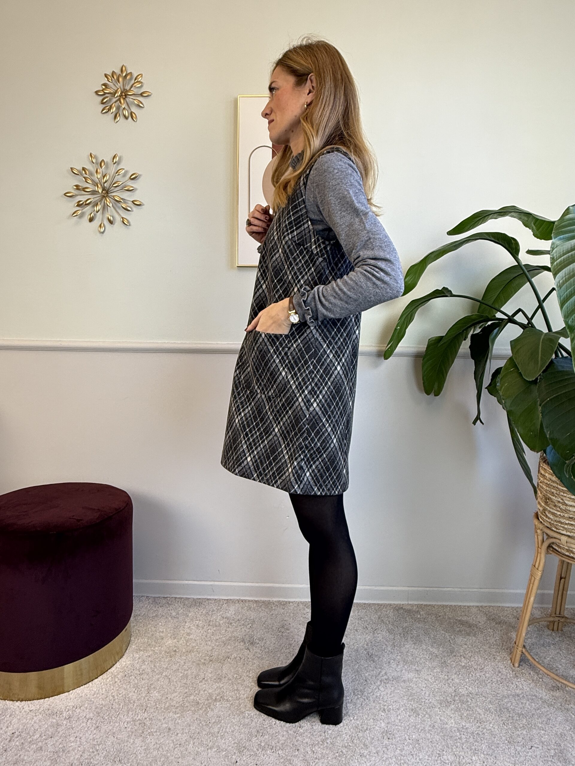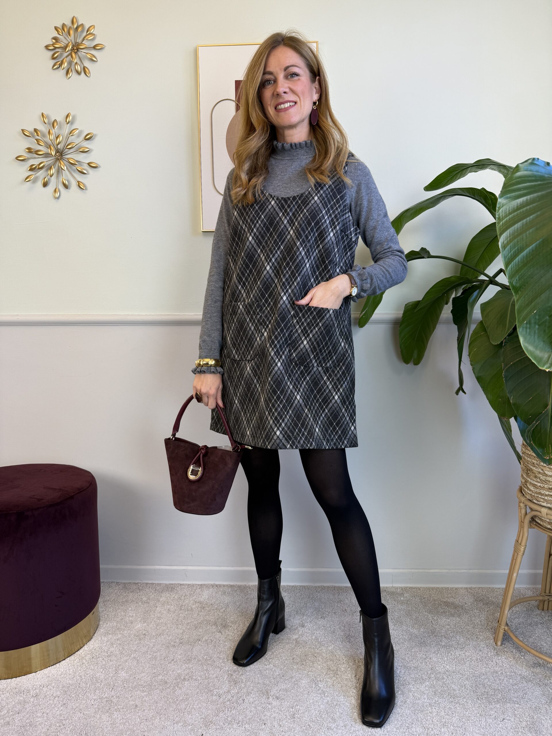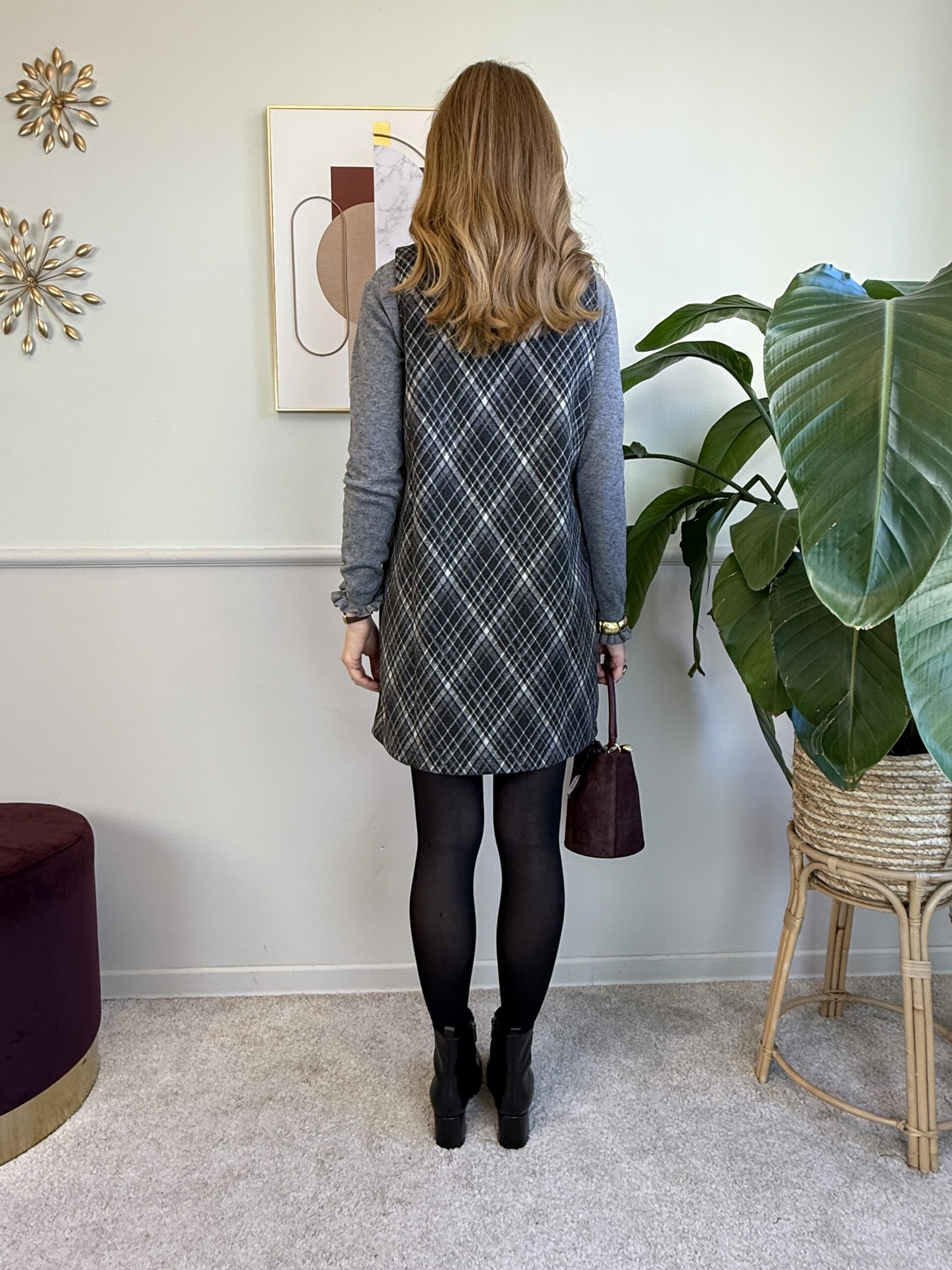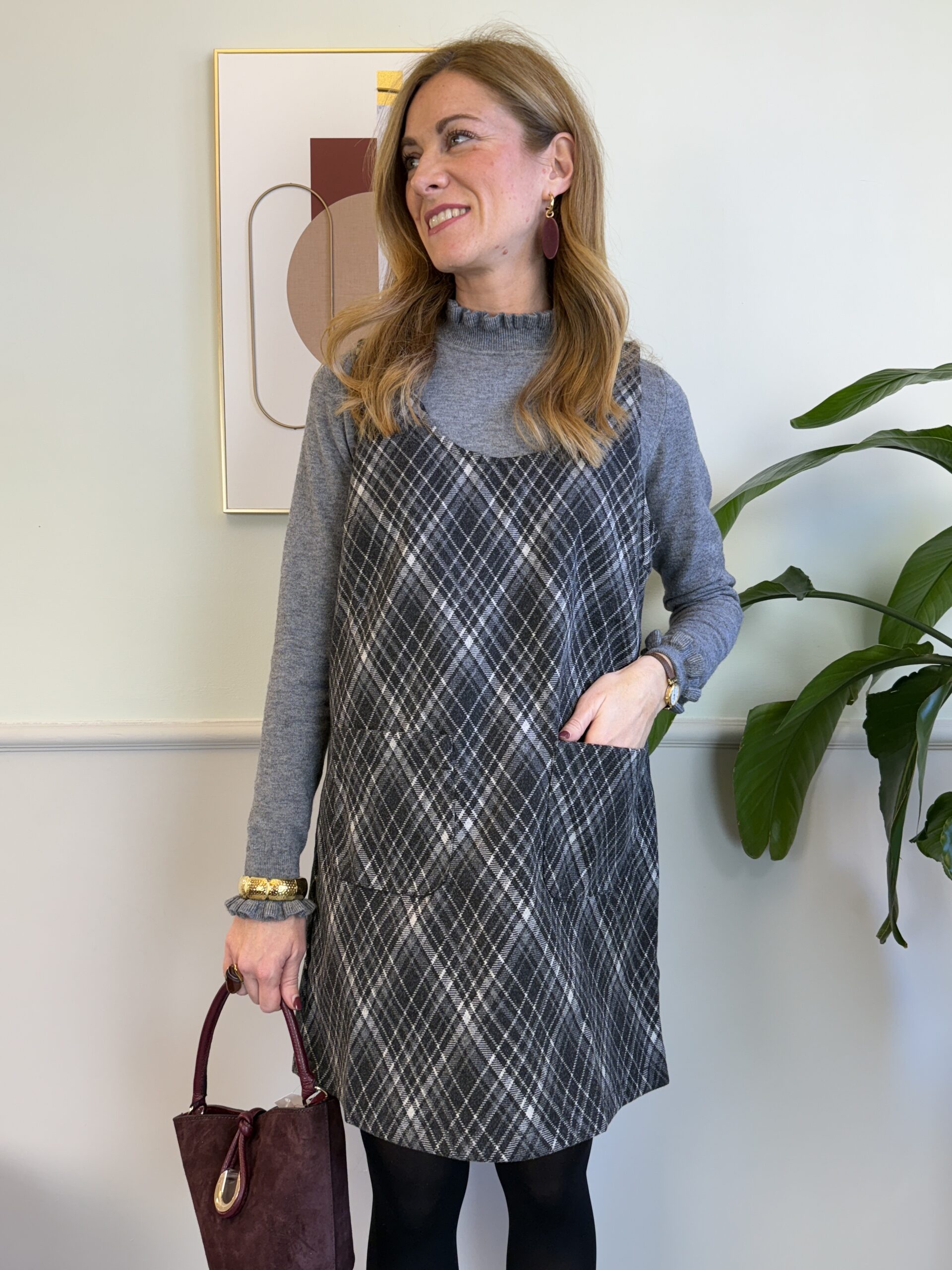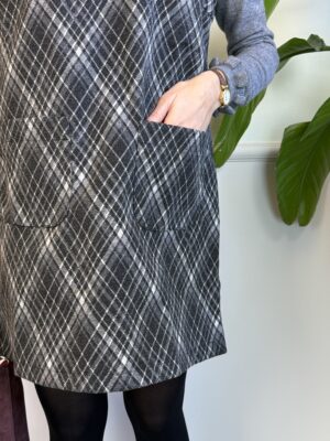 Abitino scamiciato con motivo a rombi sui toni del grigio.