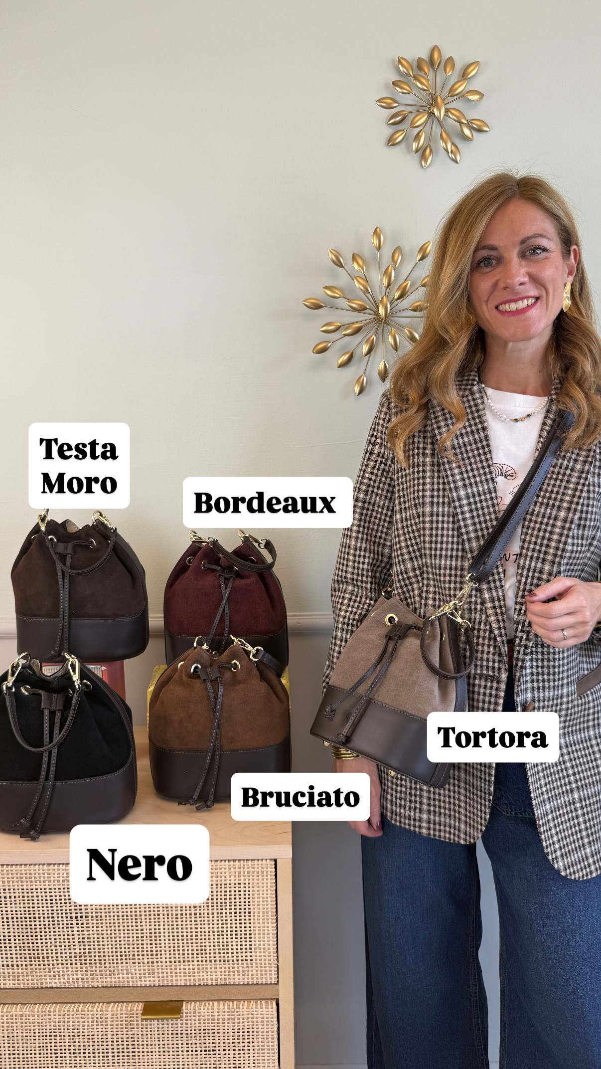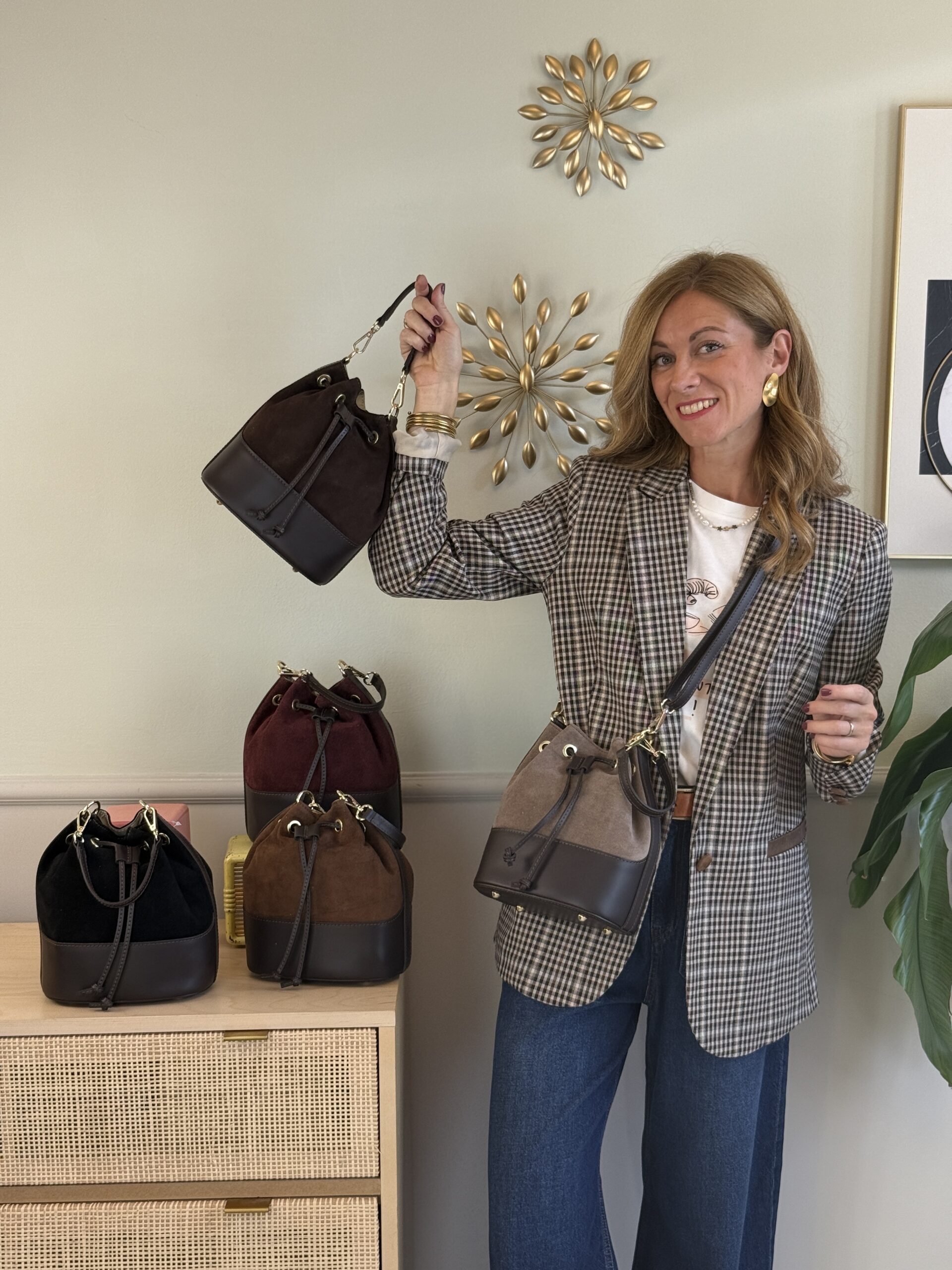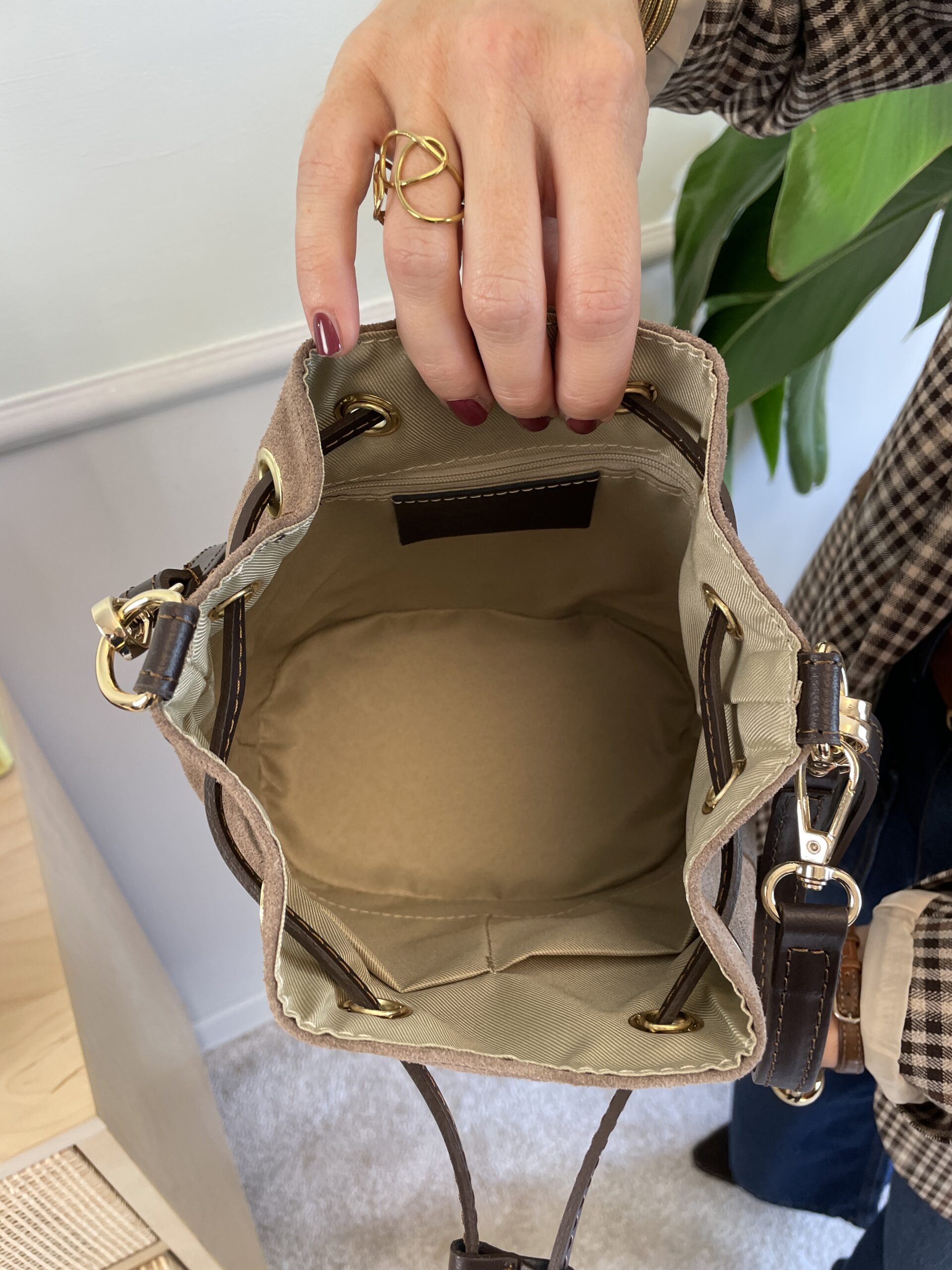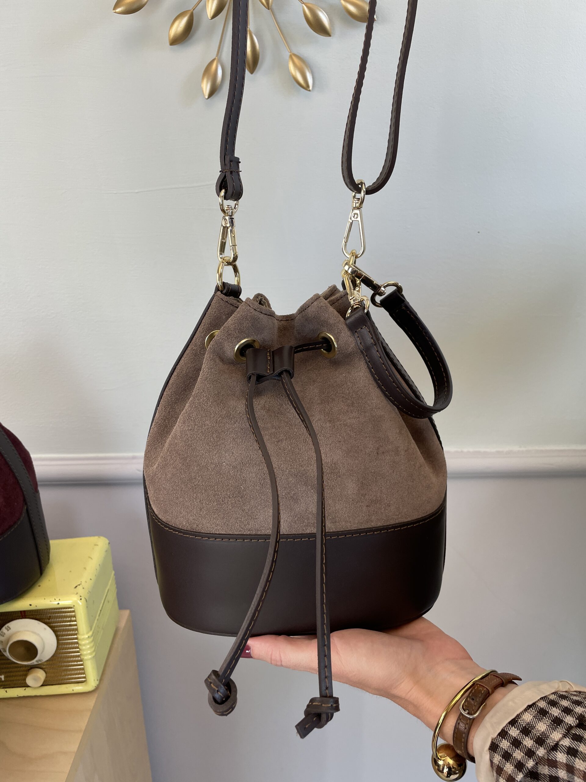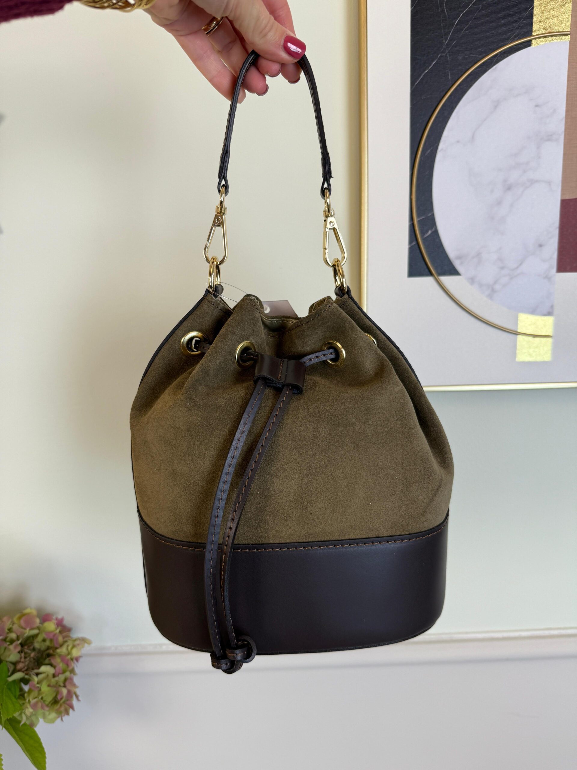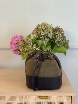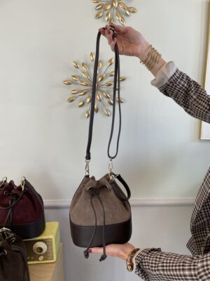Borsa secchiello in pelle e camoscio, interno foderato