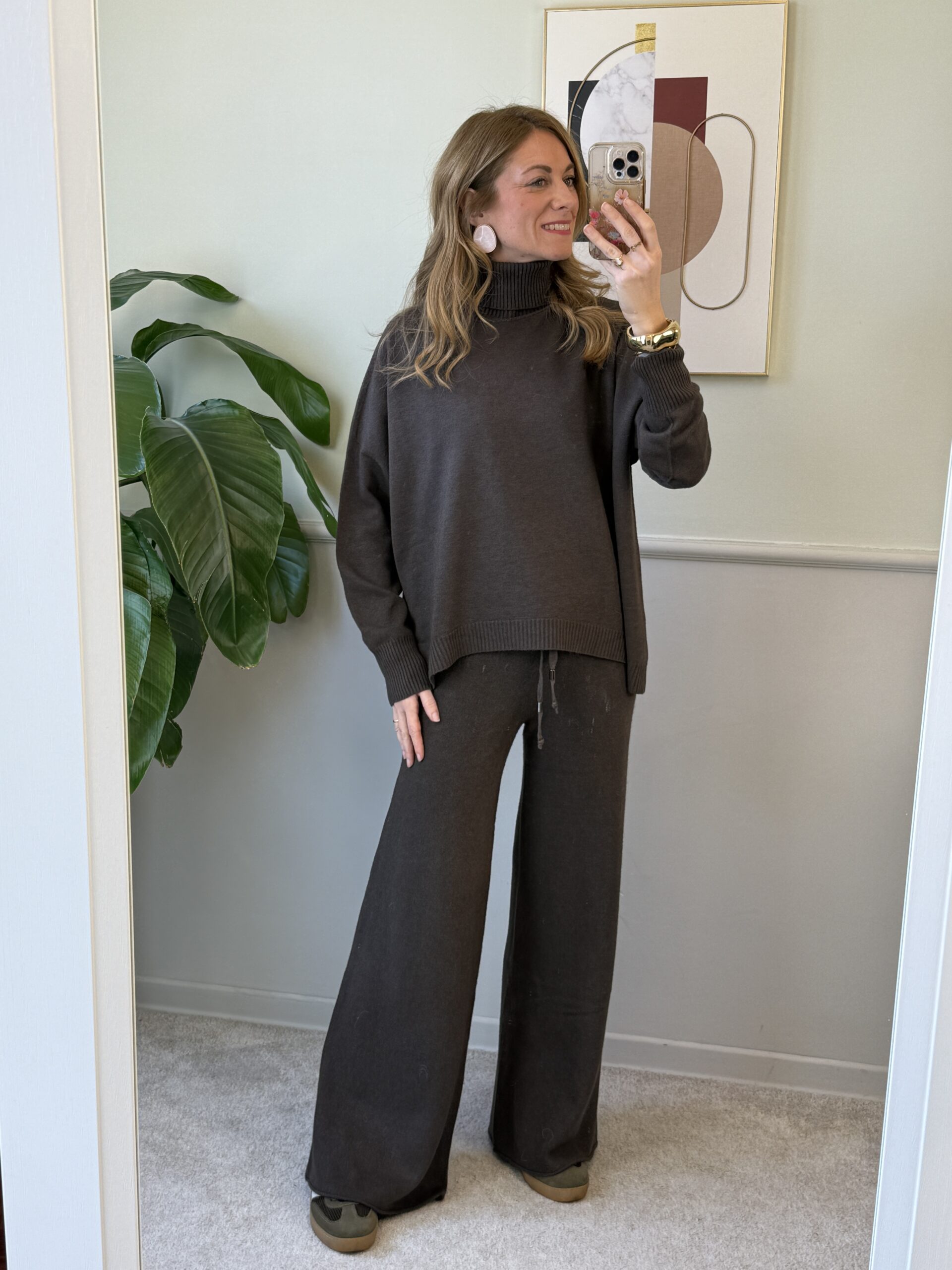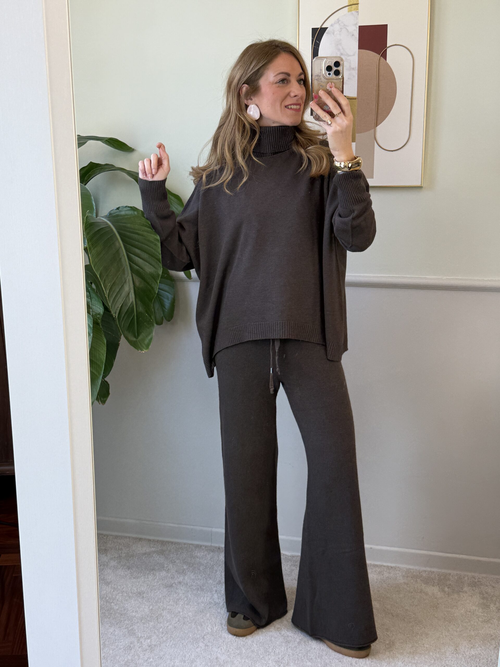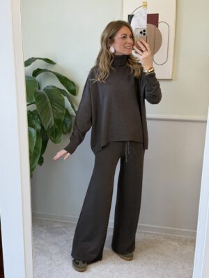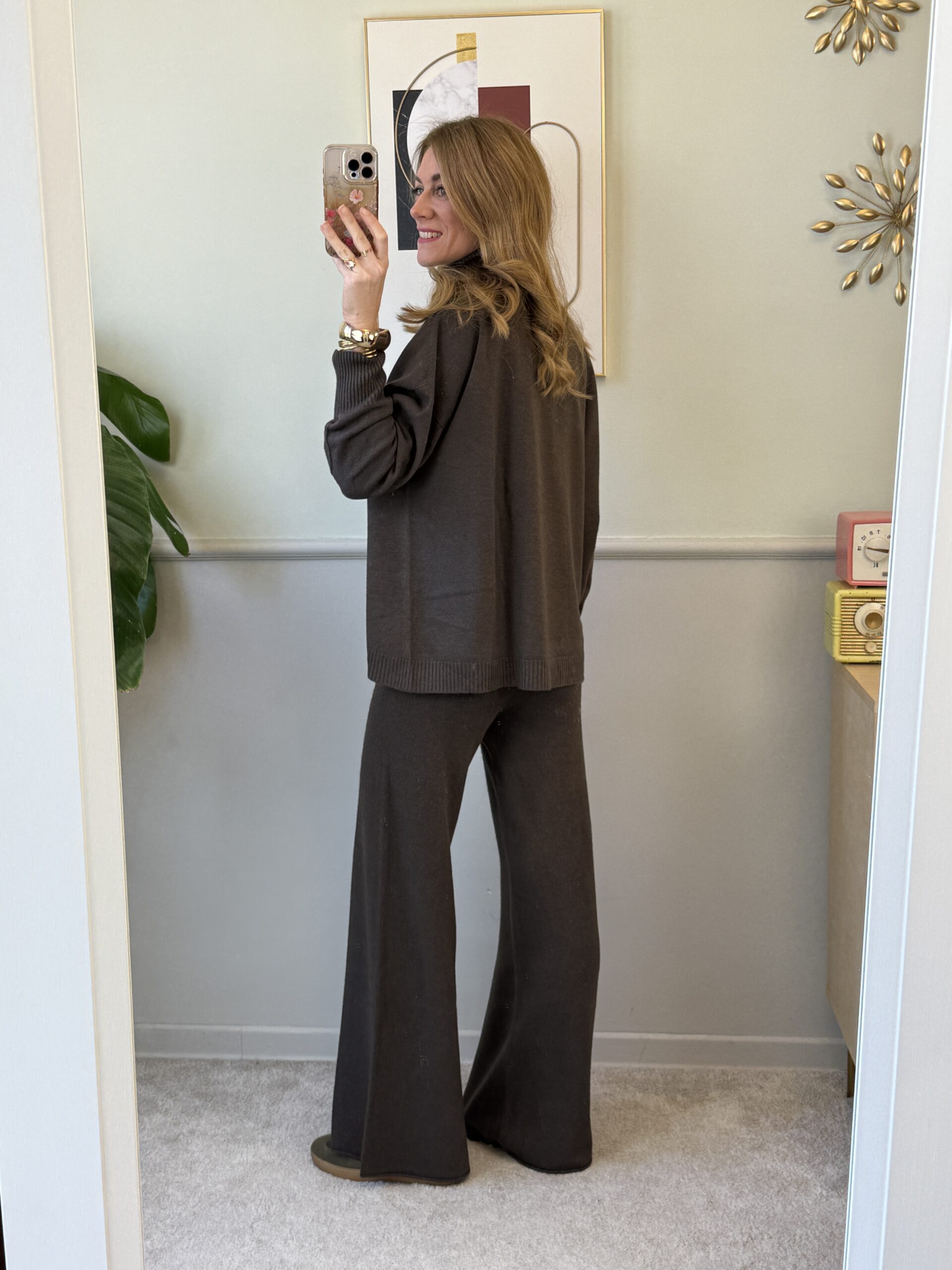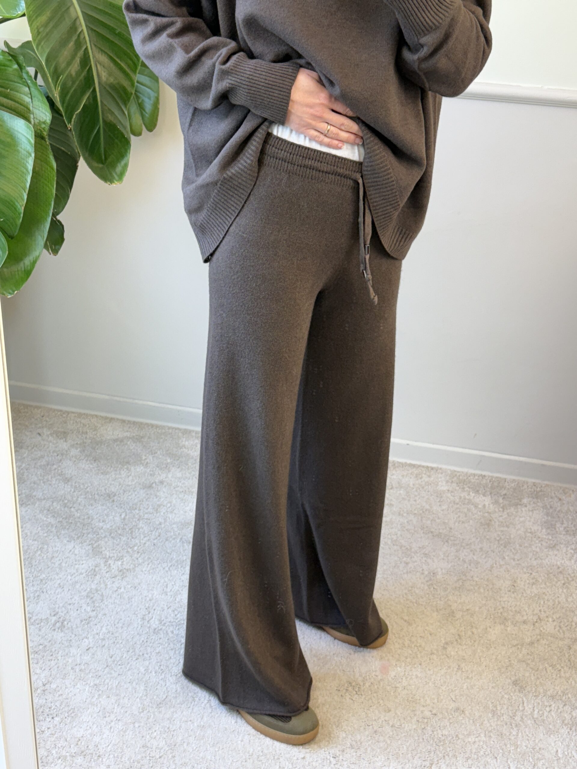 -Pantalone in maglia leggermente svasato al fondo, vita alta con coulisse.