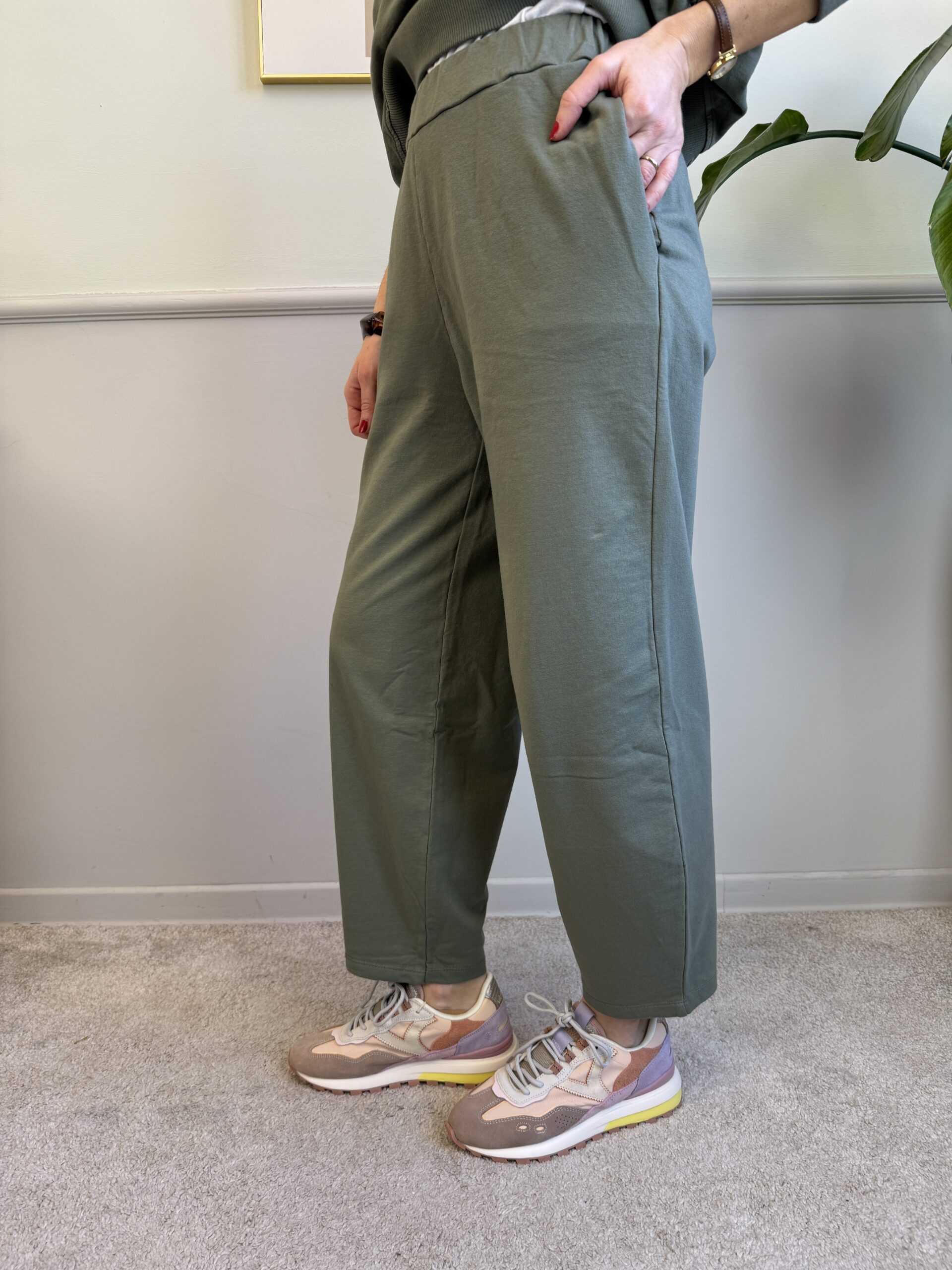 -Panta barrel con gamba ampia che si stringe alla caviglia, elastico in vita e tasche laterali invisibili.