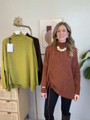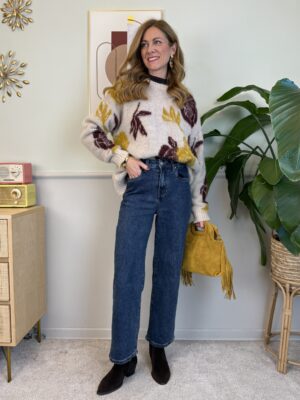 -Maglia girocollo con spalla scesa e manica leggermente a palloncino.