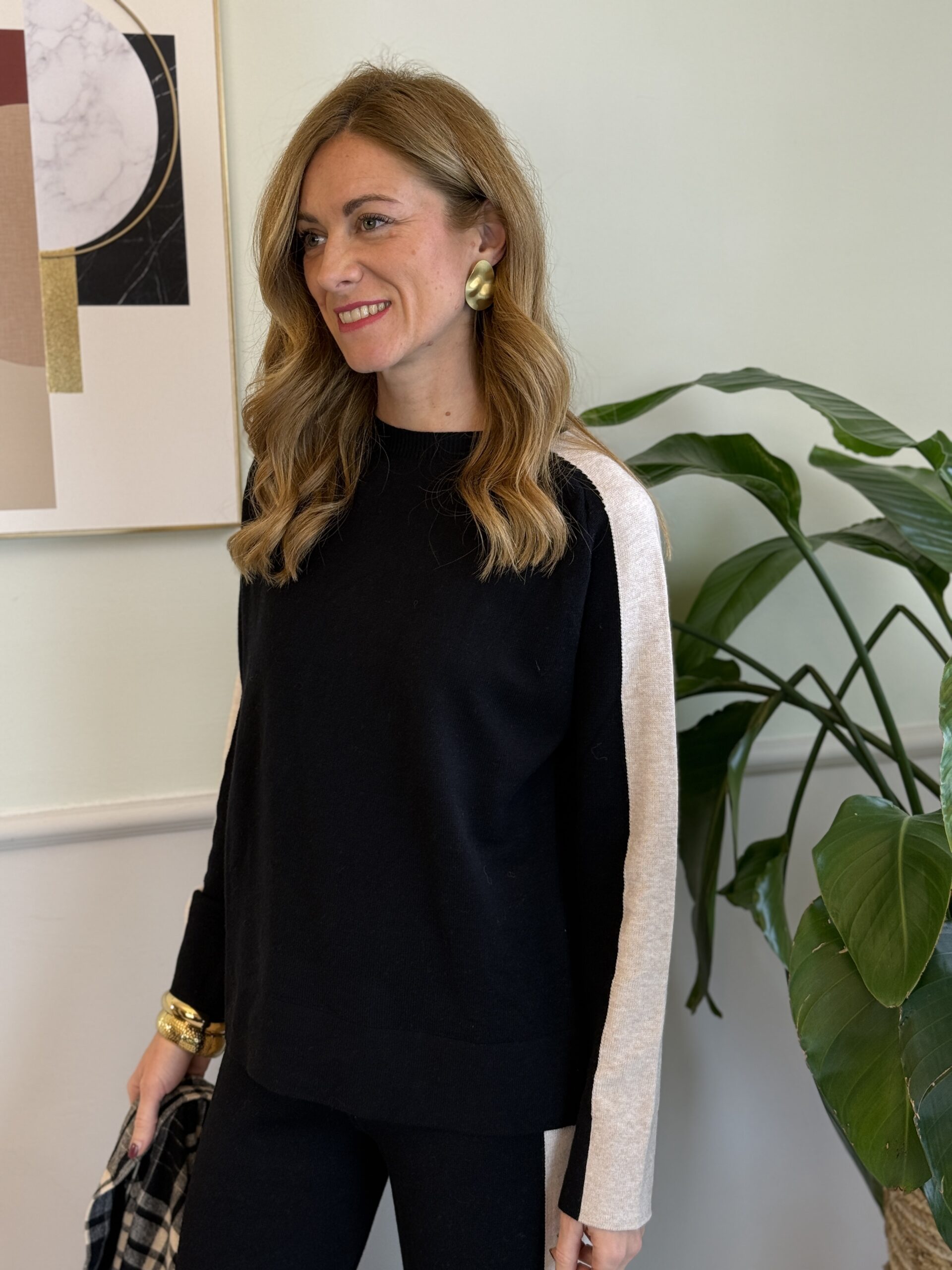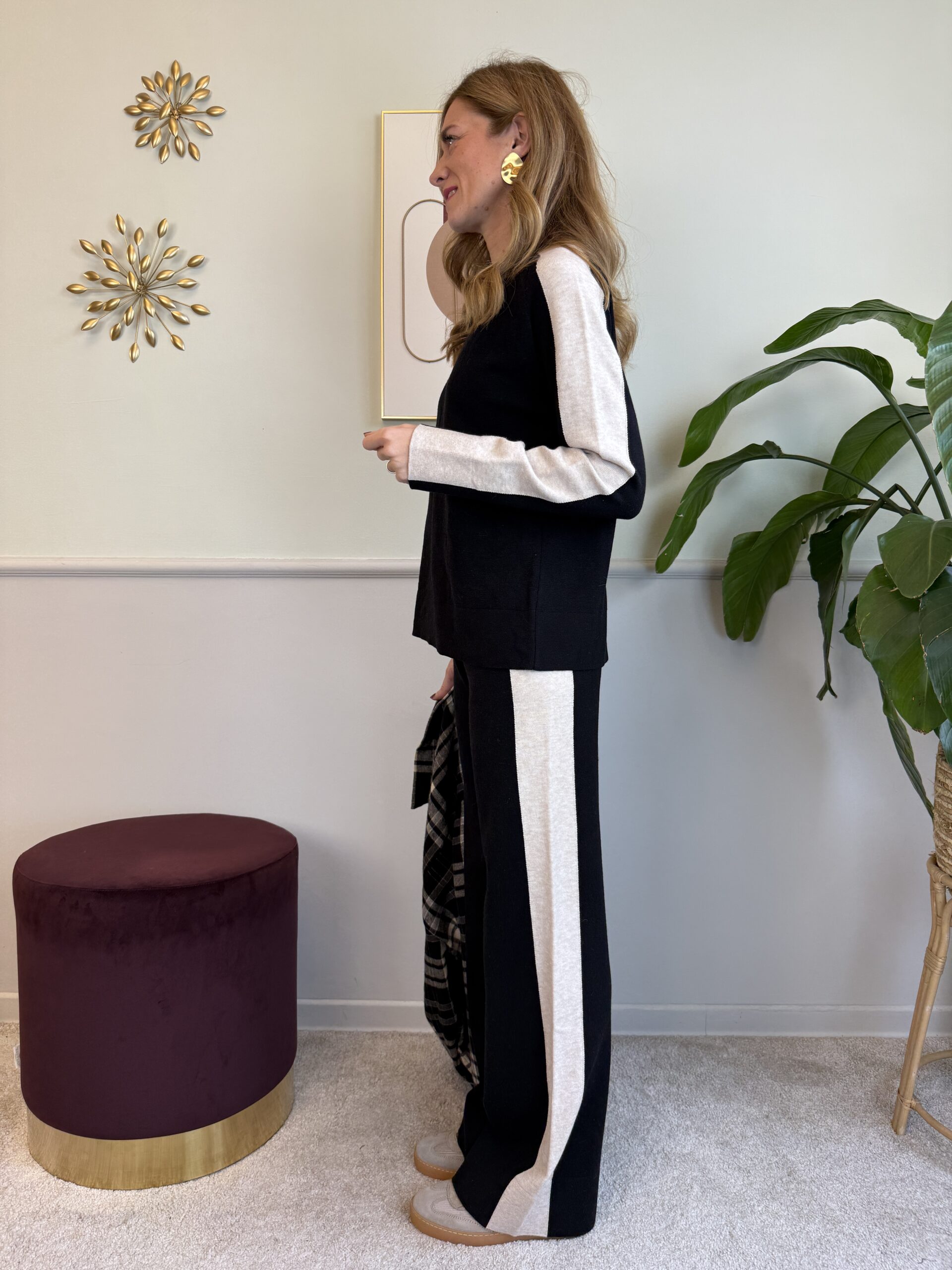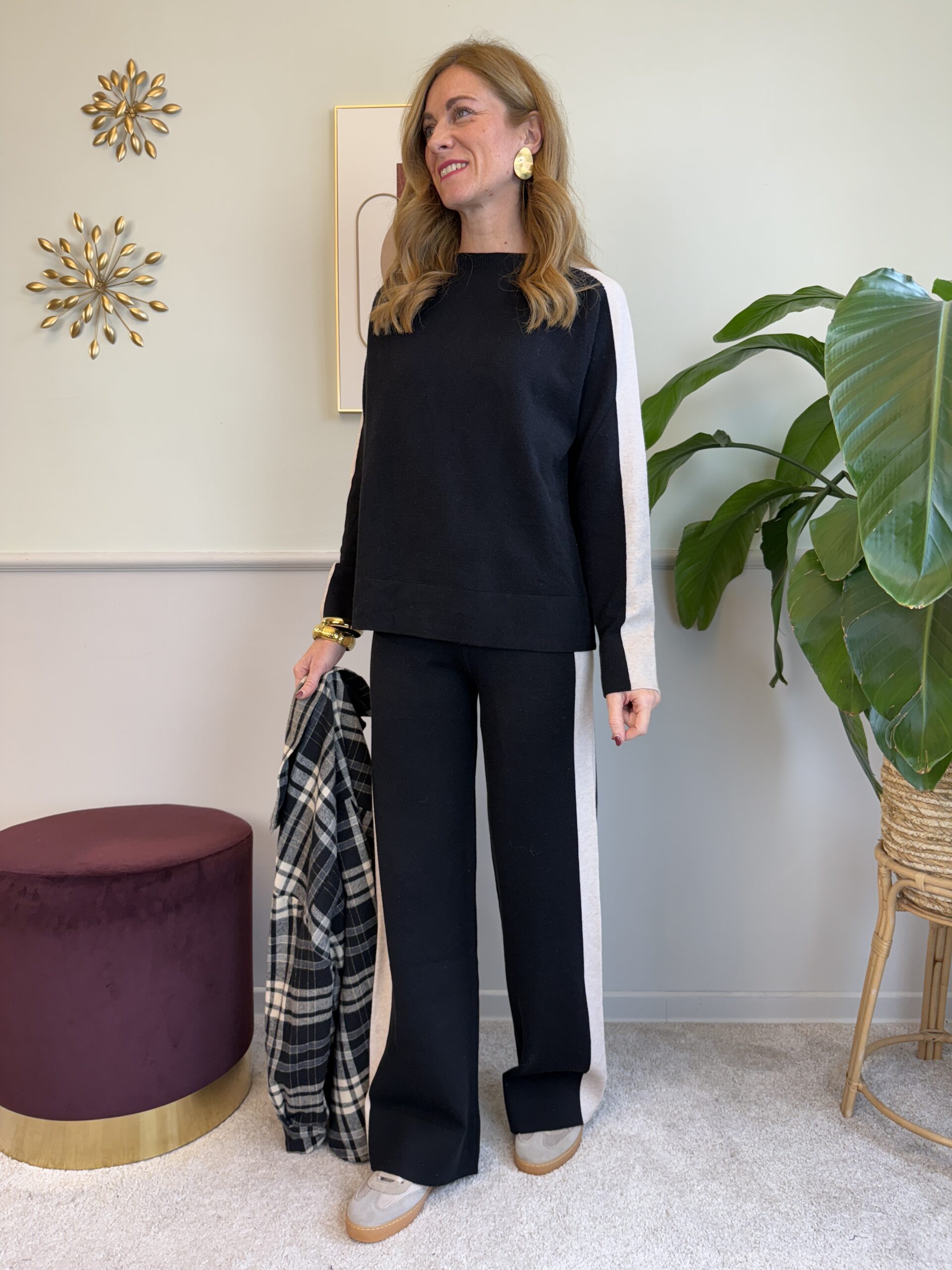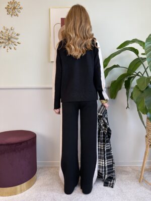Set in maglia nero con banda color panna composto da pantaloni con elastico in vita e maglioncino a scatolina.