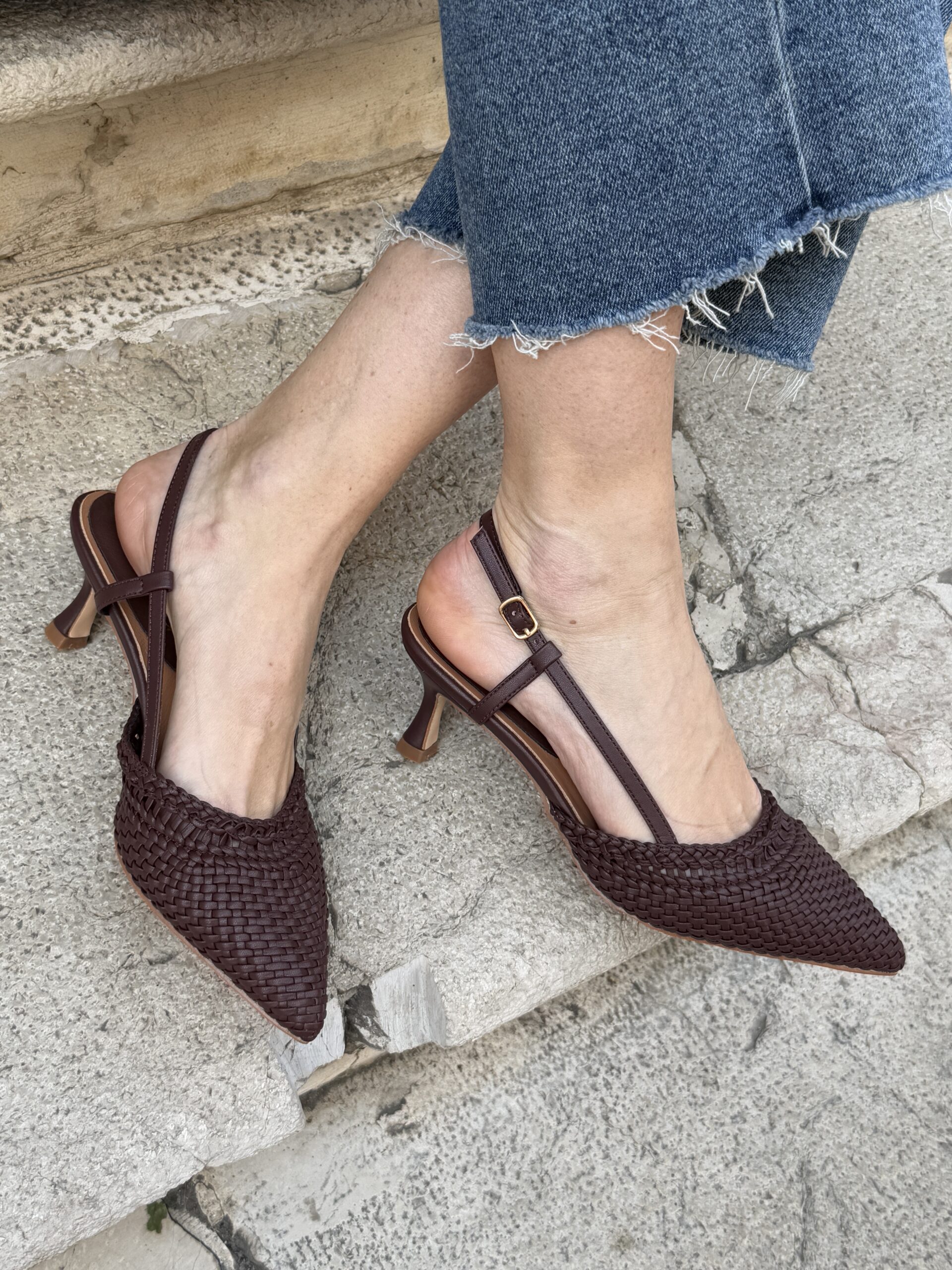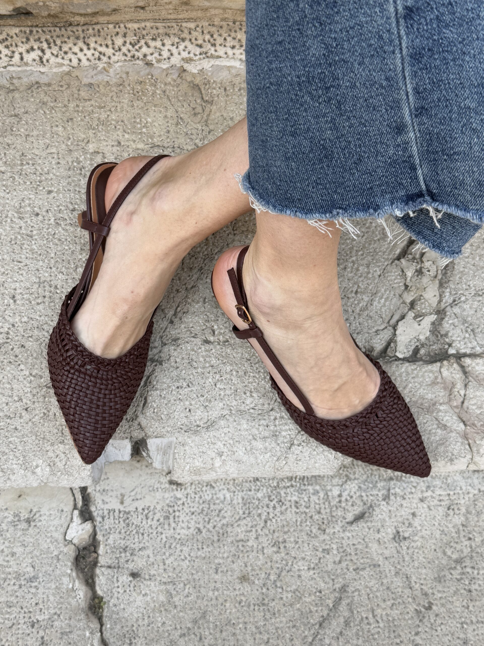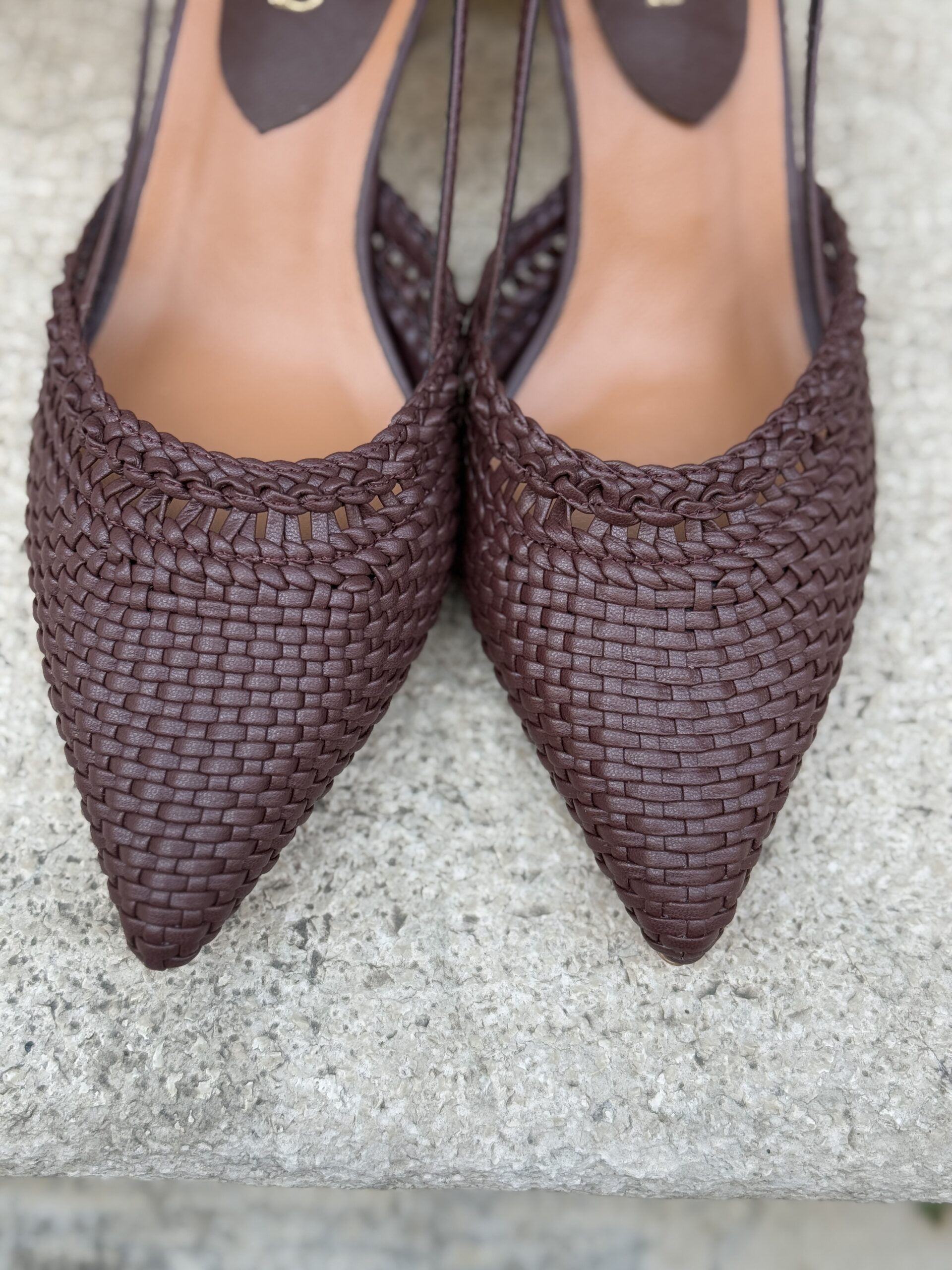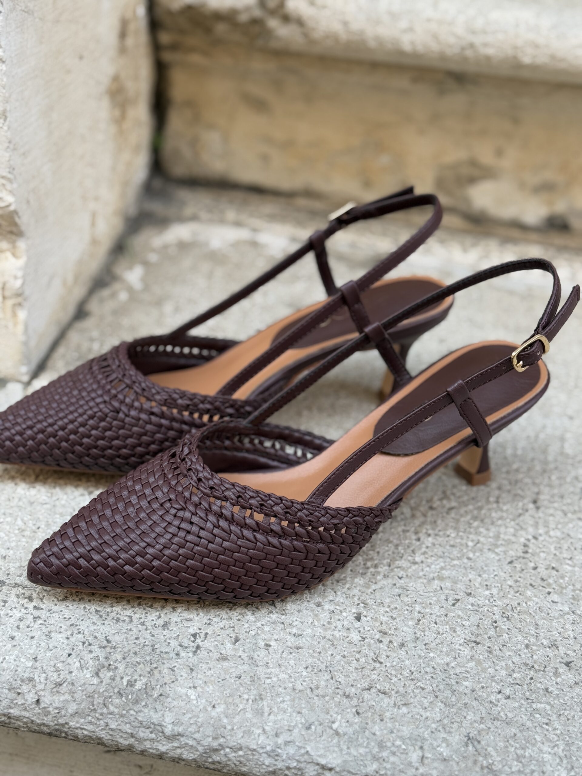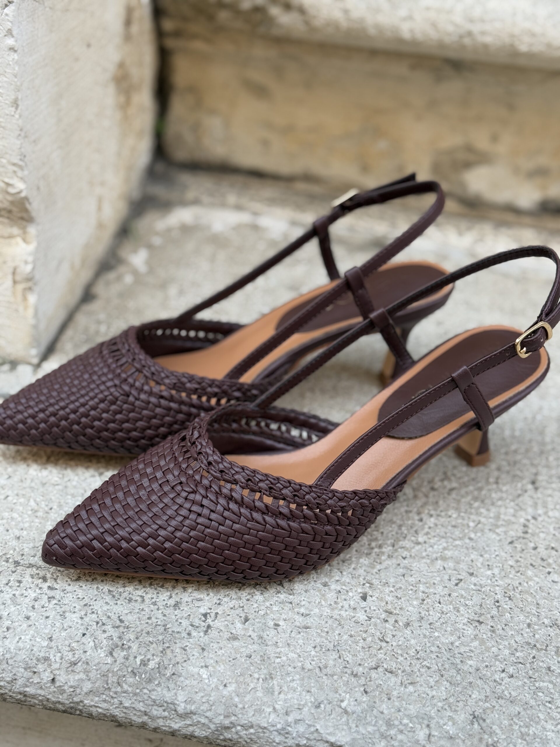 Sling back a punta in eco-pelle intrecciata, cinturino alla caviglia regolabile.