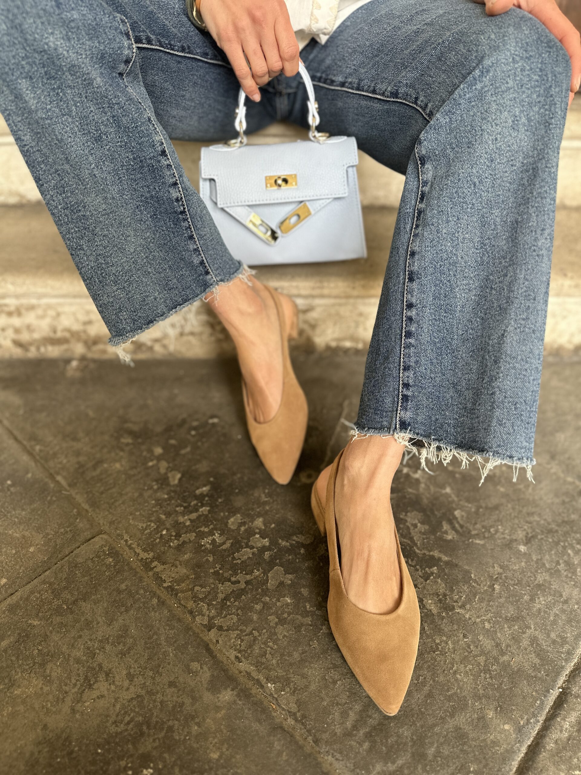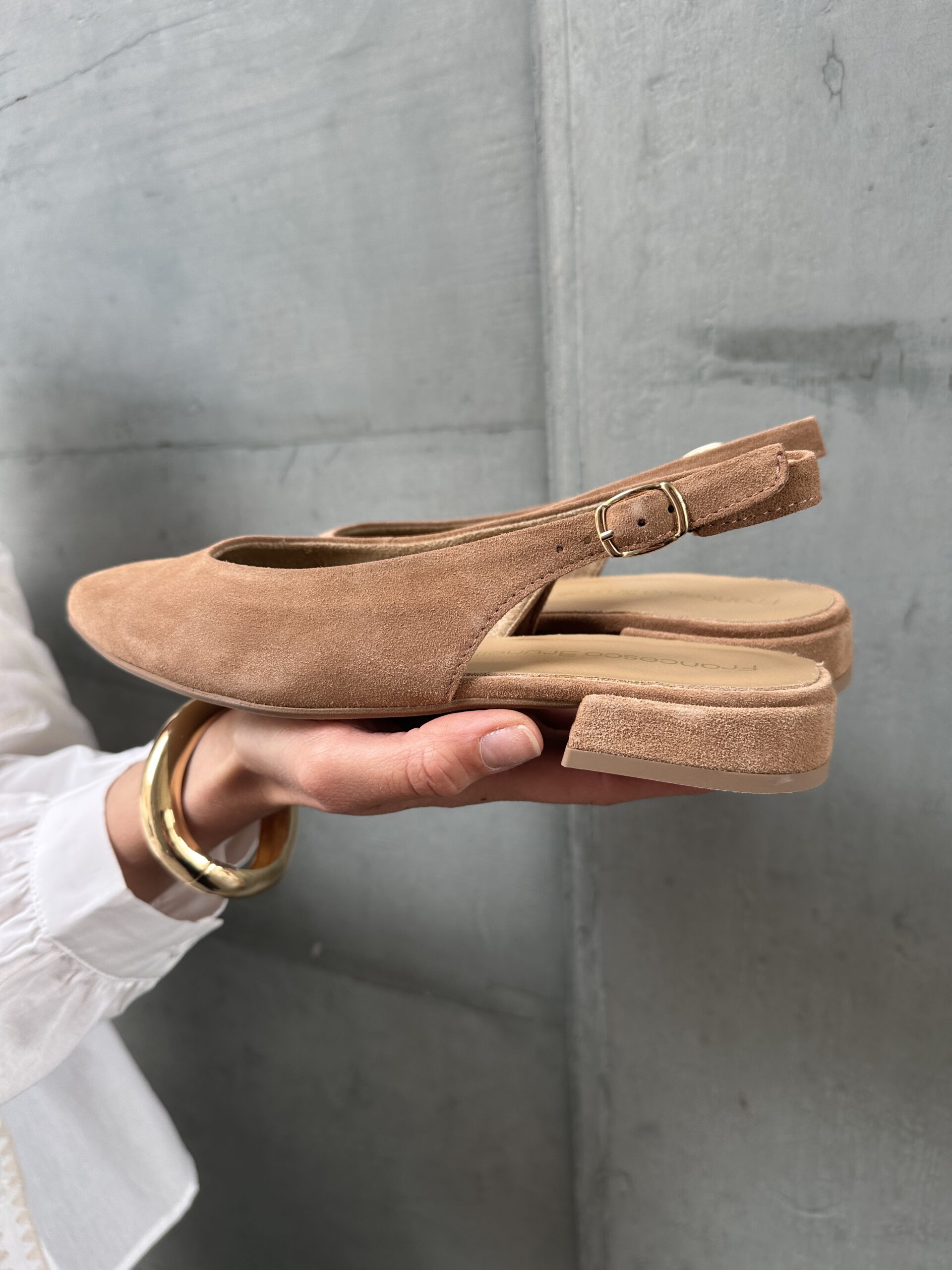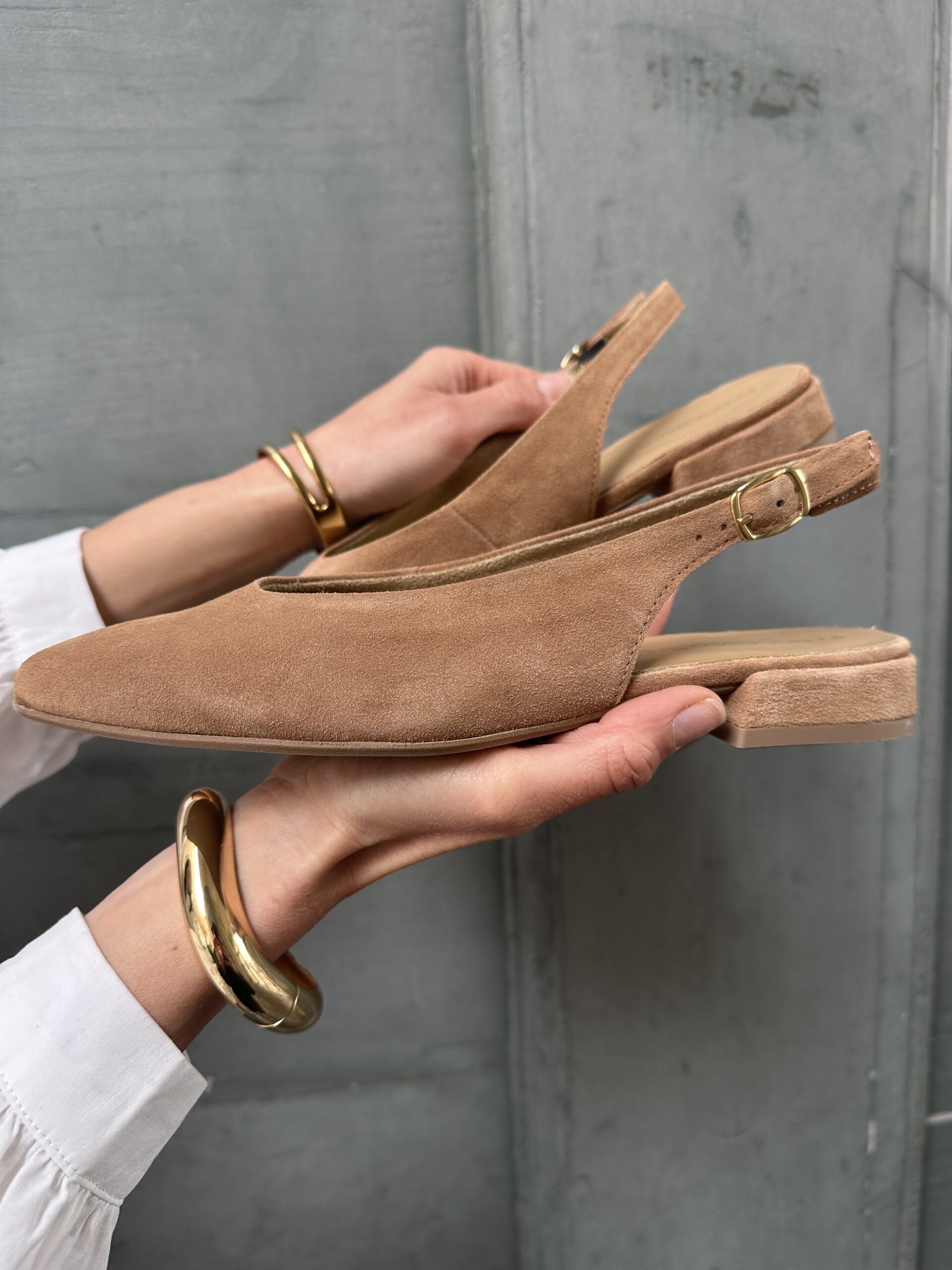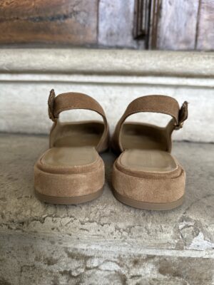 Slingback a punta in pelle scamosciata, laccio regolabile alla caviglia.