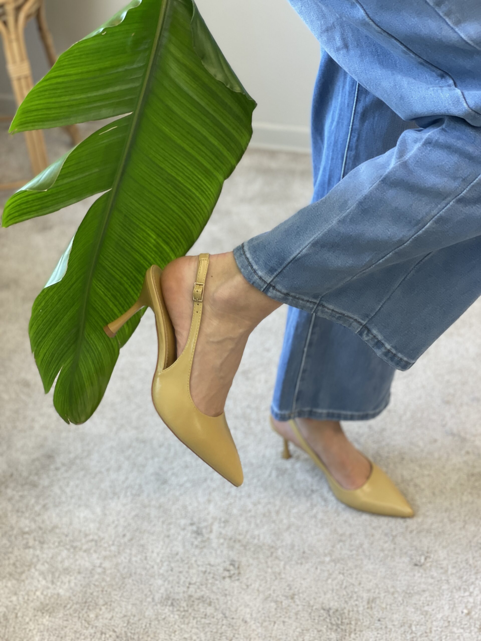 Slingback in ecopelle a punta con laccetto alla caviglia regolabile, sottopiede imbottito per un maggiore confort.