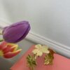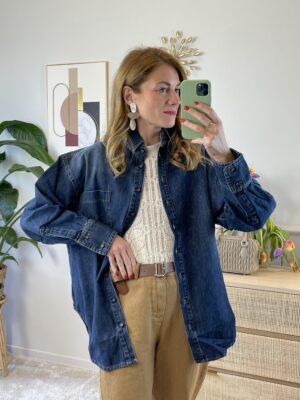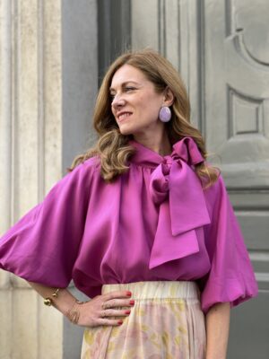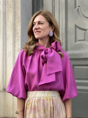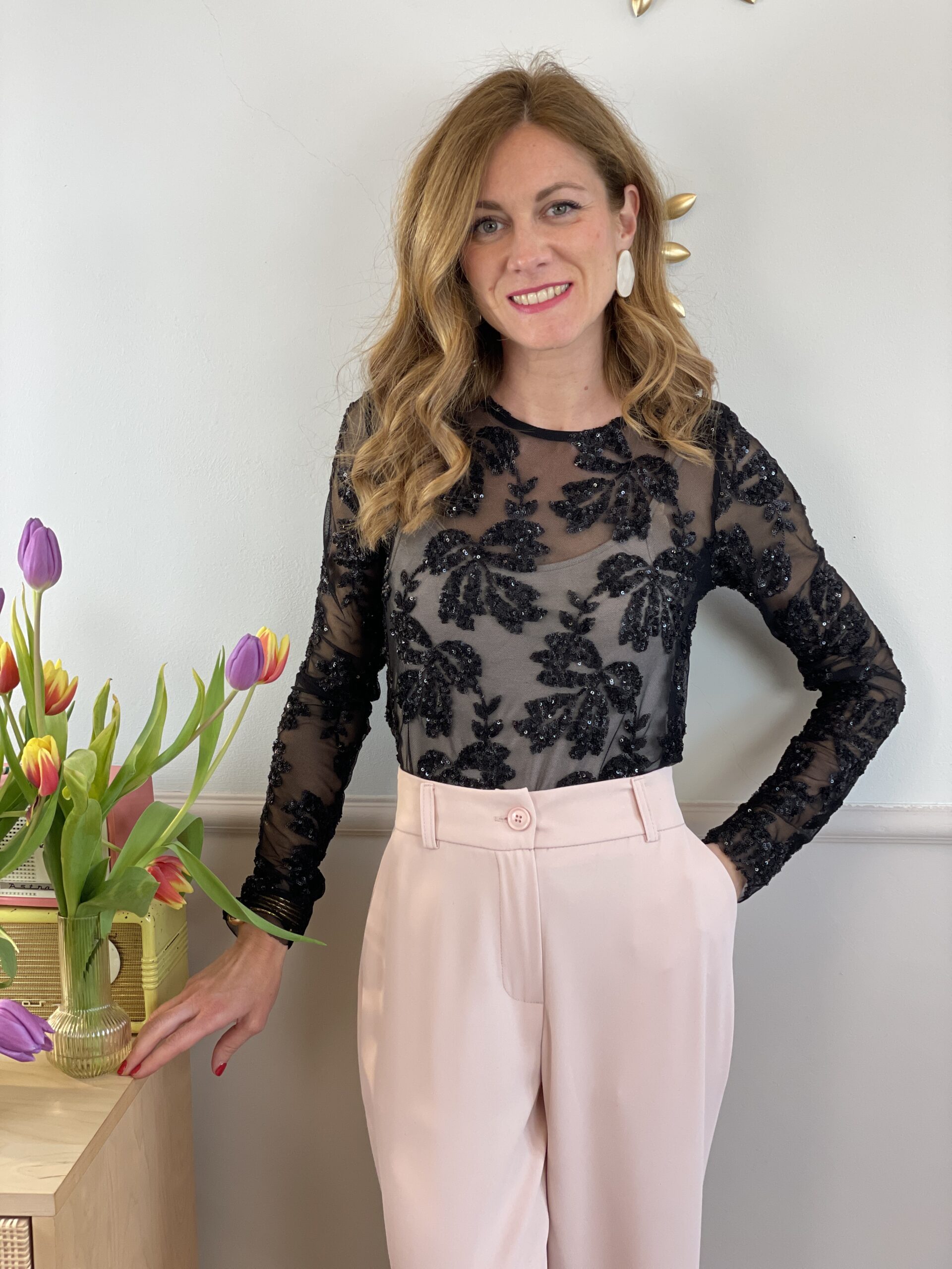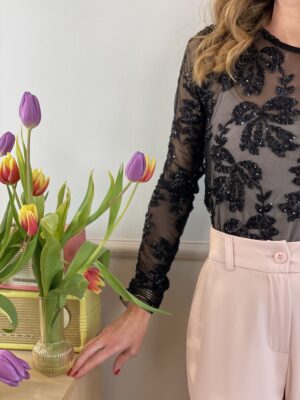 Maglia a manica lunga con fiocchi di paillette, girocollo con orli a taglio vivo.