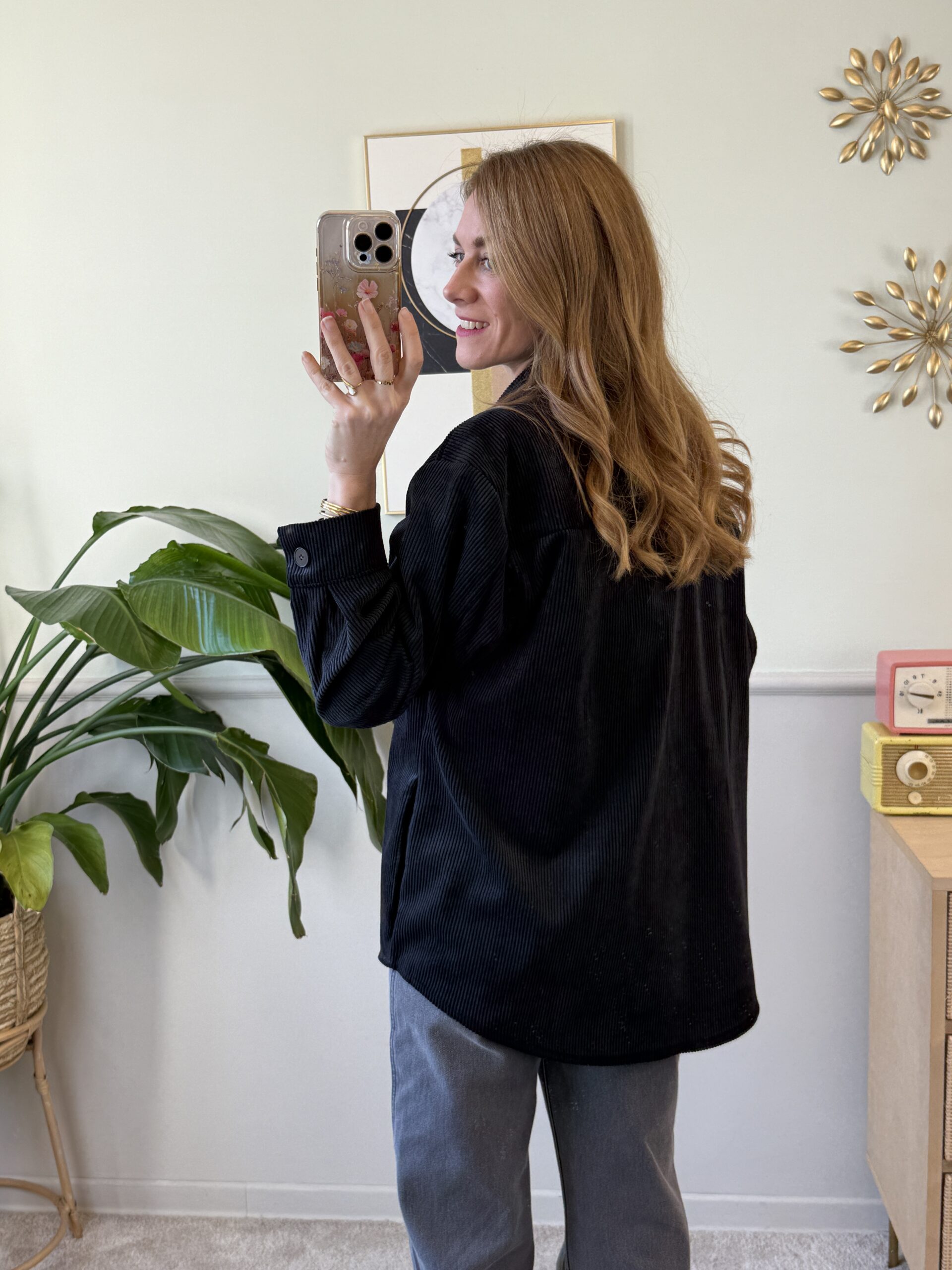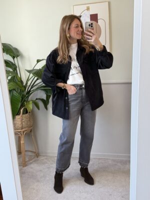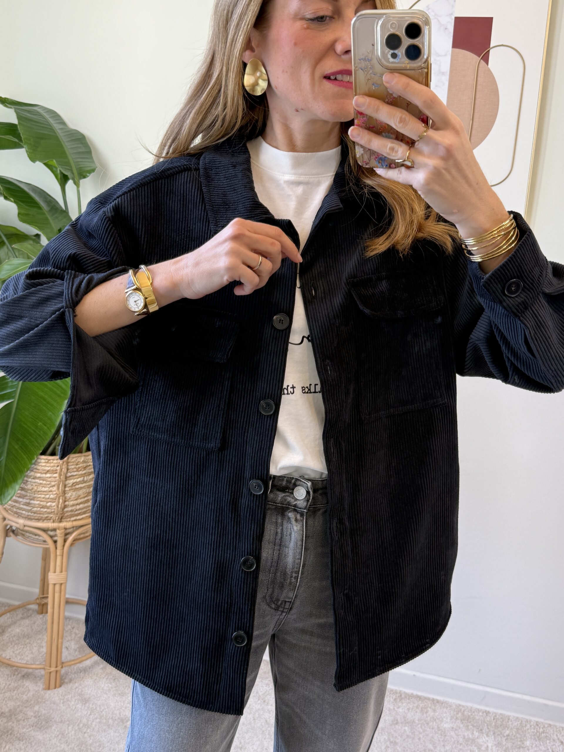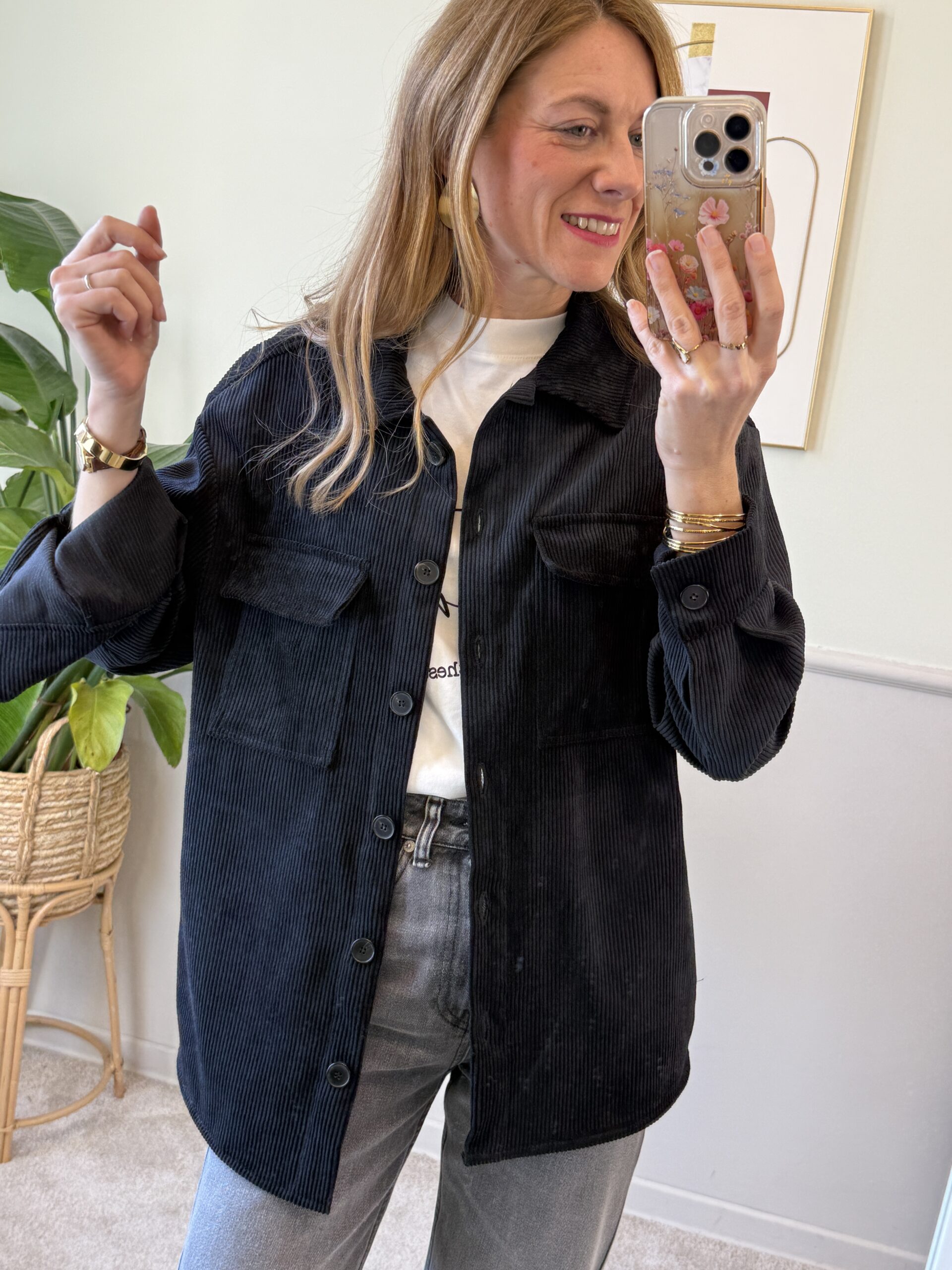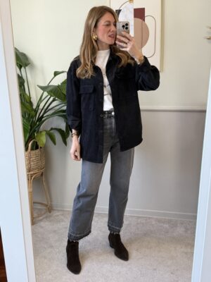 Sovracamicia in velluto con spalla scesa, tasche applicate sul davanti, bottoni neri e orlo arrotondato.