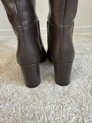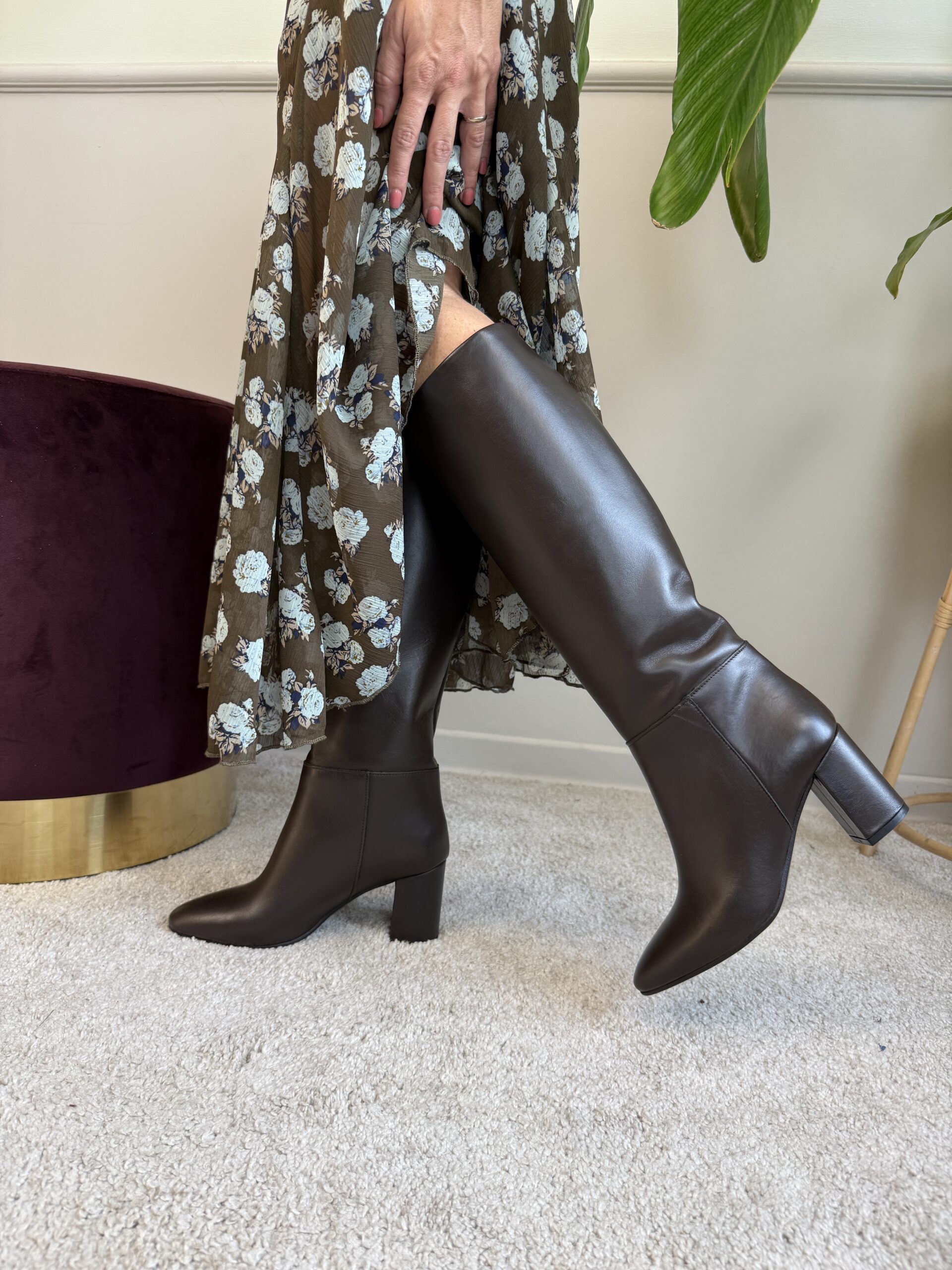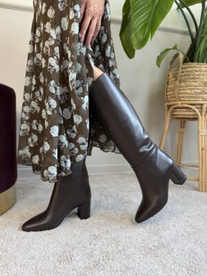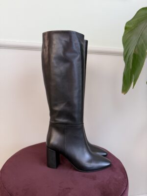 Stivali in morbida pelle a punta tonda con gamba a tubo e tacco grosso.