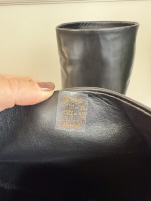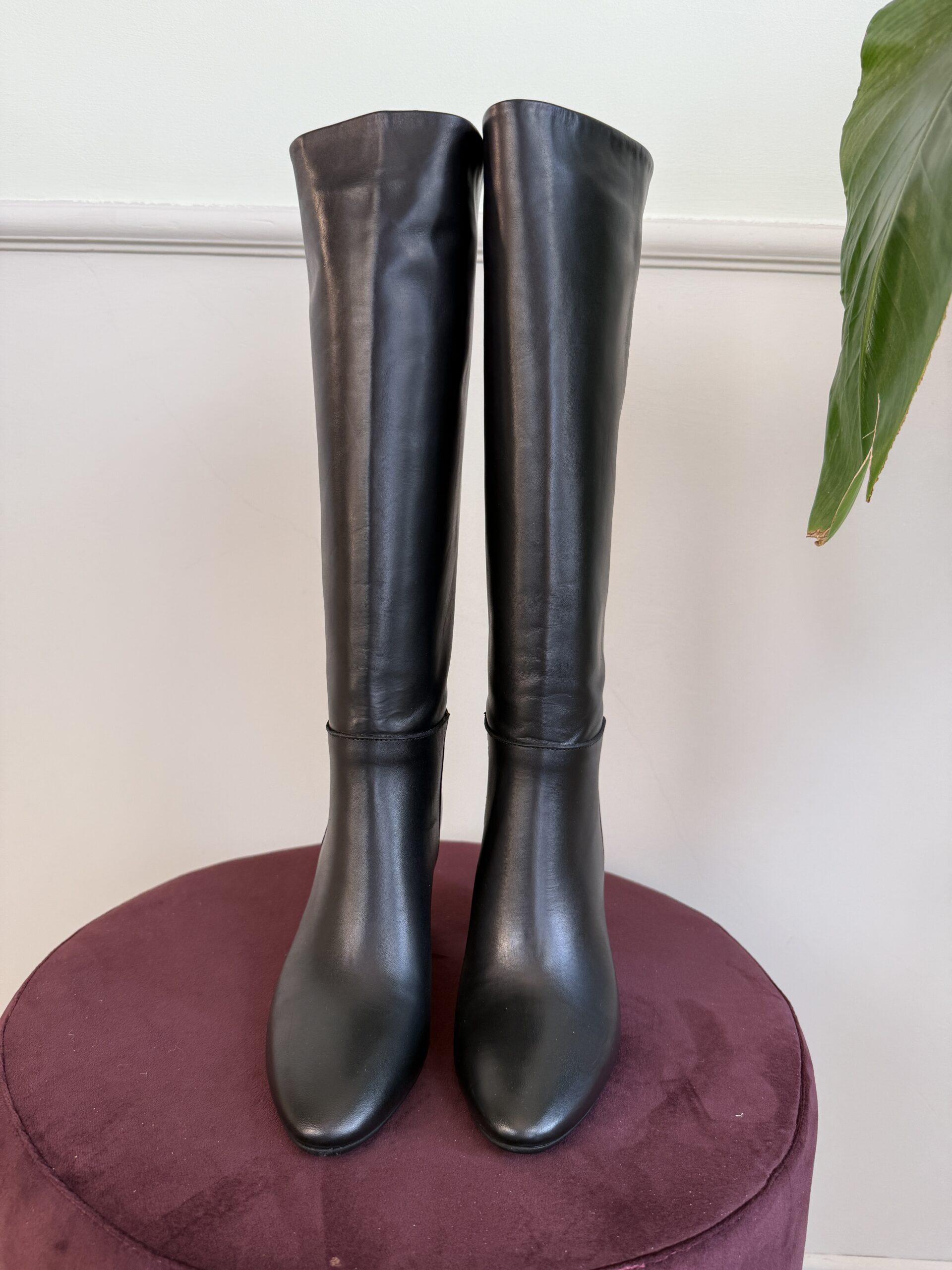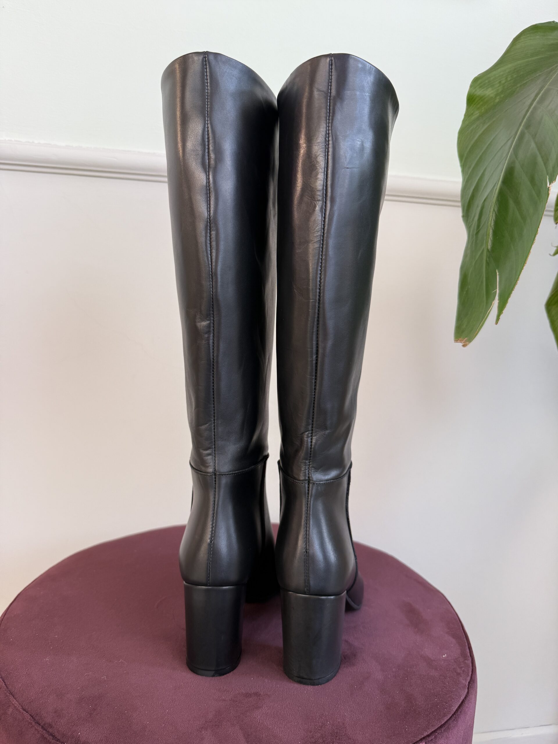 Stivali in morbida pelle a punta tonda con gamba a tubo e tacco grosso.