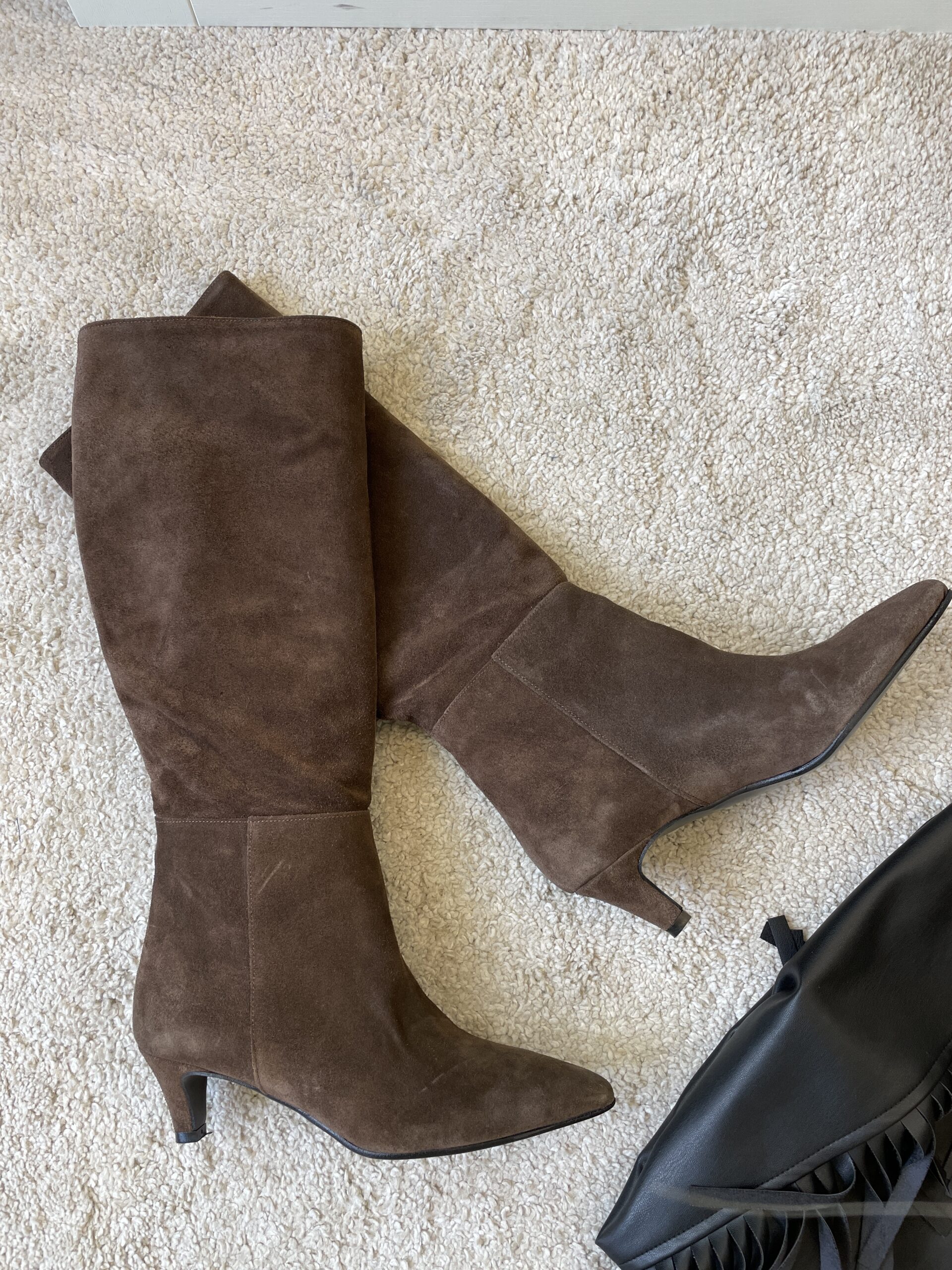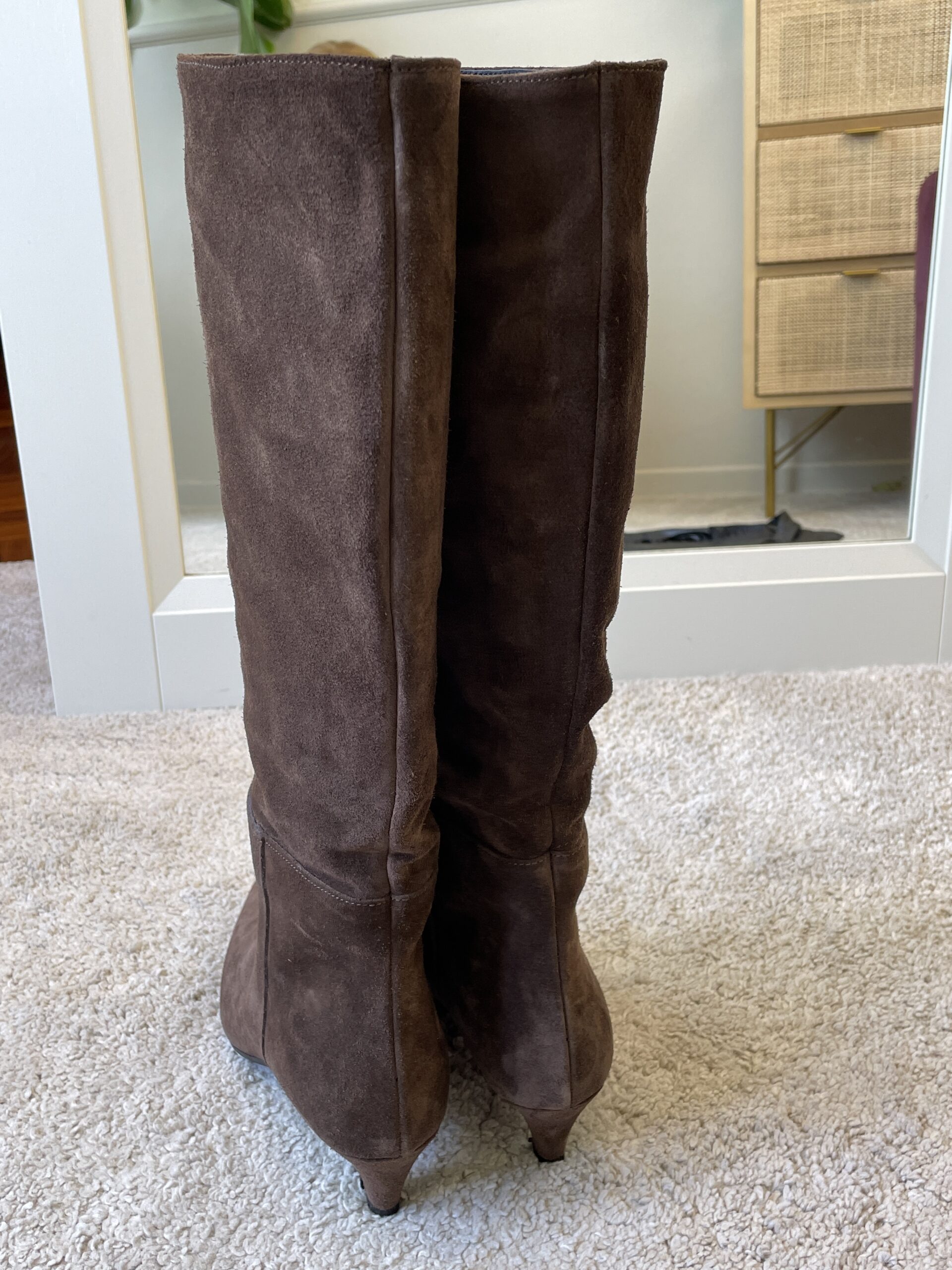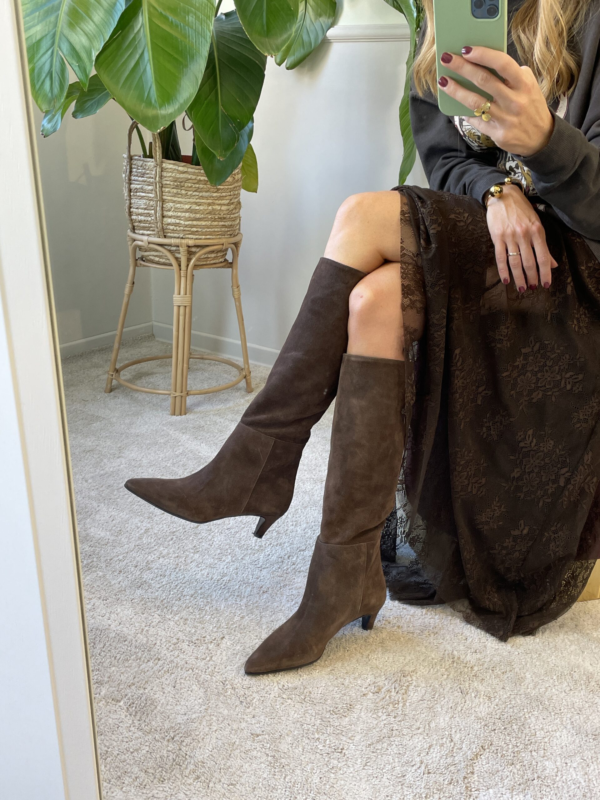 Stivali in morbida pelle scamosciata a punta con gamba a tubo e tacco Kitten.