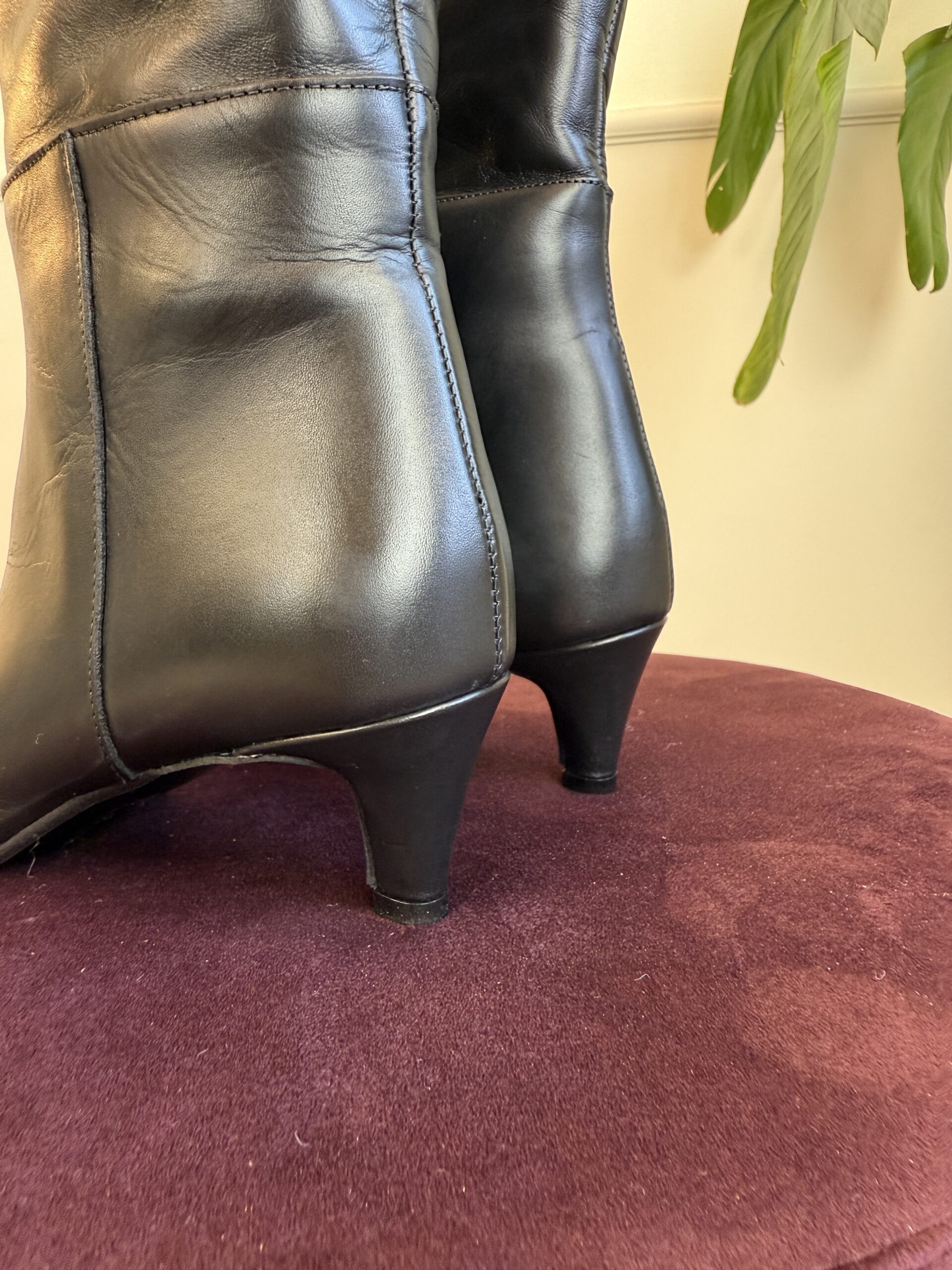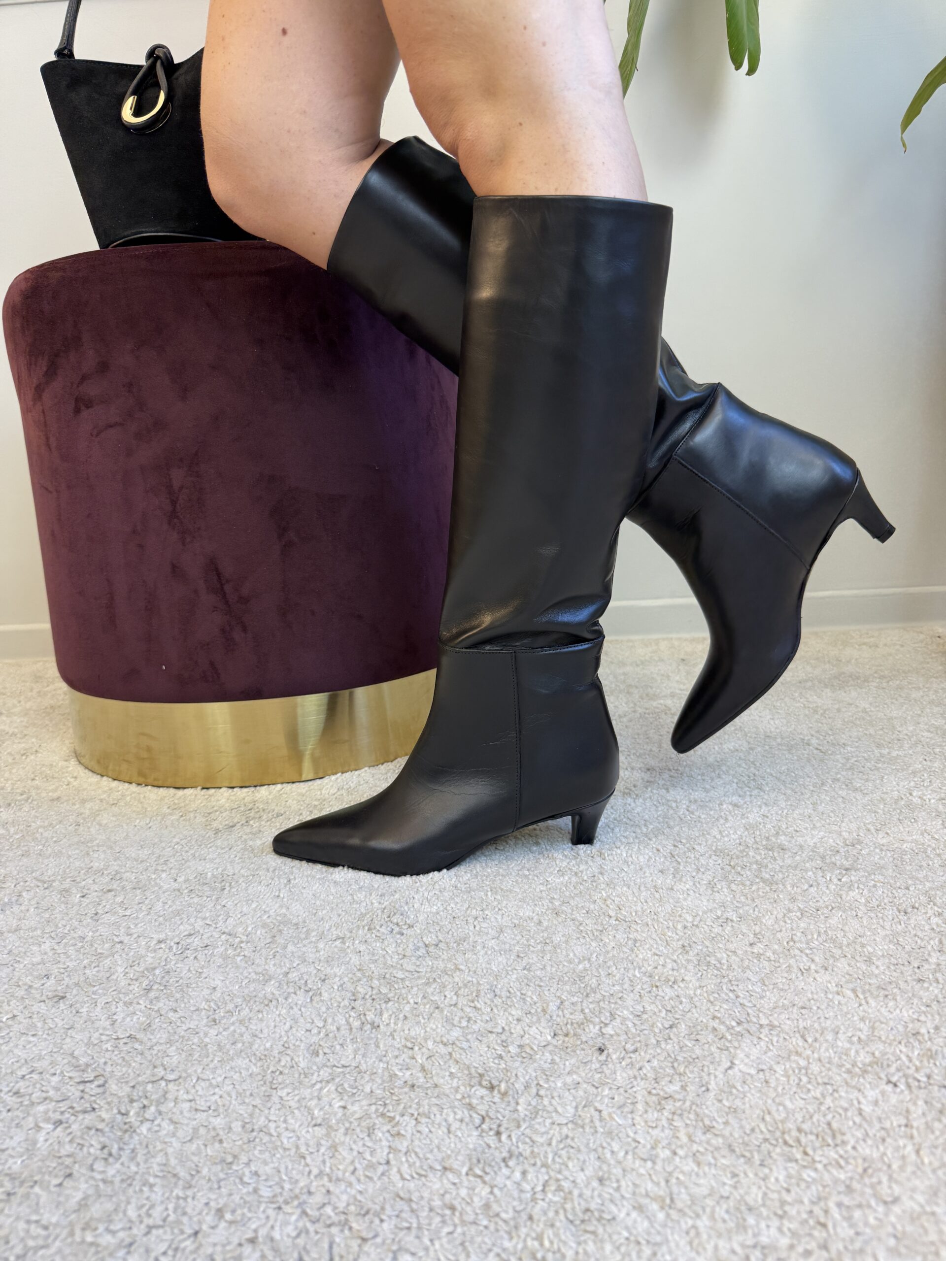 Stivali in morbida pelle a punta con gamba a tubo e tacco Kitten.