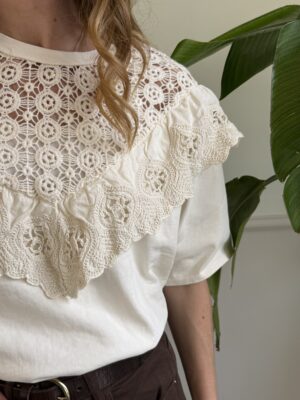 T-shirt modello over, con carrè crochet e balza.