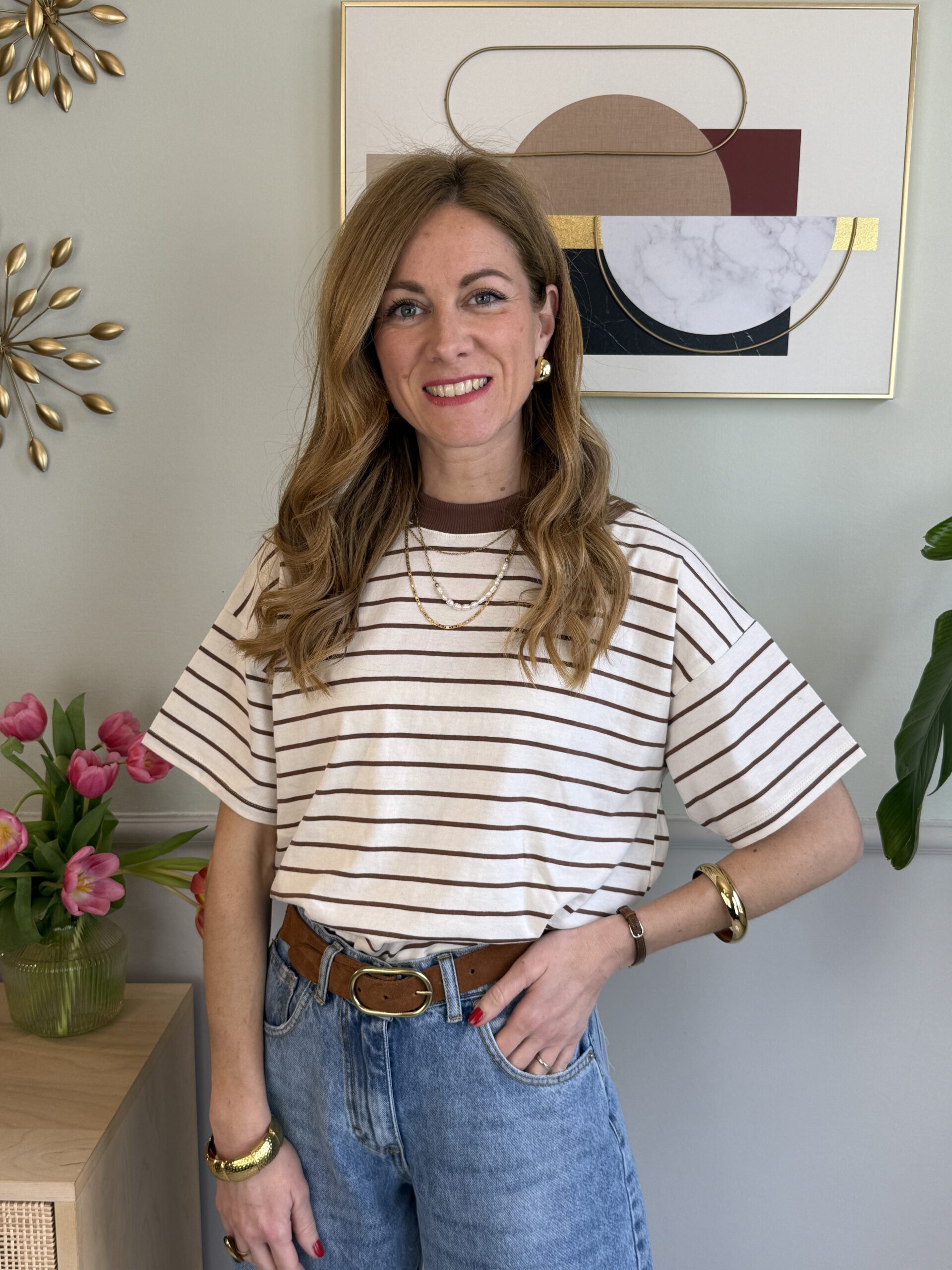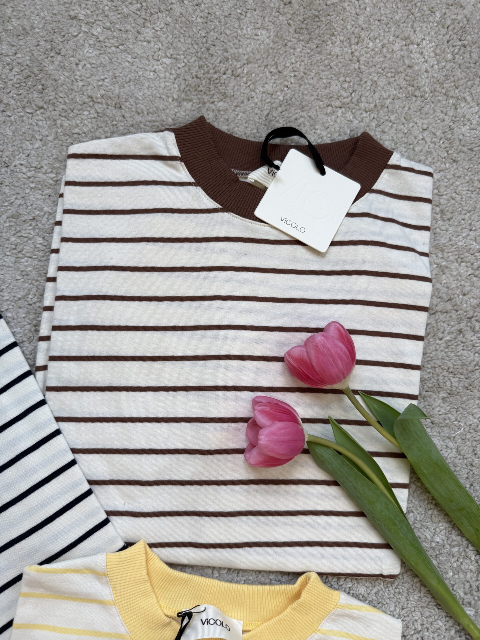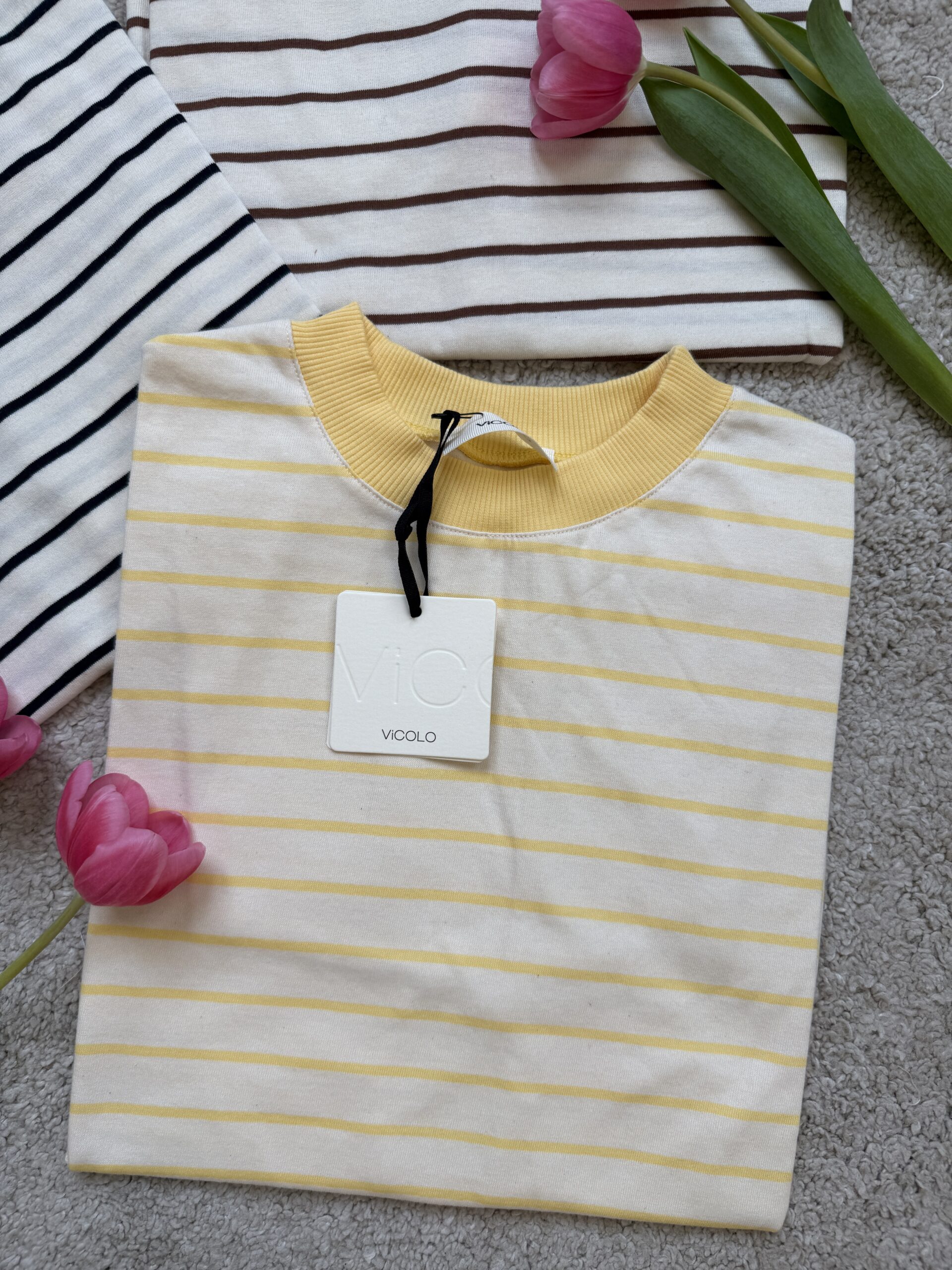 T-shirt modello over, rigata, con il dettaglio del collo che richiama il colore della riga.