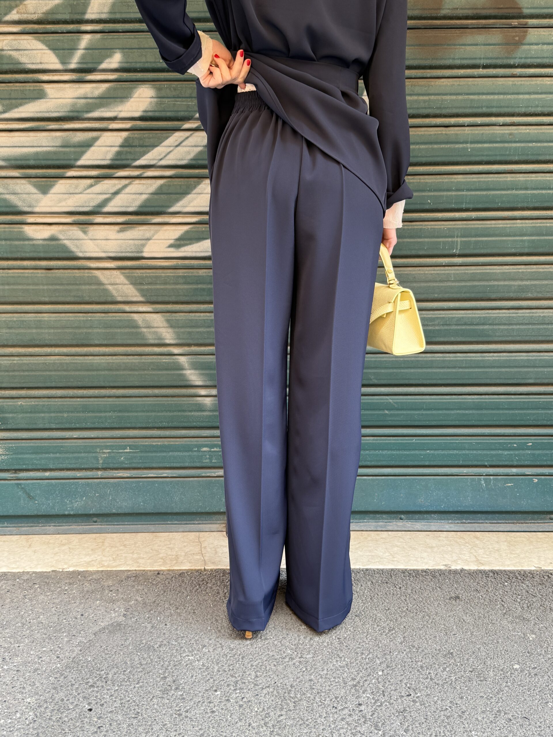 -Pantalone a palazzo in tessuto fluido, vita alta con elastico posteriore e tasche alla francese.